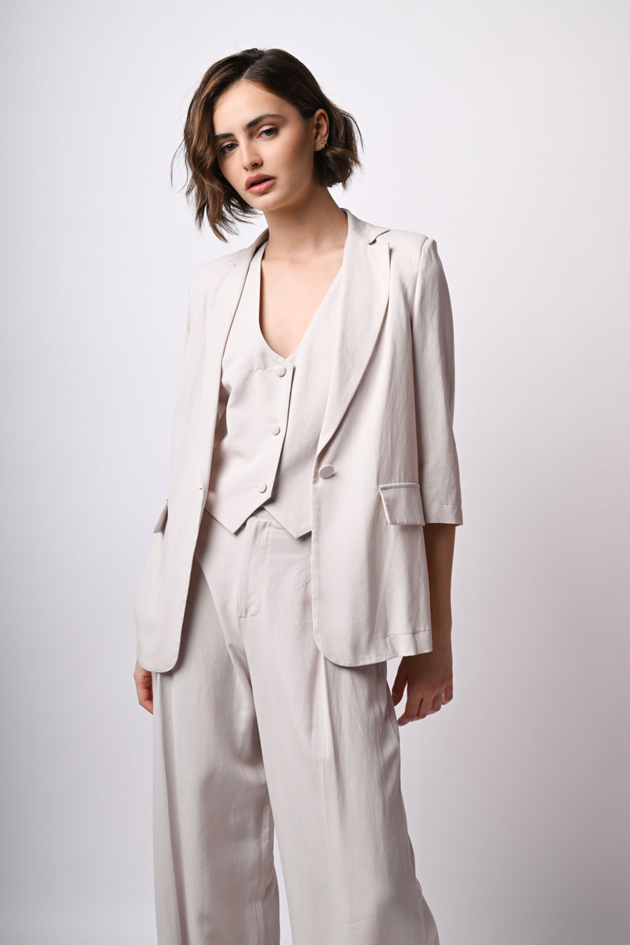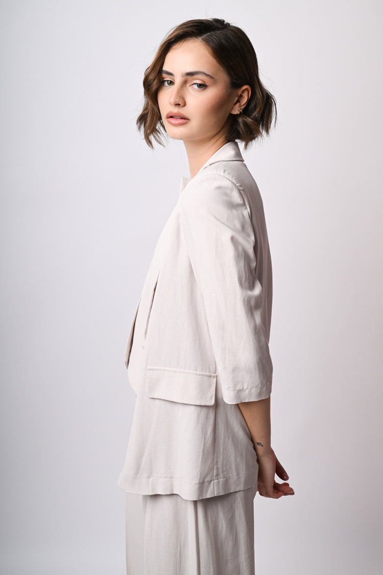 Blazer monopetto misto viscosa e lino nuance avorio con revers classici, un bottone di chiusura ricoperto in tessuto, tasche frontali con risvolto e maniche tre quarti.
