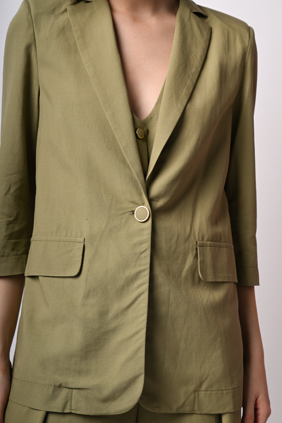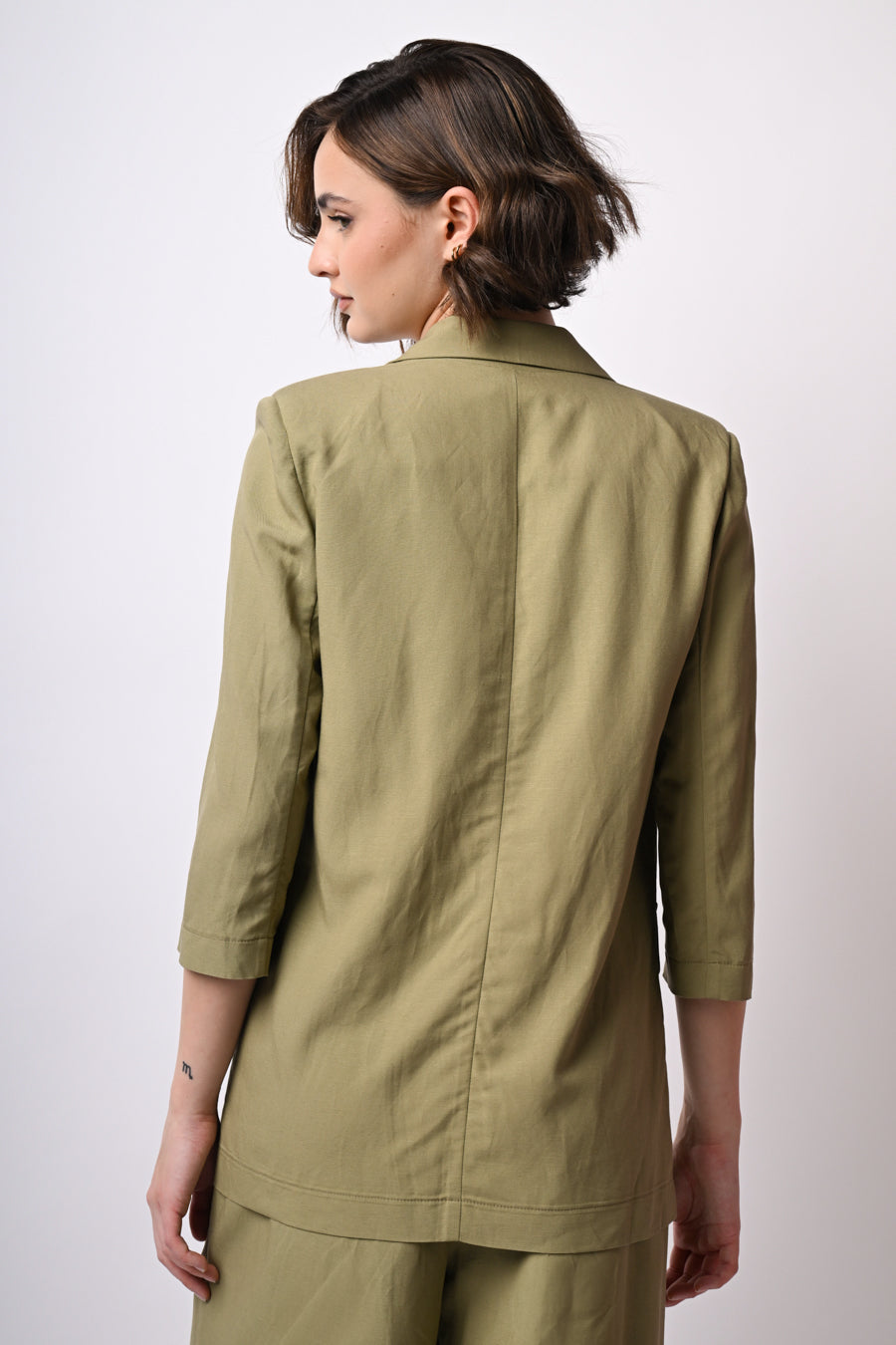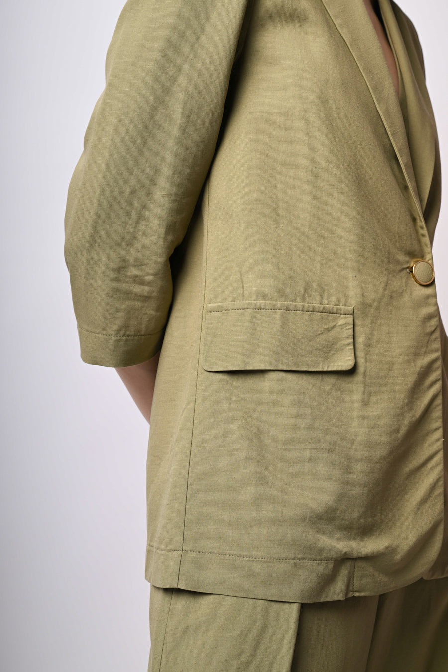 Blazer monopetto misto viscosa e lino verde oliva con revers classici, un bottone di chiusura ricoperto in tessuto, tasche frontali con risvolto e maniche tre quarti.