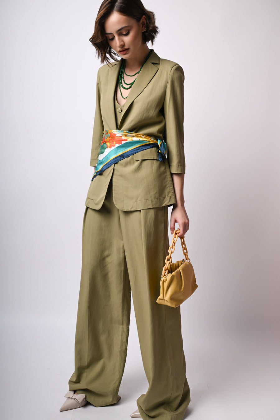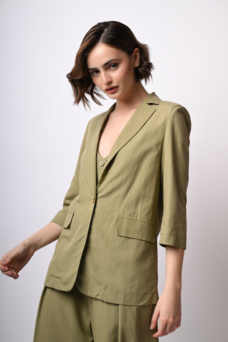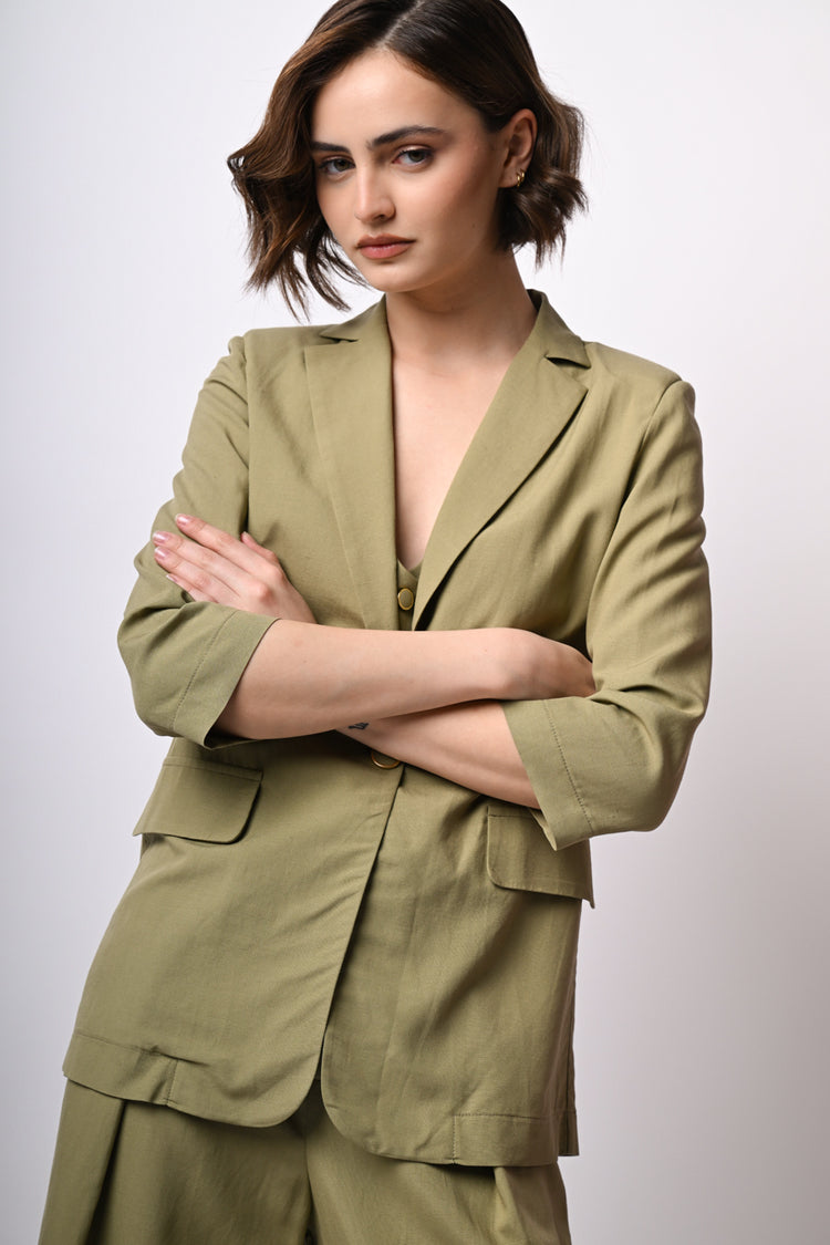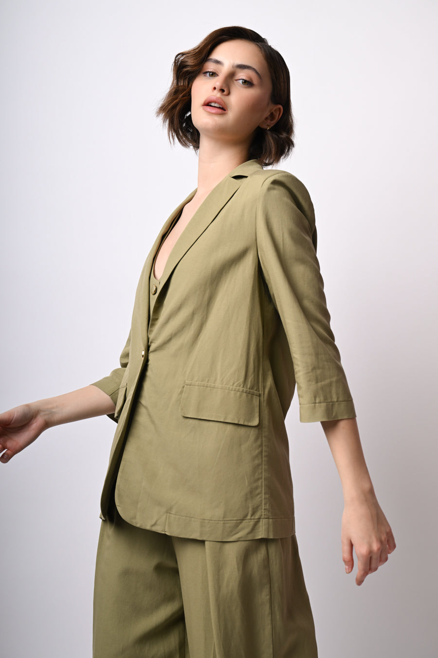 Blazer monopetto misto viscosa e lino verde oliva con revers classici, un bottone di chiusura ricoperto in tessuto, tasche frontali con risvolto e maniche tre quarti.