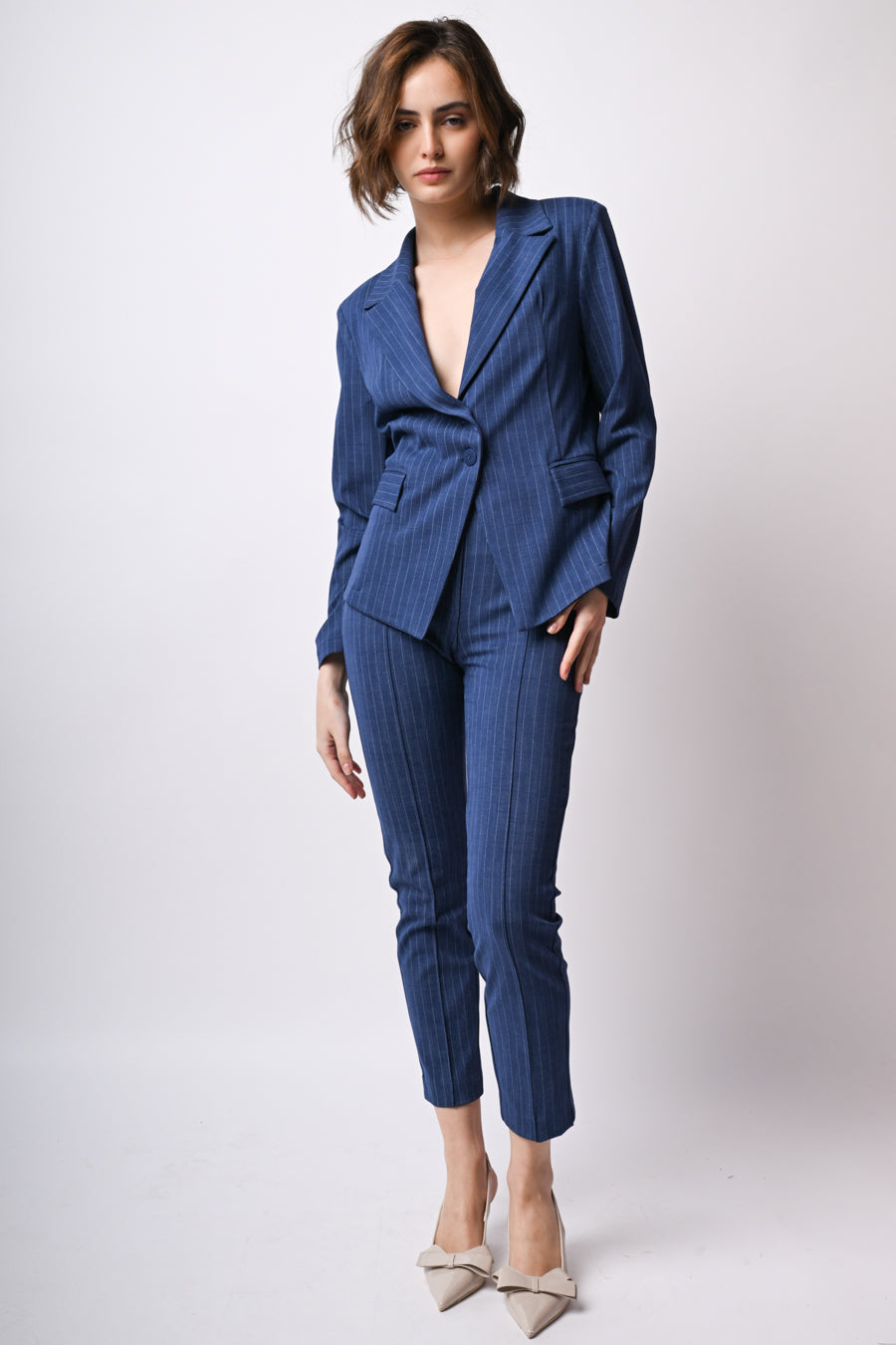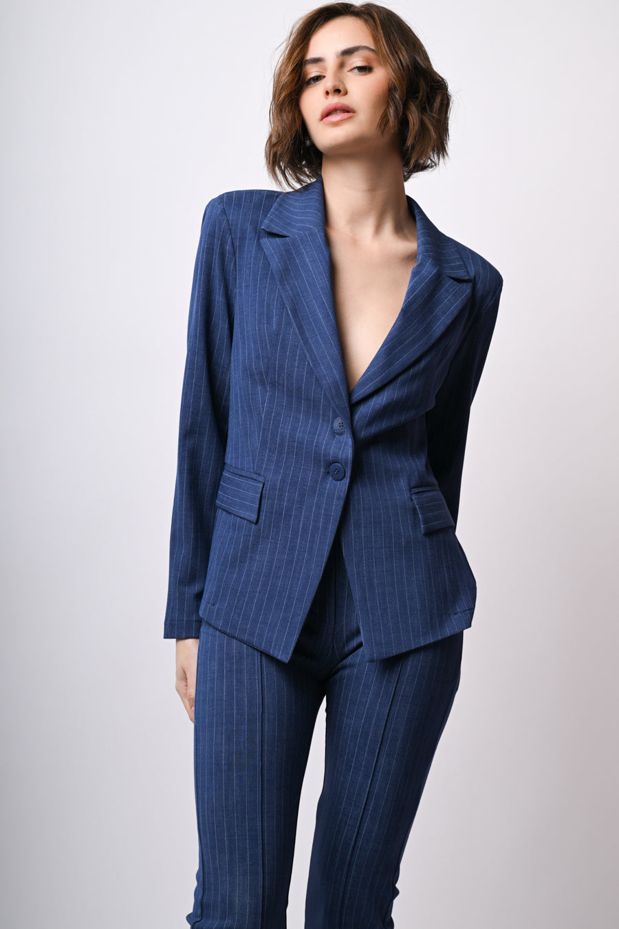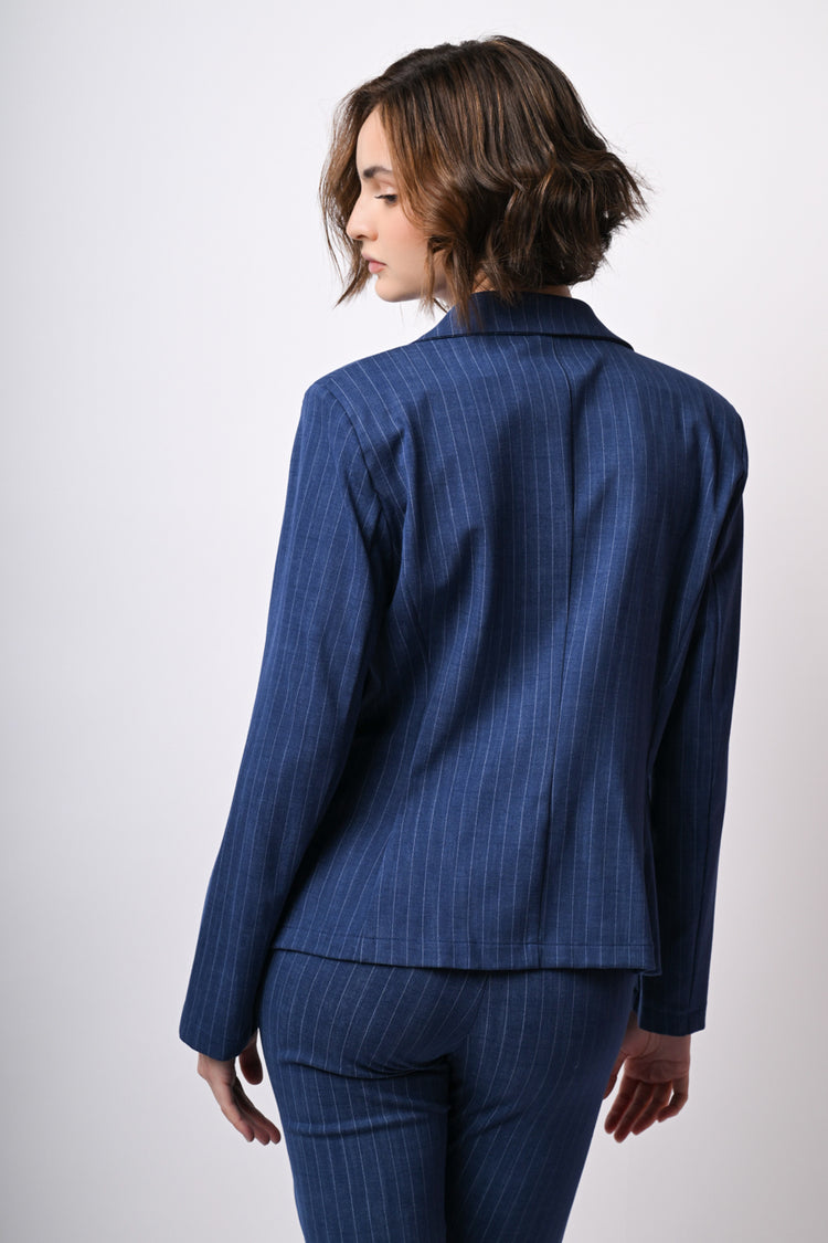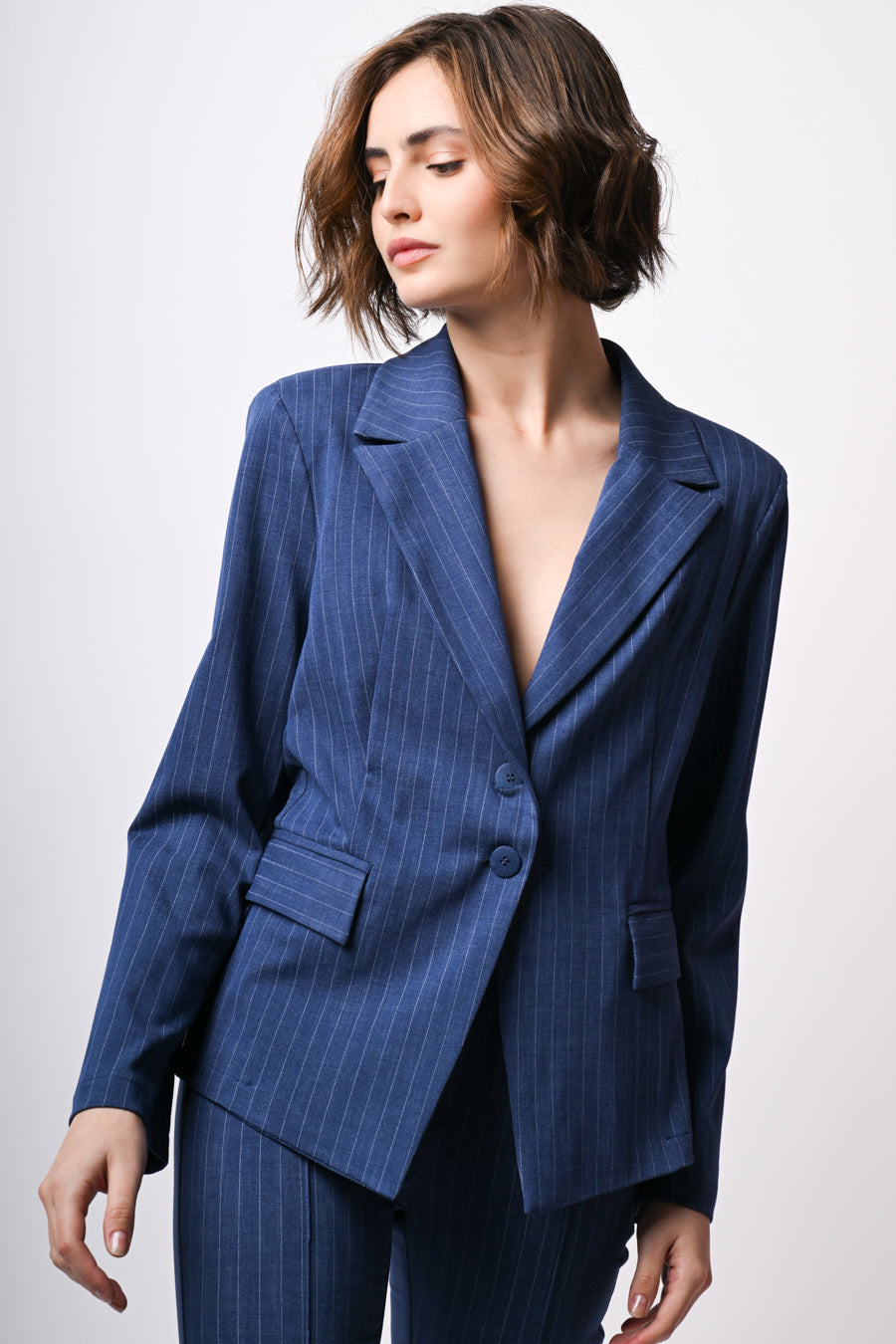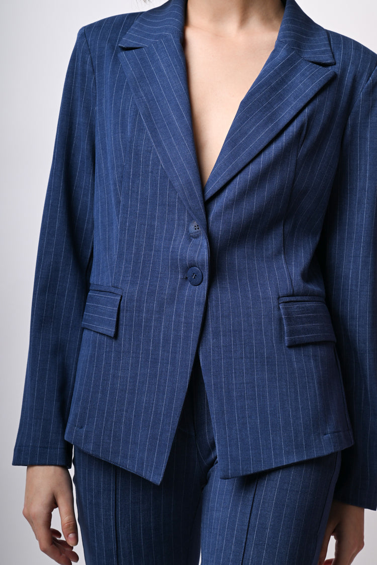 Blazer monopetto in misto viscosa stretch blu gessato bianco con revers classici, due bottoni di chiusura e tasche frontali con risvolto.