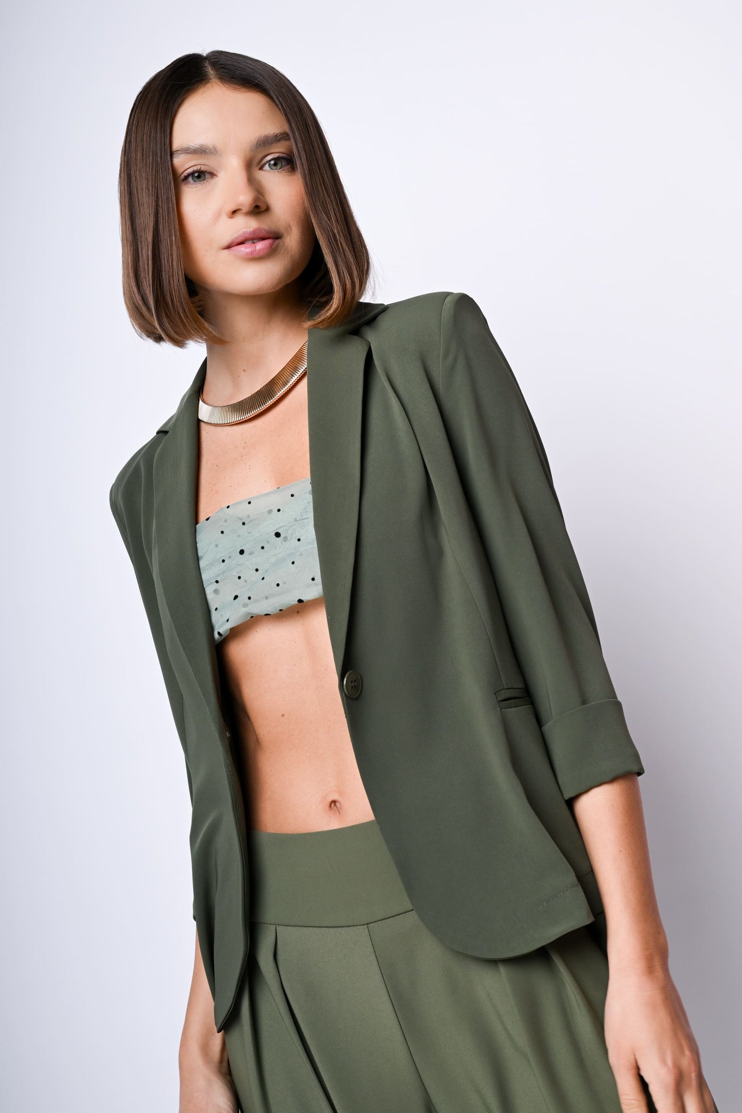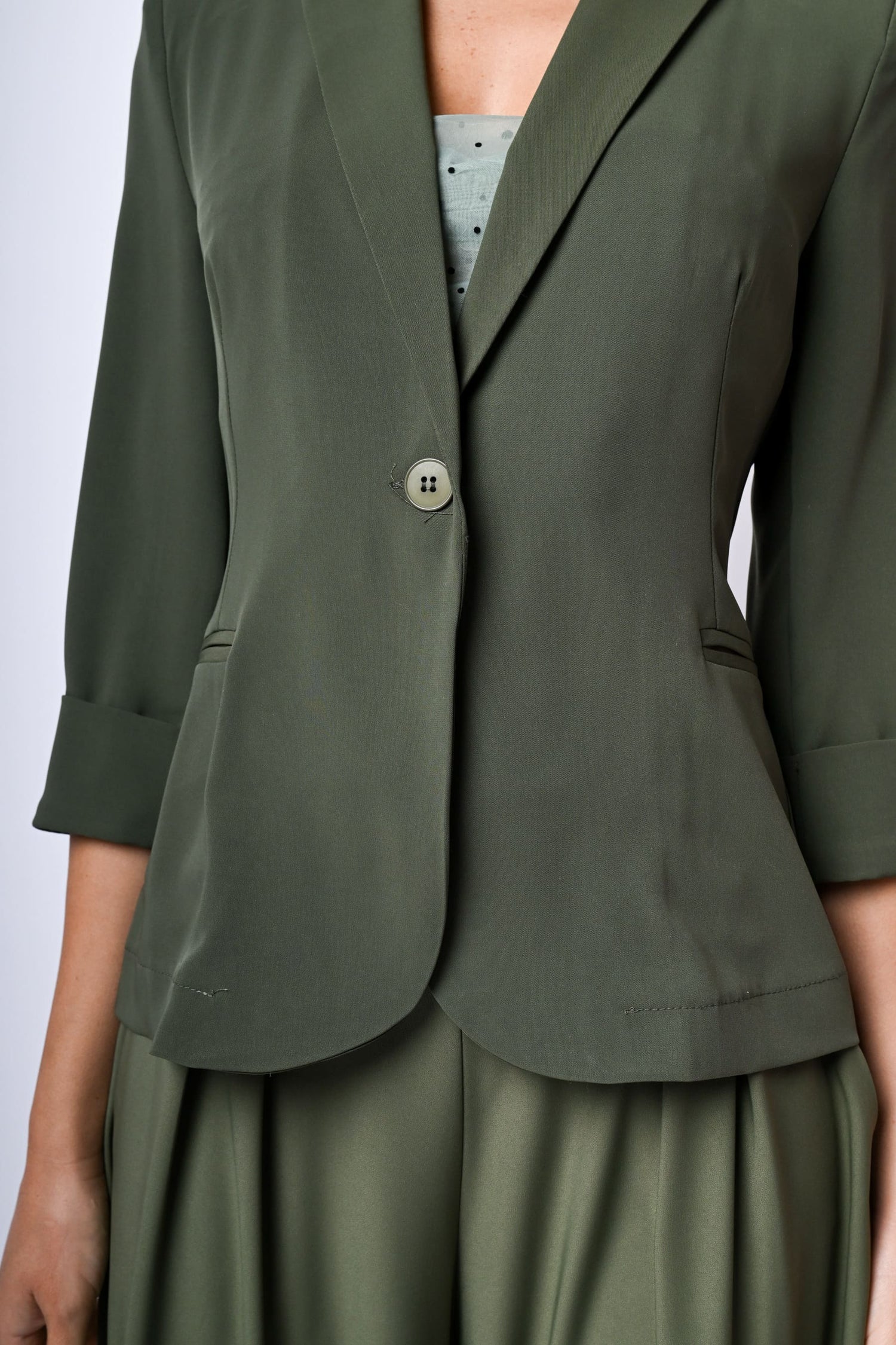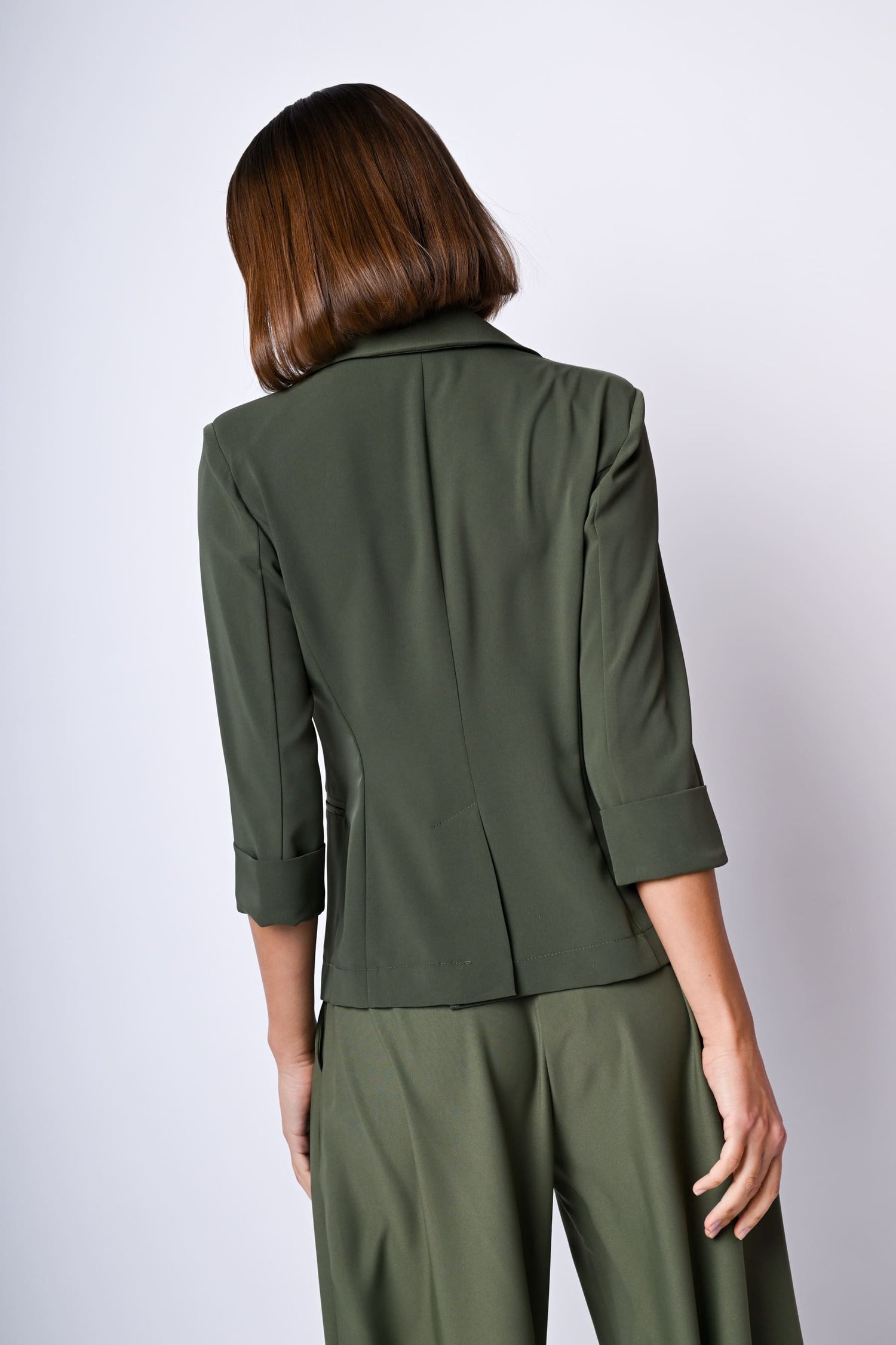 Blazer monopetto in tessuto stretch verde oliva con revers classici, maniche tre quarti con risvolto, un bottone di chiusura, tasche frontali a filetto e spacco al centro dietro.