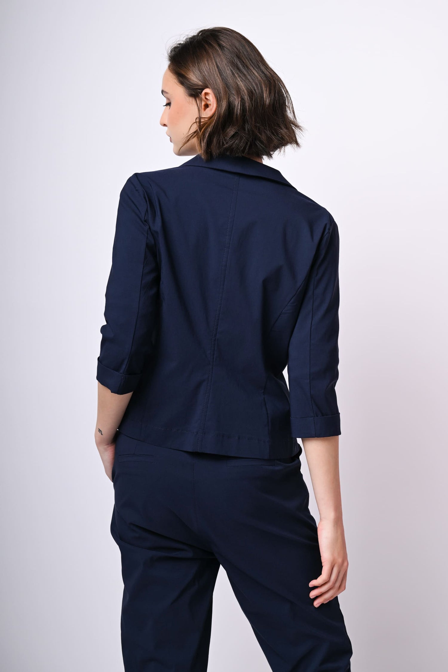 Blazer monopetto misto viscosa stretch blu con revers classici, un bottone di chiusura, tasche frontali a filetto e maniche tre quarti.