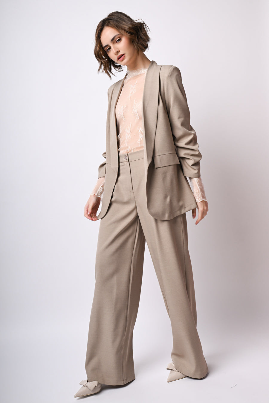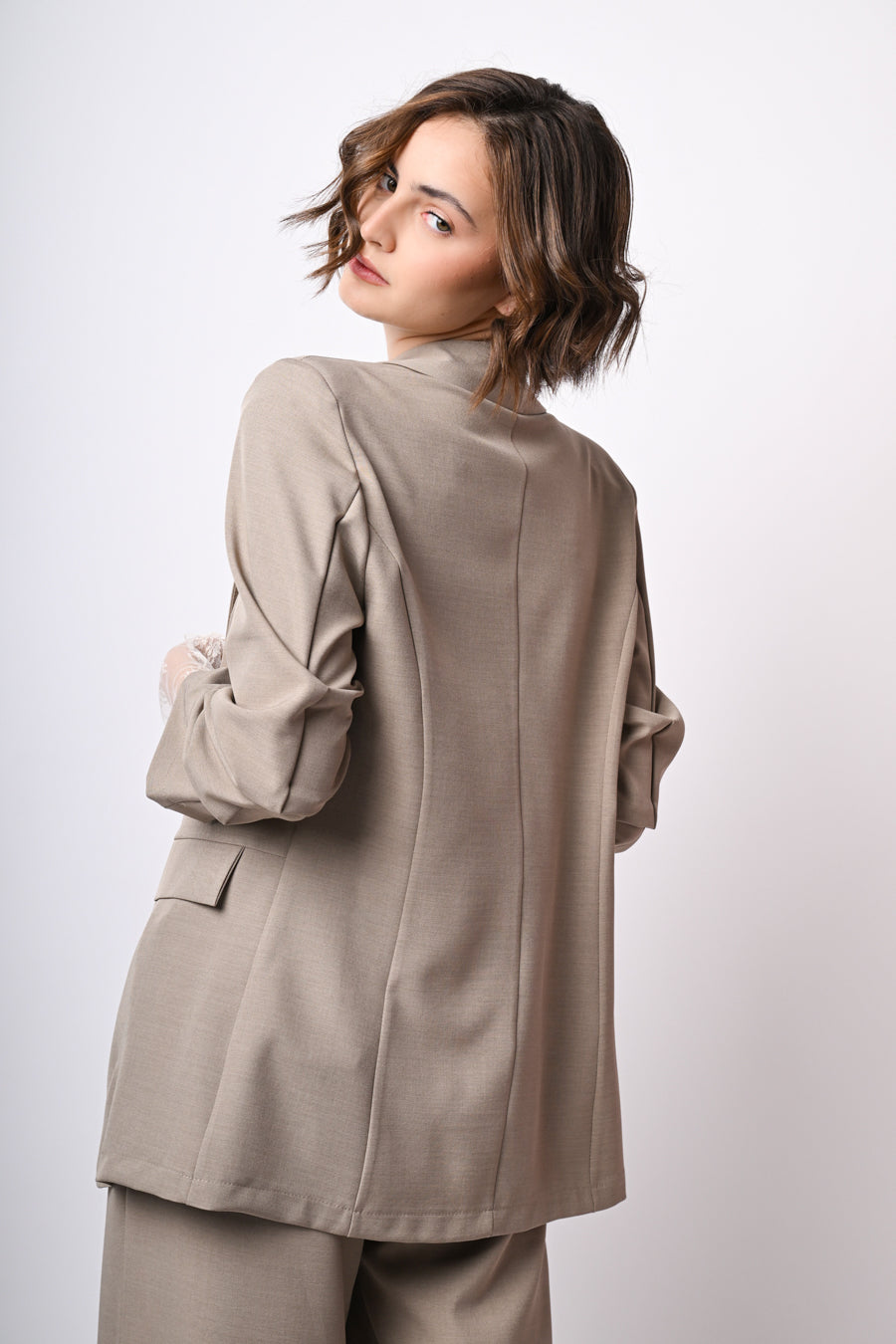 Blazer stile smoking in tessuto stretch beige con revers a scialle, nessuna chiusura, tasche frontali con risvolto e maniche crop con arricciature.