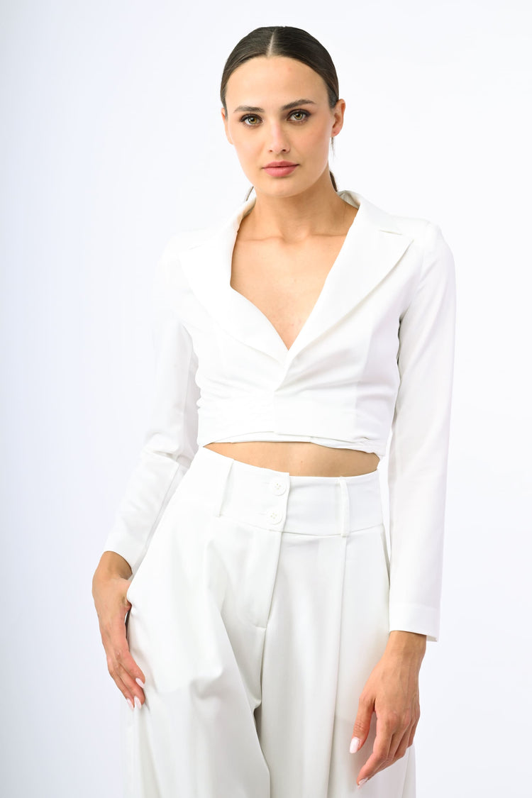 Blazer crop in misto viscosa stretch bianco con revers dentellati, scollo a cuore, fasce da annodare alla vita sul retro e silhouette aderente.