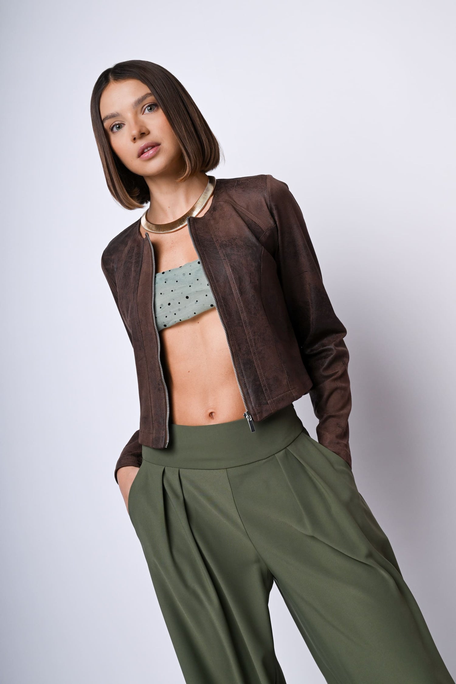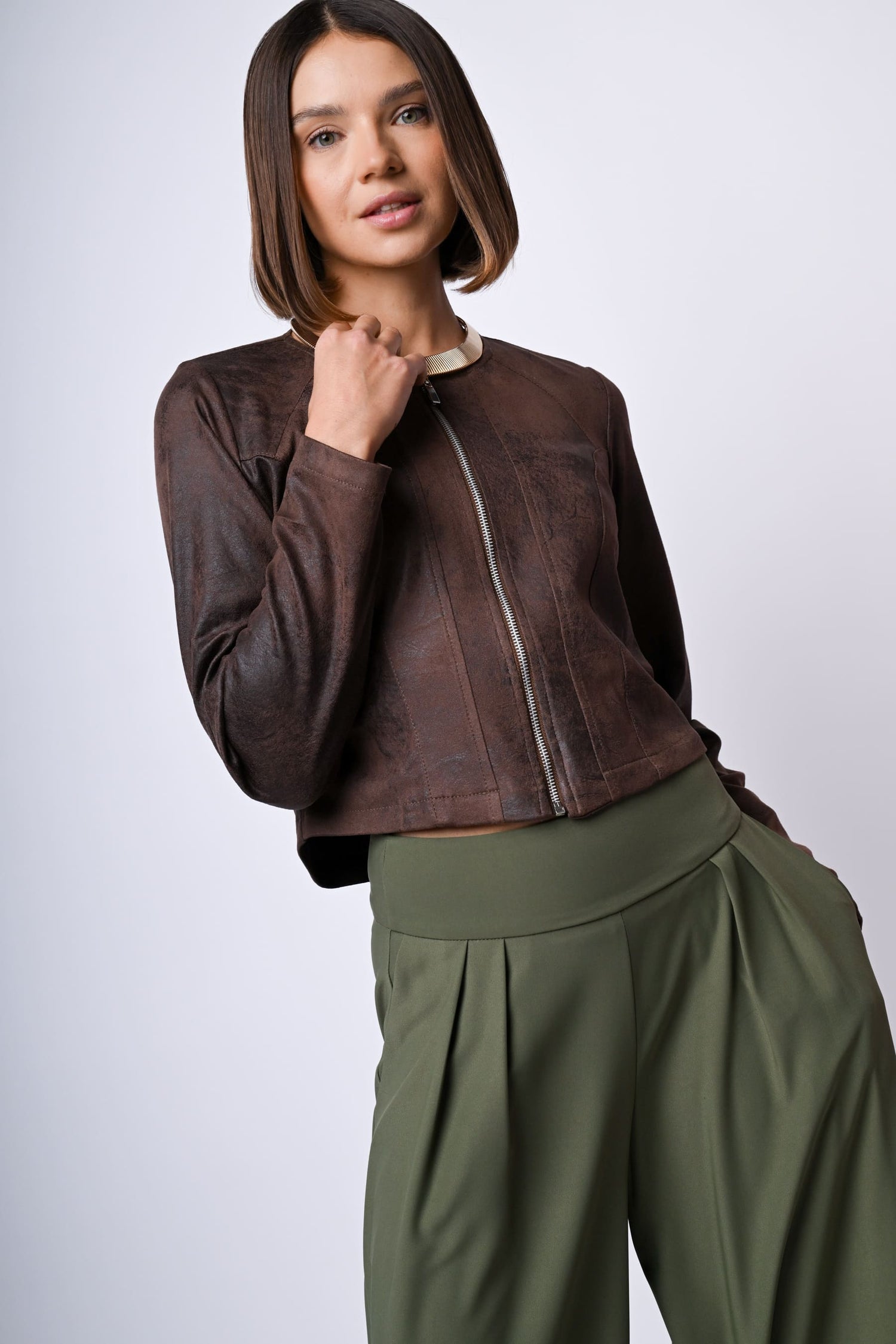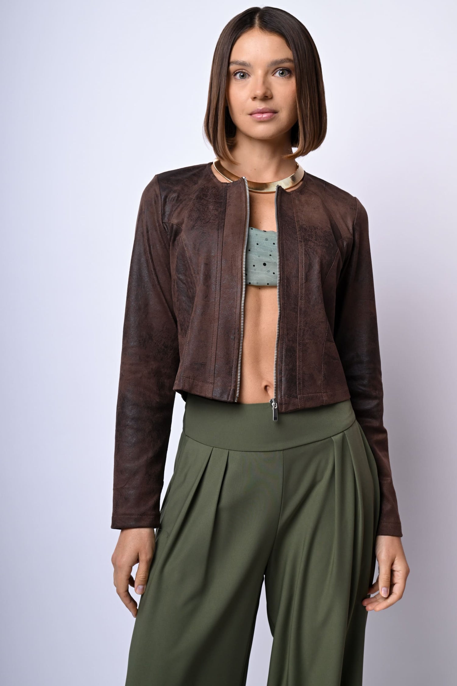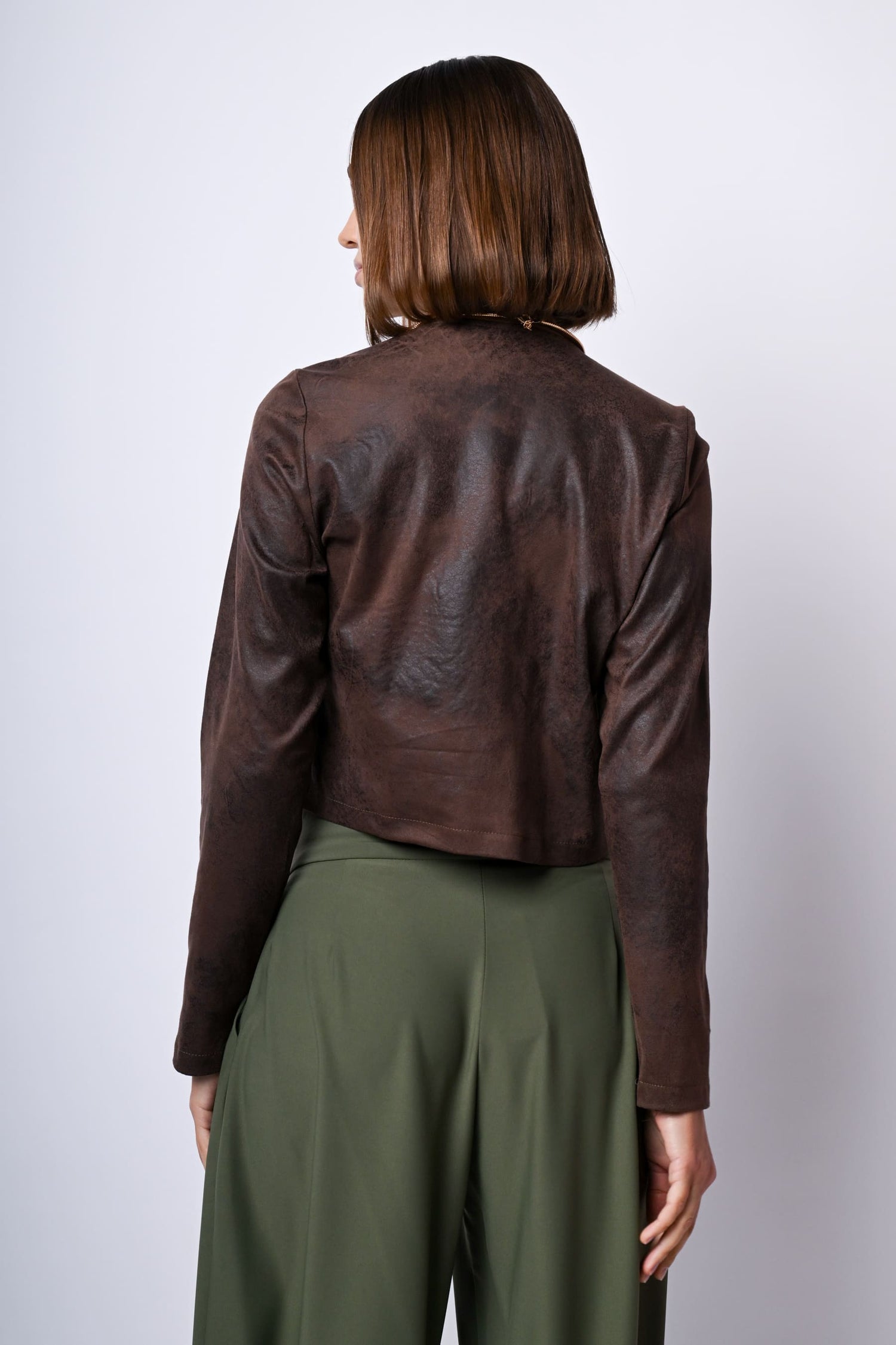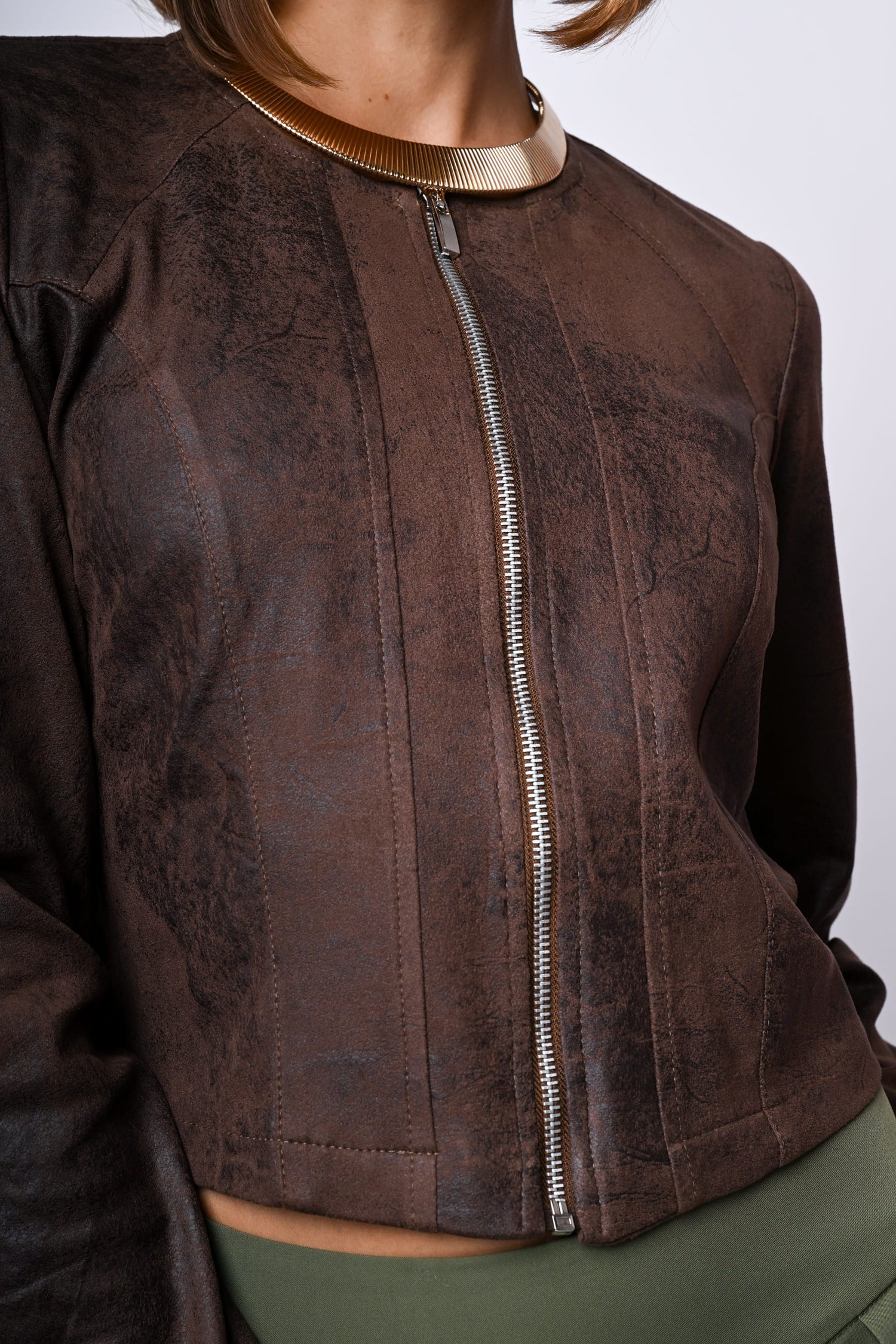 Bomber in similpelle marrone effetto vintage con scollo tondo, zip frontale di chiusura e silhouette aderente.