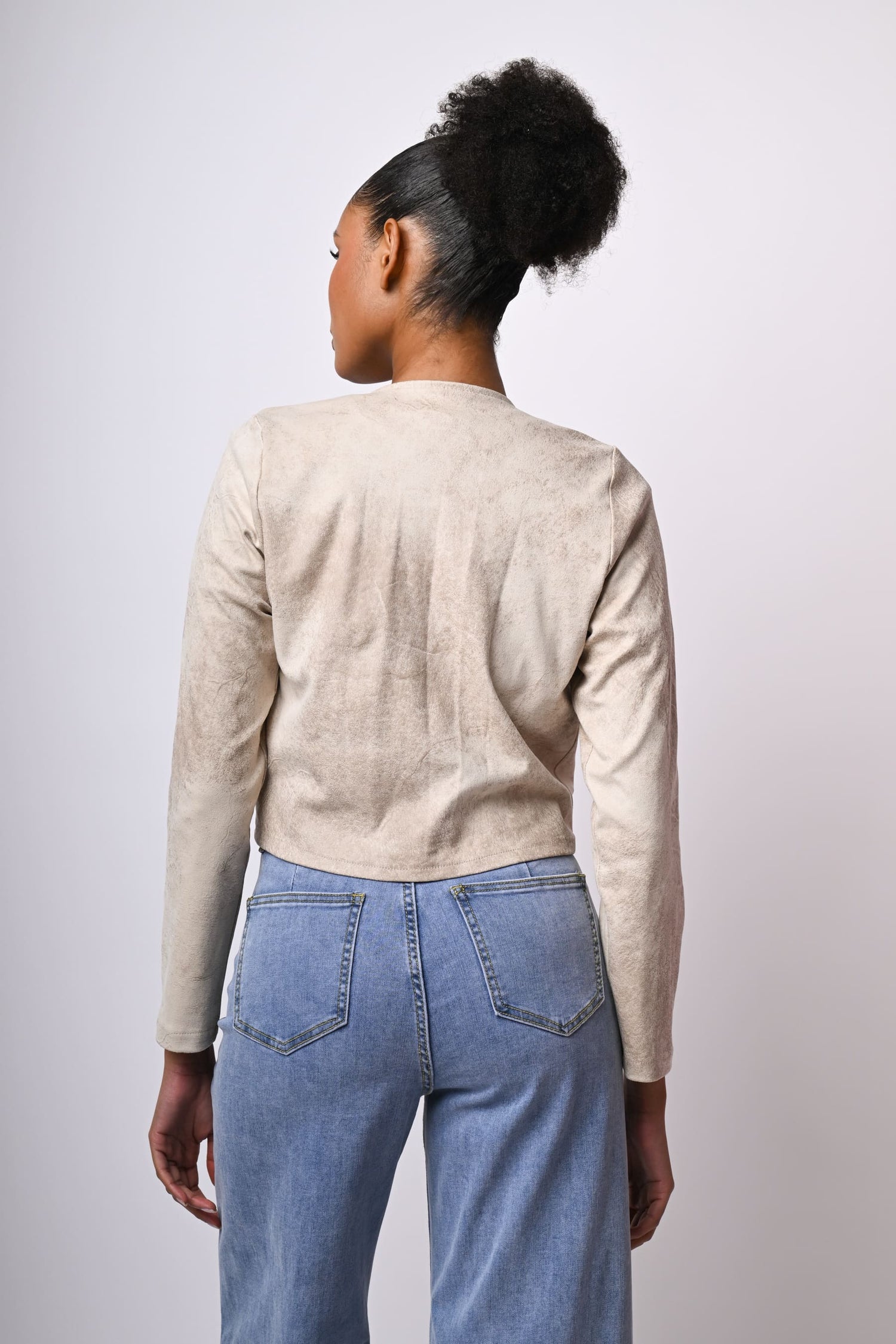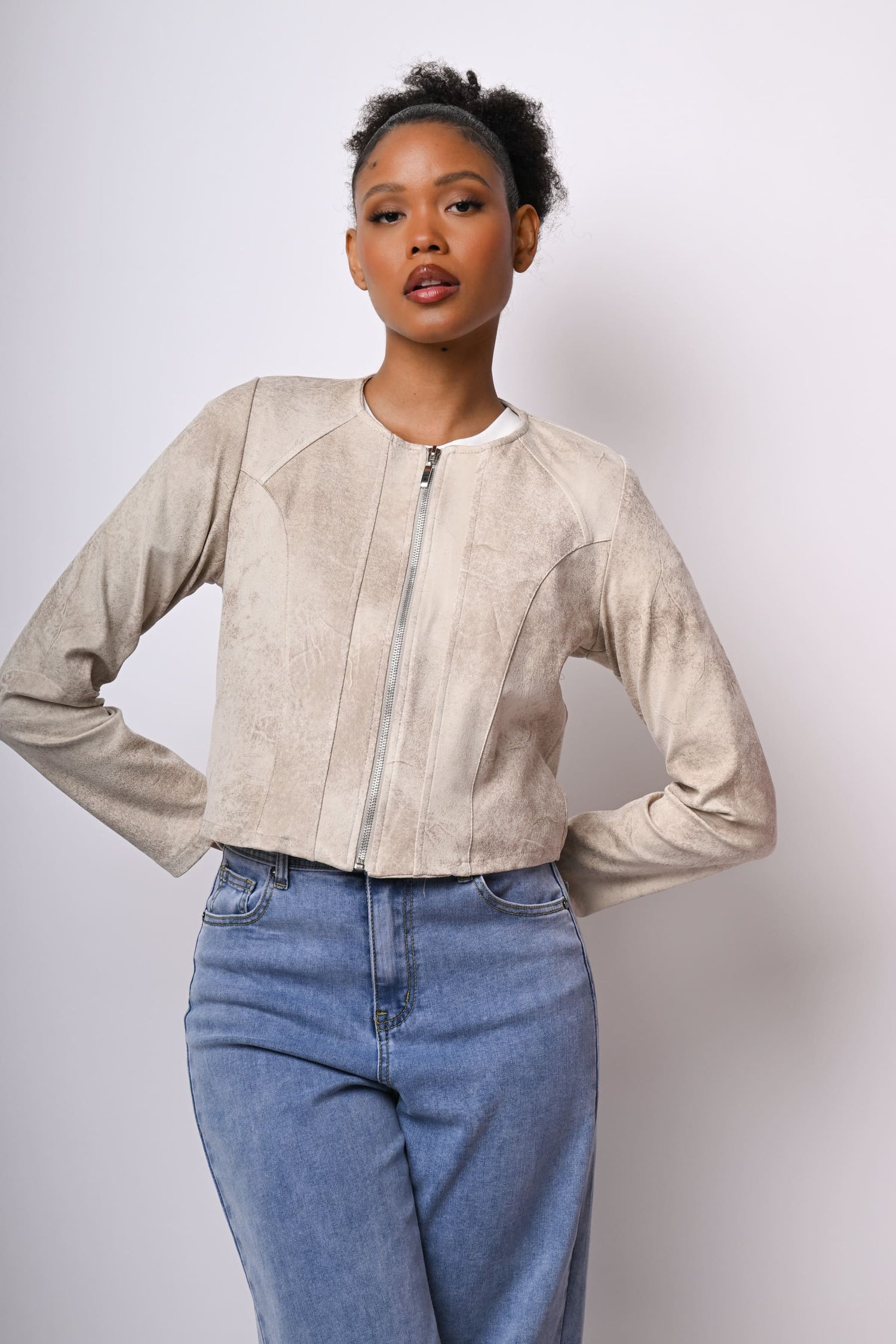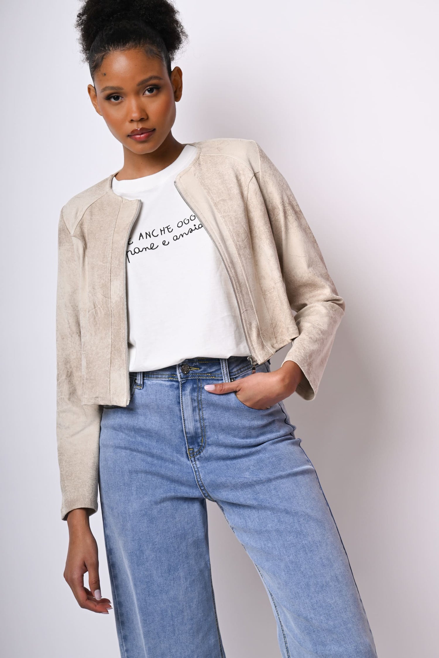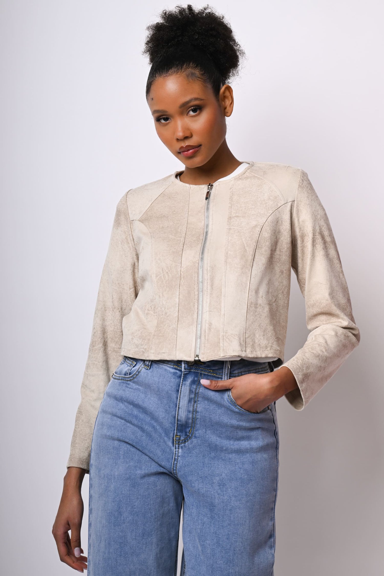 Giacca crop in morbida similpelle scamosciata avorio effetto vintage con scollo tondo, zip di chiusura e silhouette sagomata.