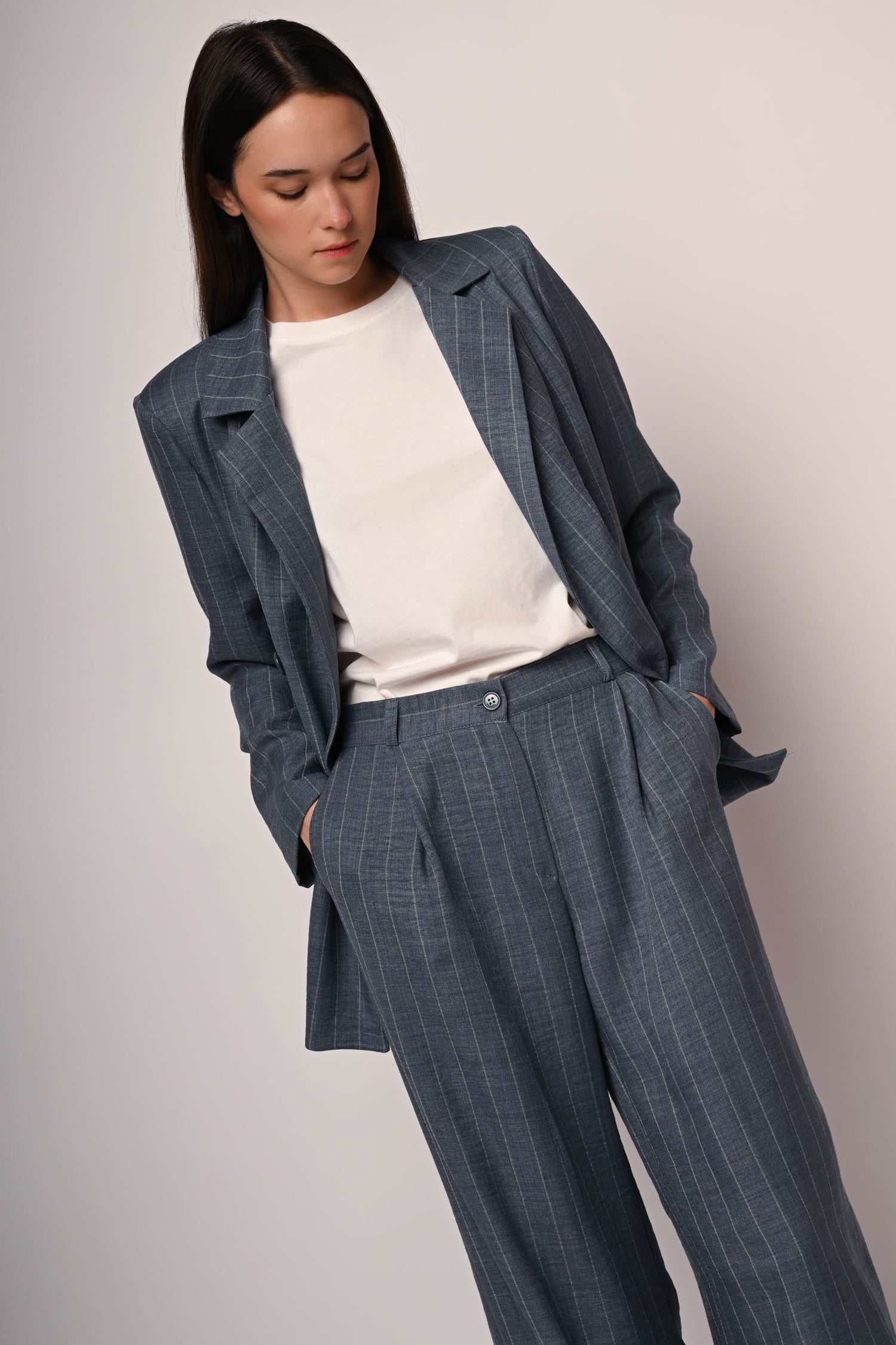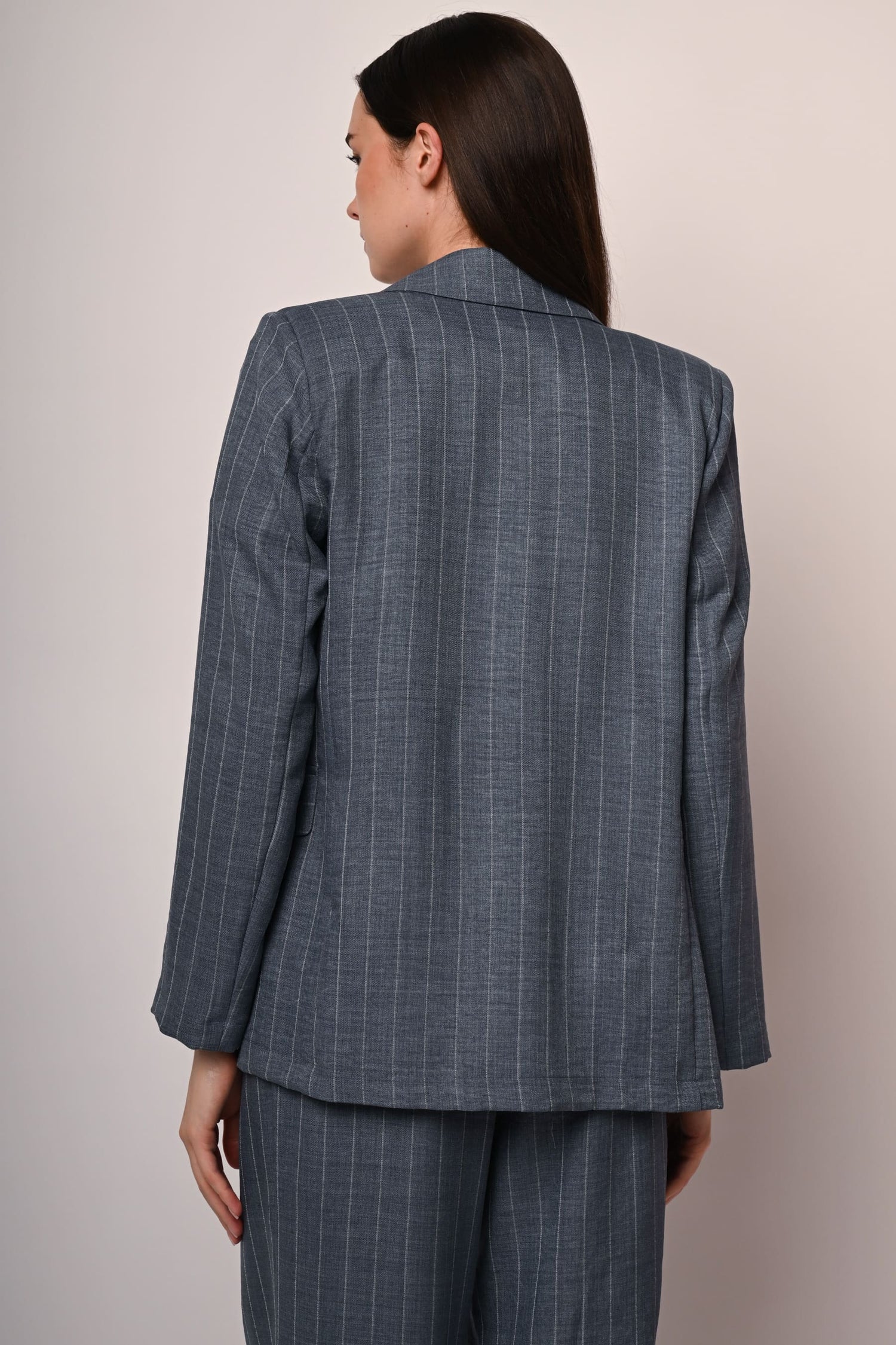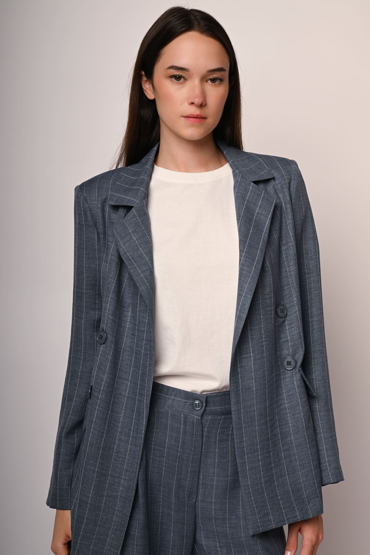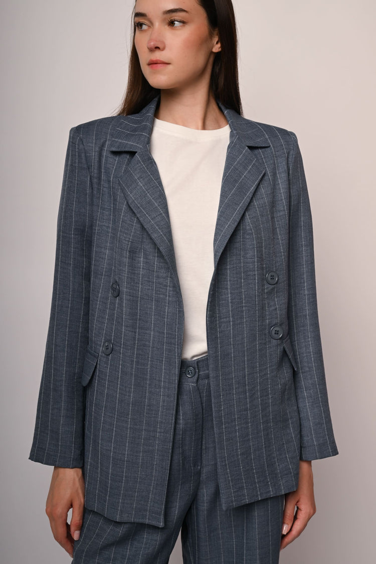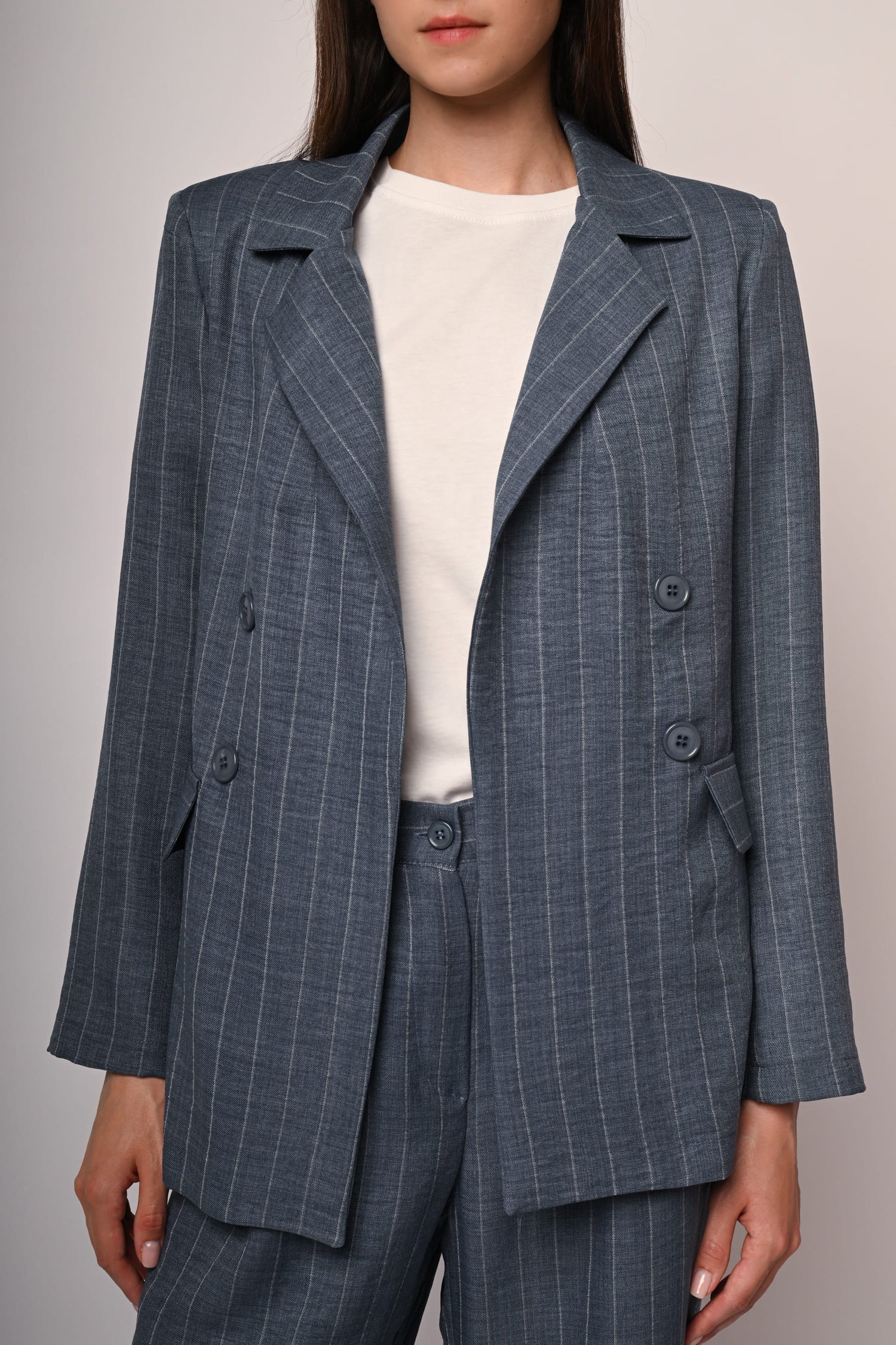 Blazer effetto doppiopetto in tessuto blu a righe bianche con revers classici, nessuna chiusura, taglio dritto e tasche frontali con risvolto.