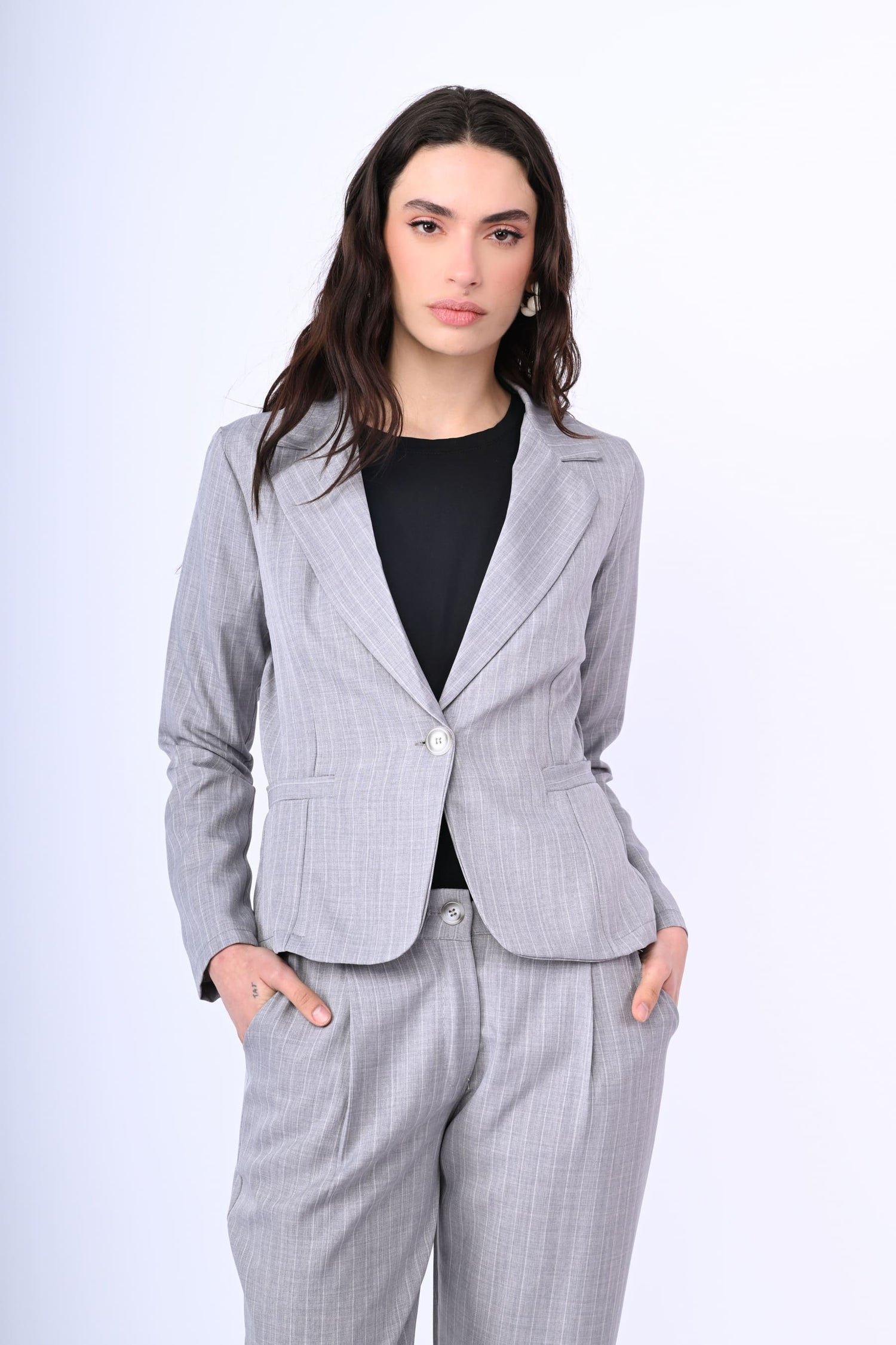 Blazer monopetto in tessuto gessato grigio con revers classici, un bottone e tasche frontali a filetto.