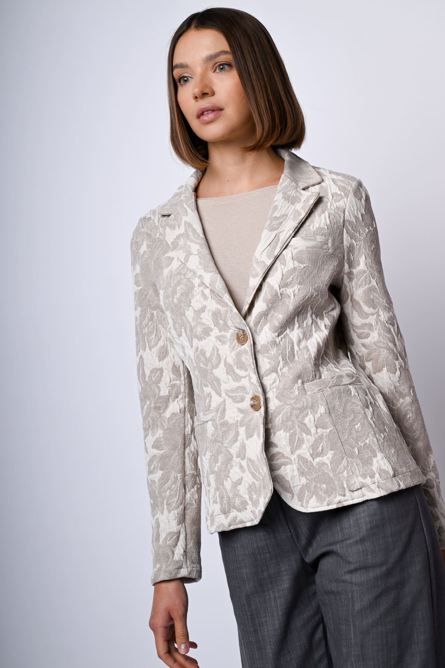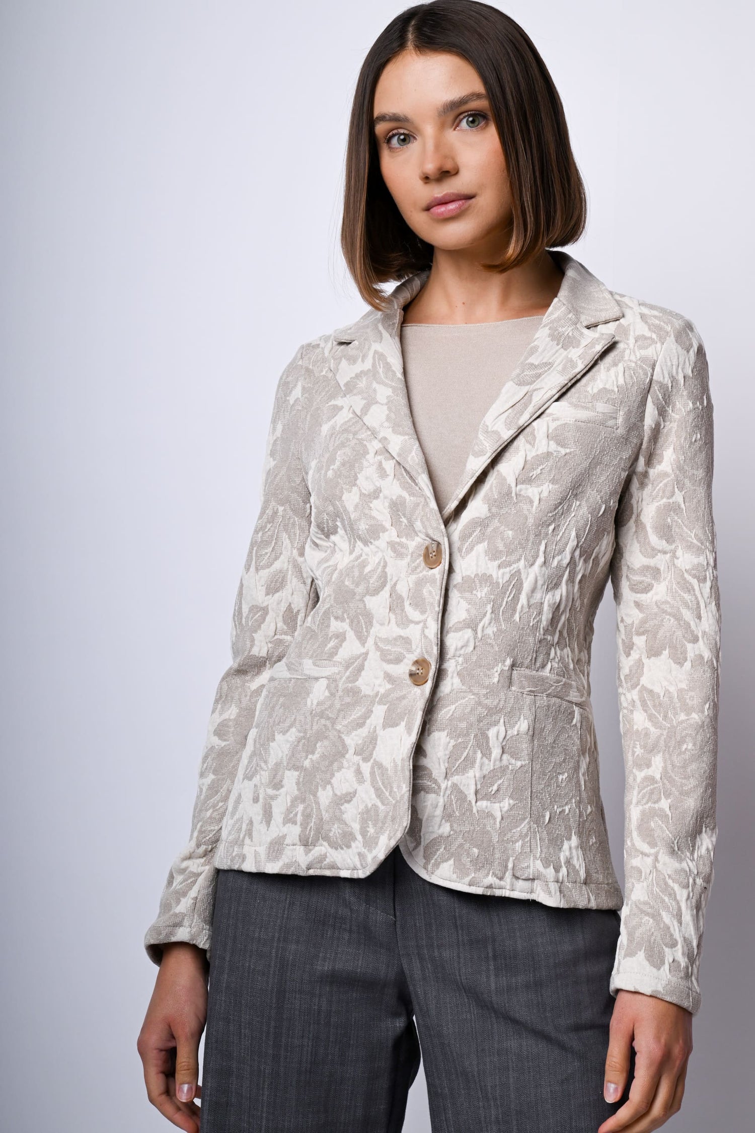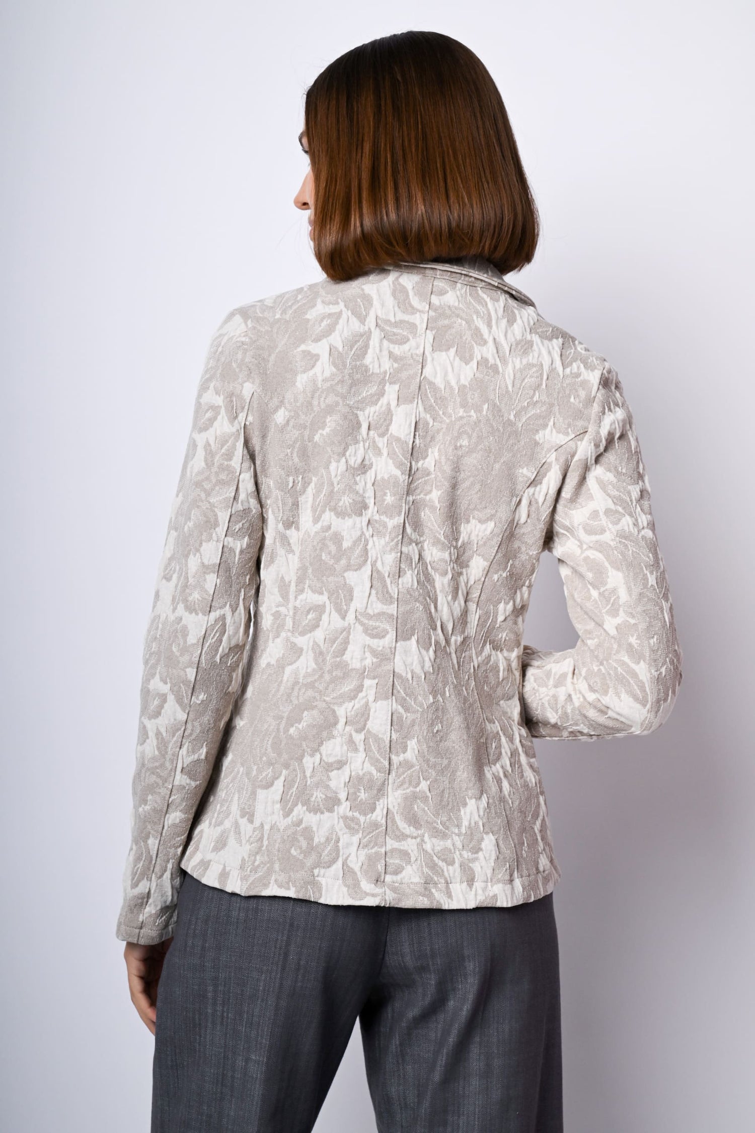 Blazer monopetto in jacquard floreale misto cotone stretch nei toni del tortora e bianco con revers classici, due bottoni di chiusura e tasche frontali a filetto.