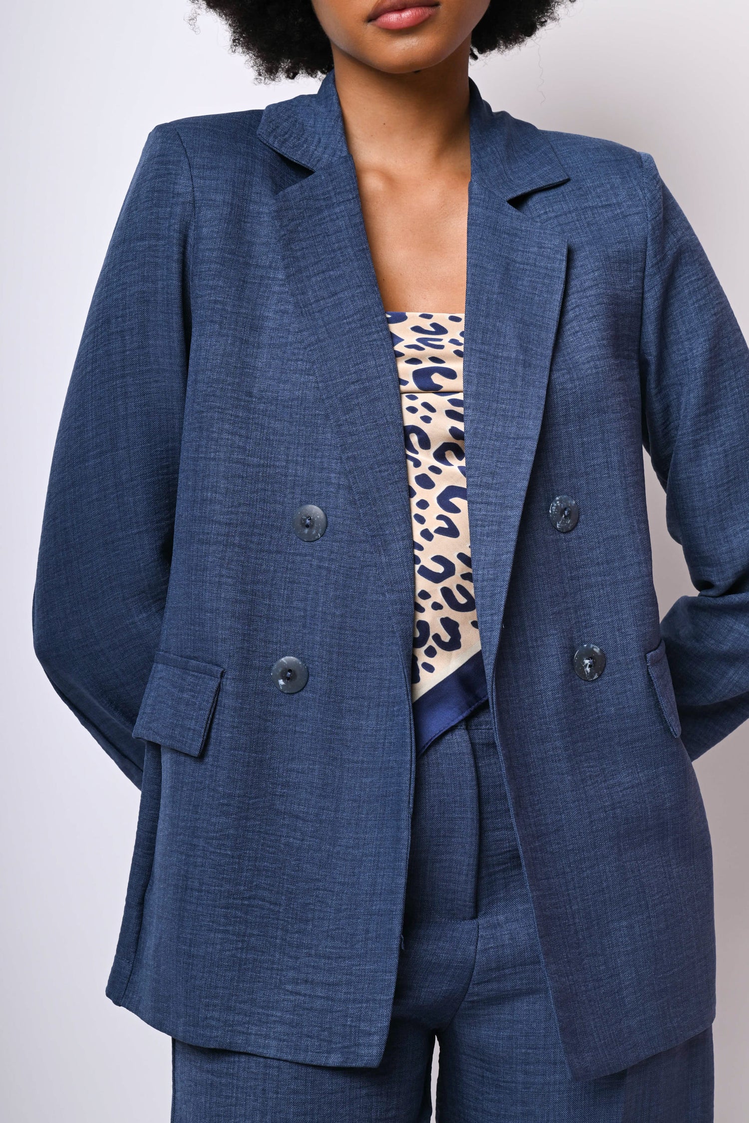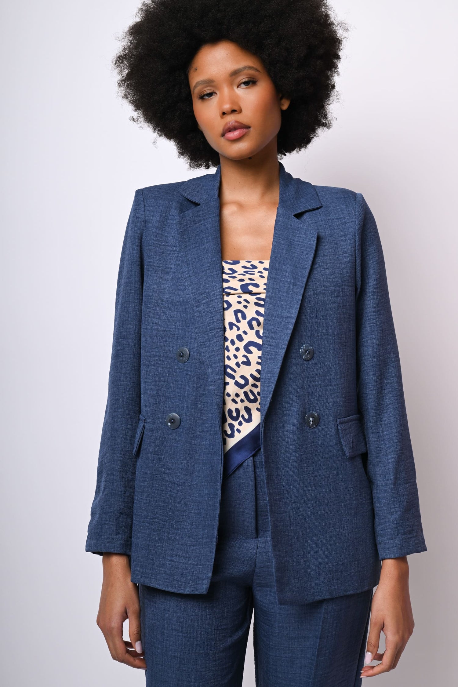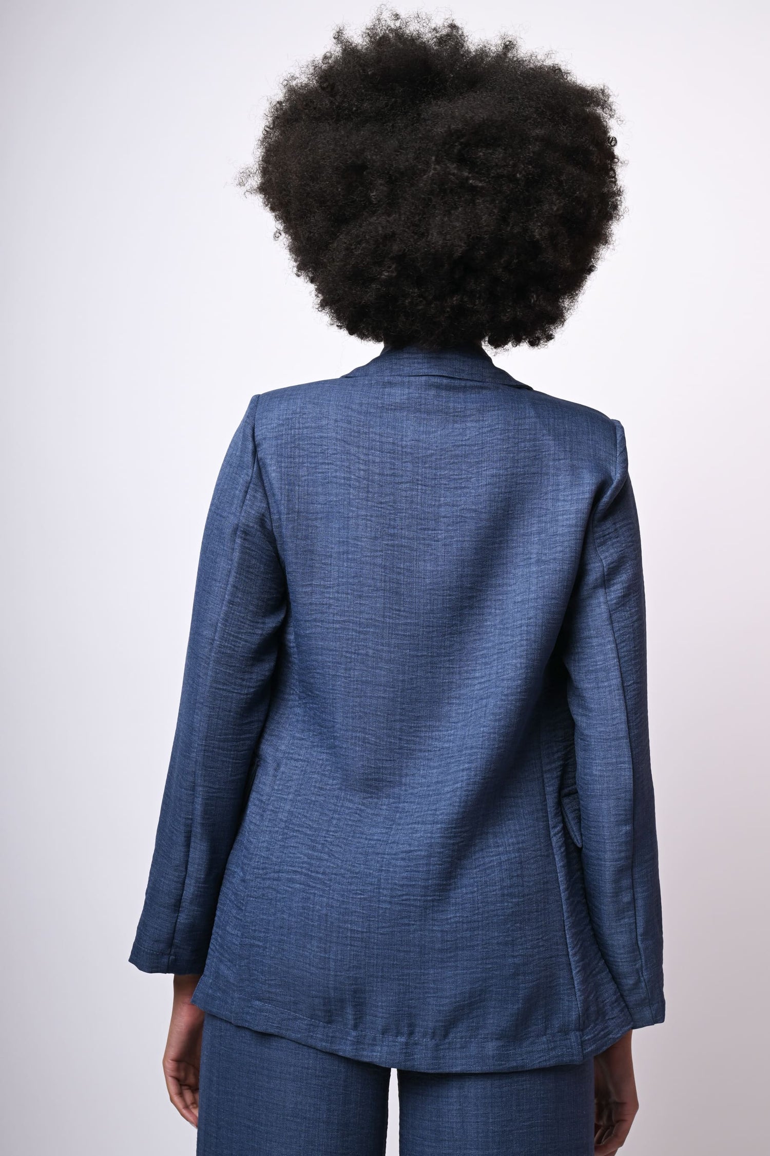 Blazer lungo e doppiopetto in tessuto blu con revers classici, nessuna chiusura, tasche frontali con risvolto e taglio dritto.