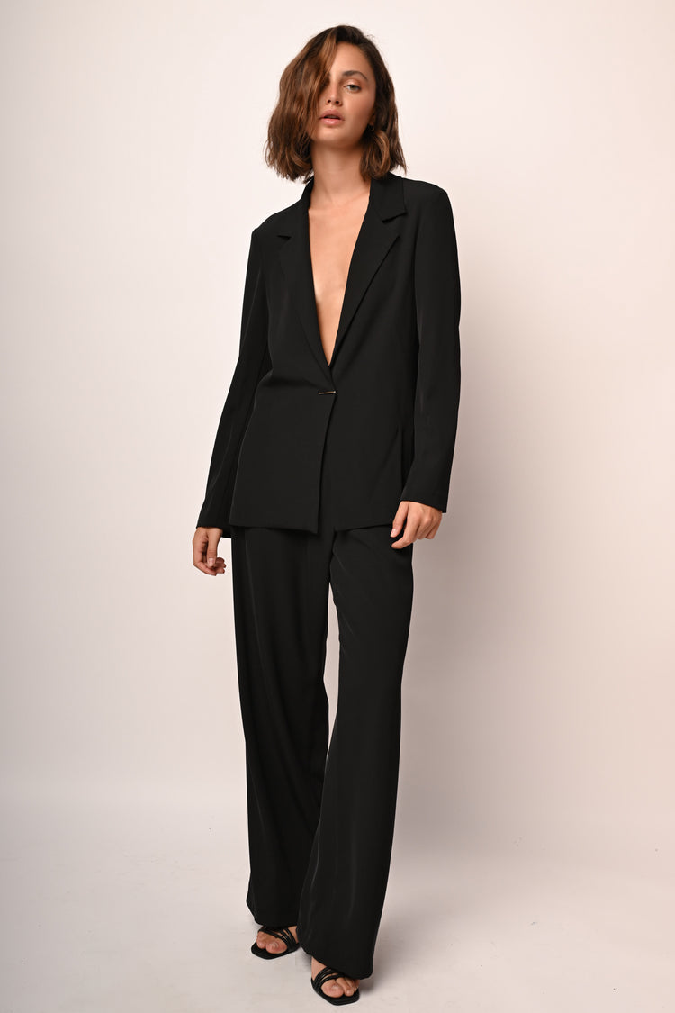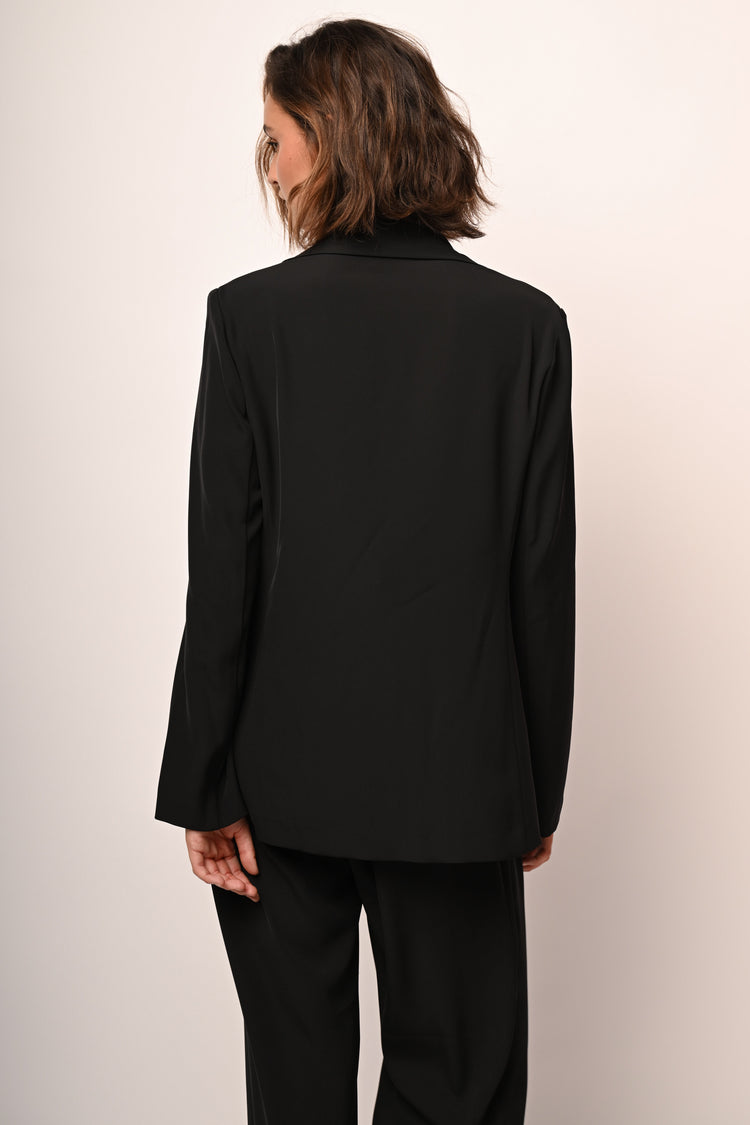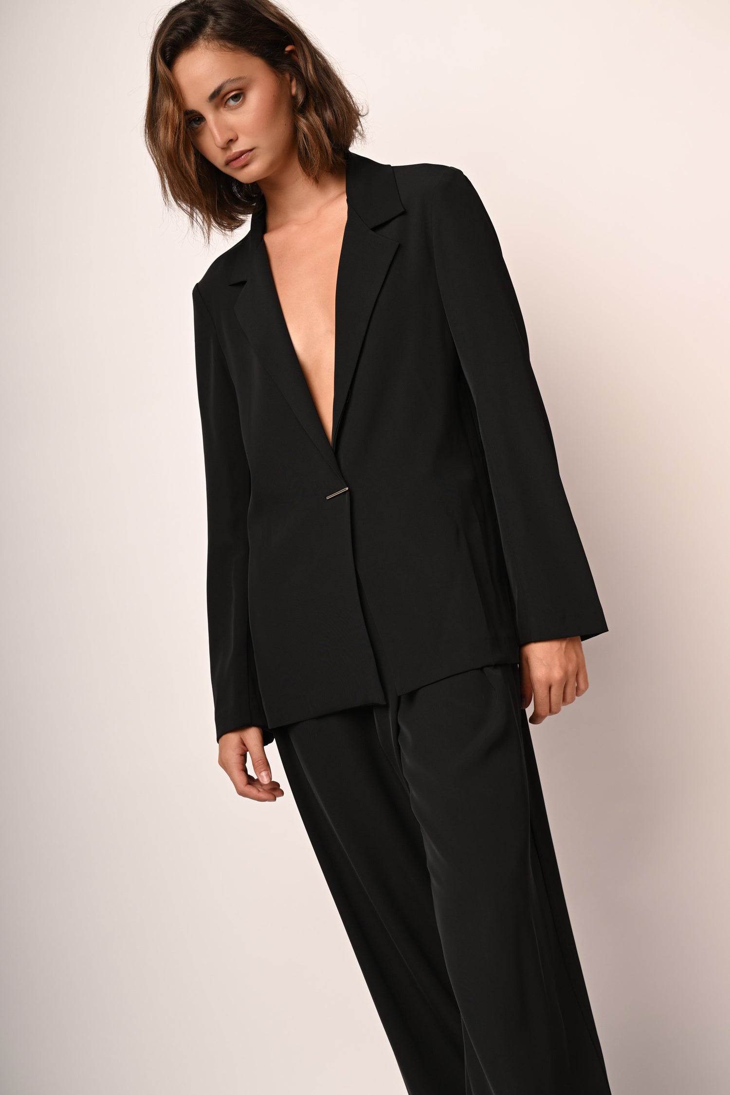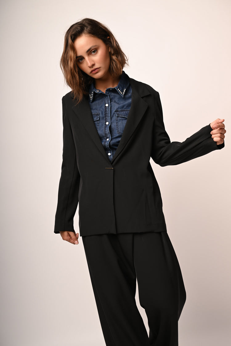 Blazer destrutturato in tessuto stretch nero con revers classici, bottone di chiusura sottile in metallo dorato e taglio dritto.