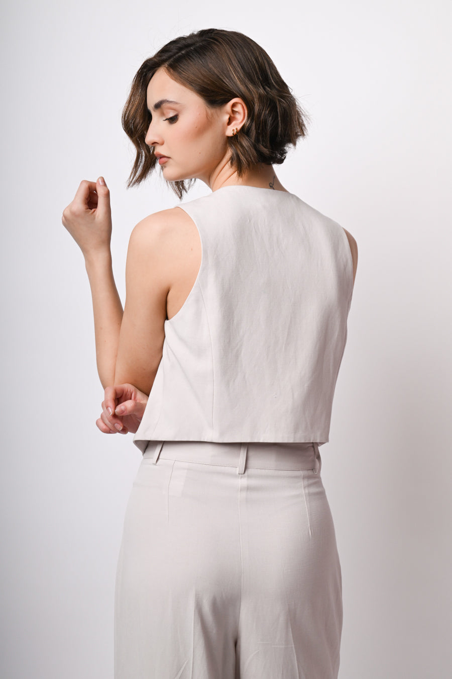 Gilet misto viscosa e lino nuance avorio con scollo a U e chiusura monopetto con bottoni ricoperti in tessuto.
