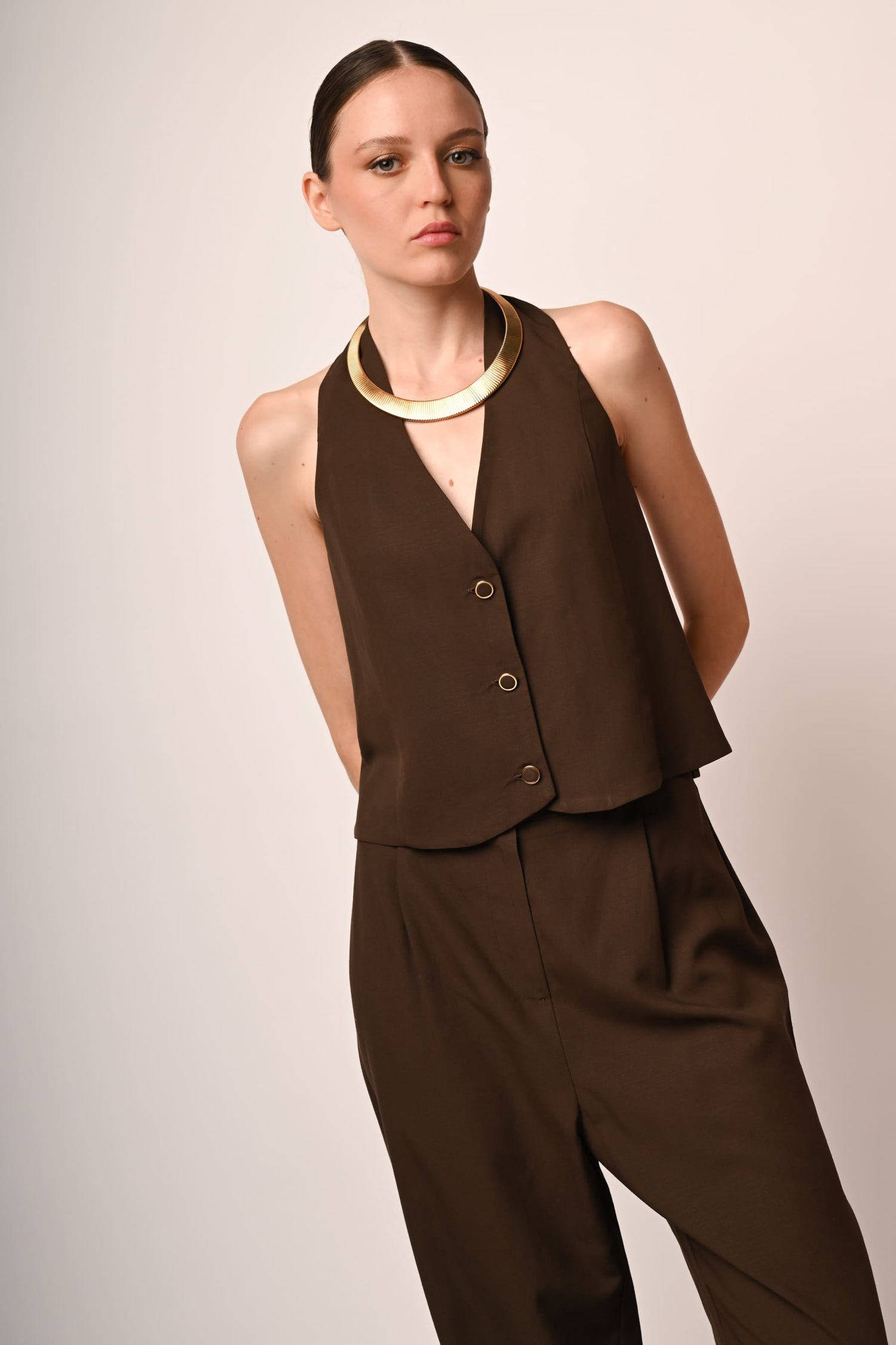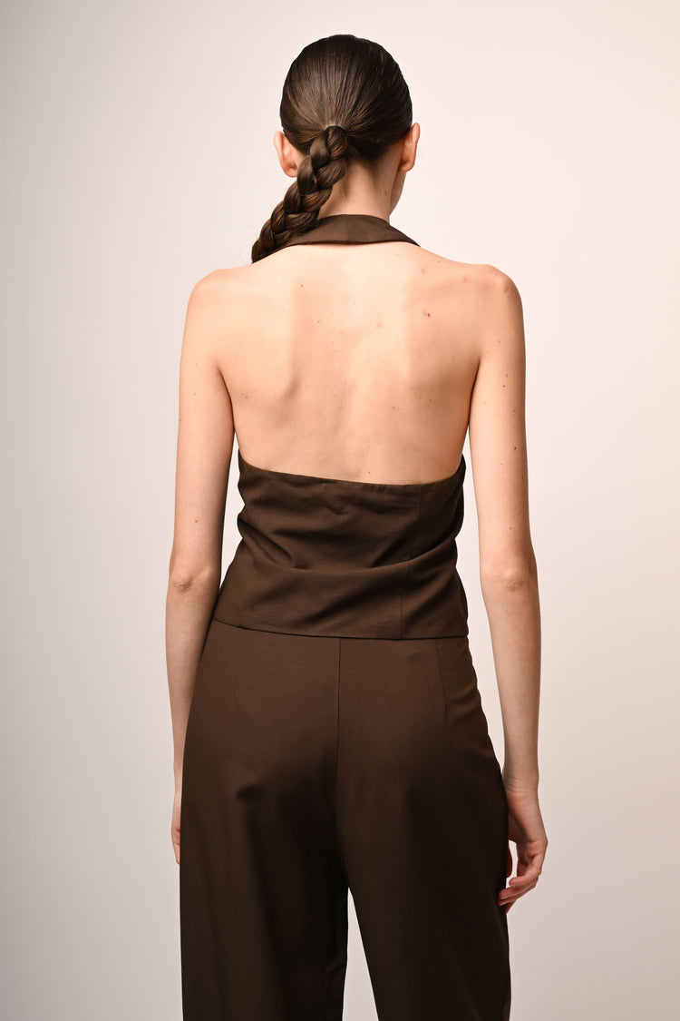 Top a gilet misto viscosa e lino marrone con taglio allamericana, scollo a V, abbottonatura frontale e schiena scoperta.