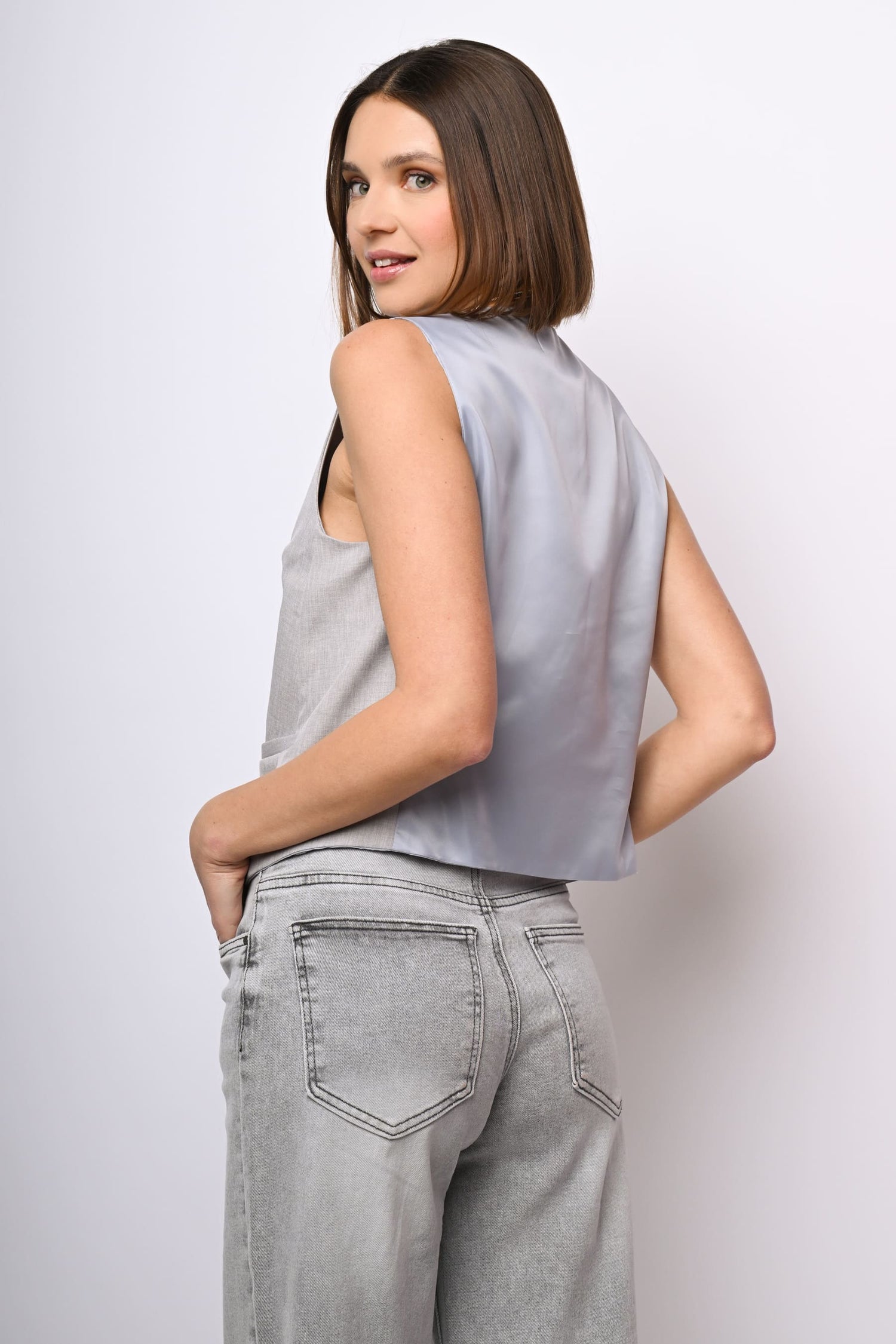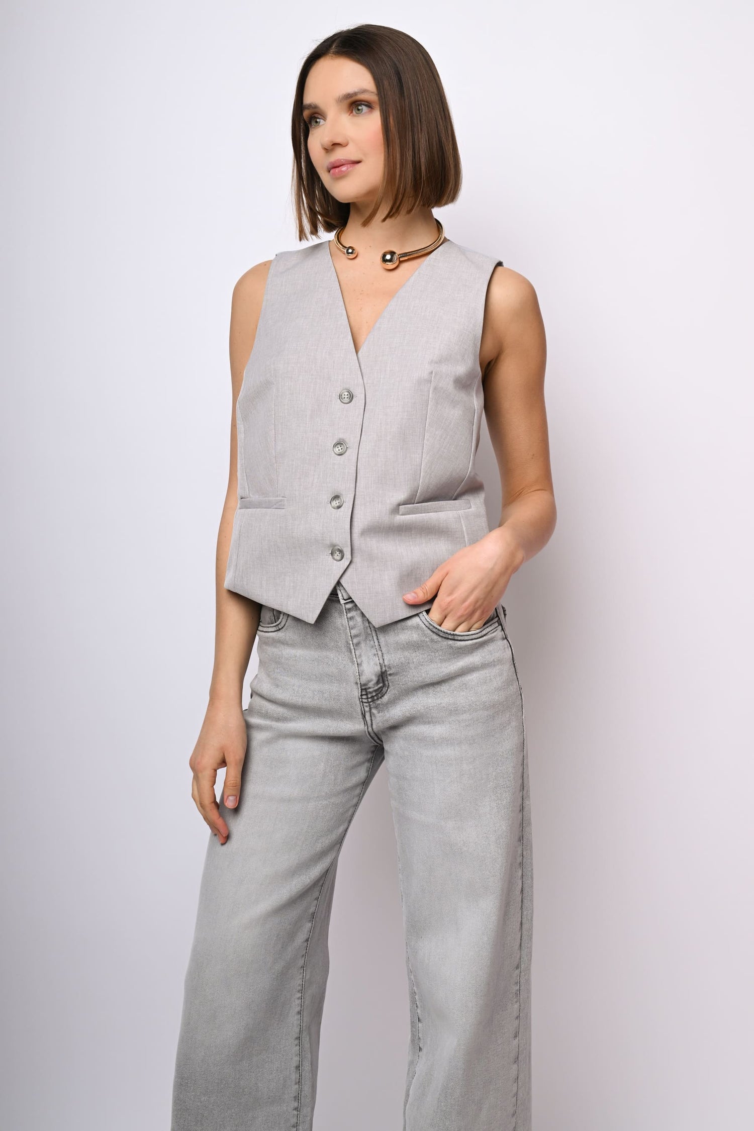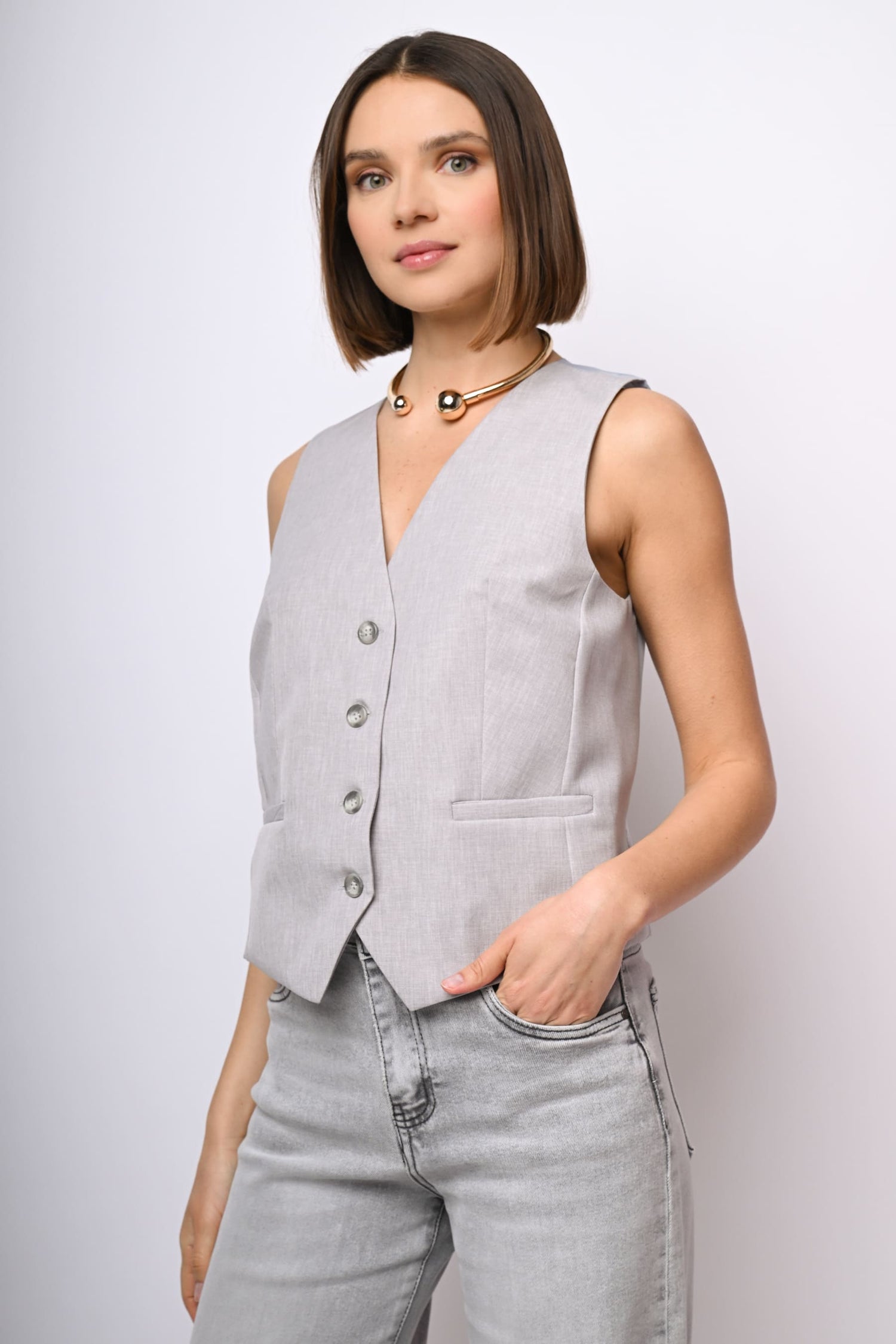 Gilet monopetto in tessuto grigio chiaro con scollo a V, abbottonatura frontale, tasche a filetto e retro in raso.