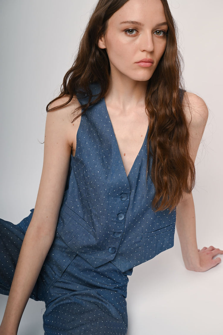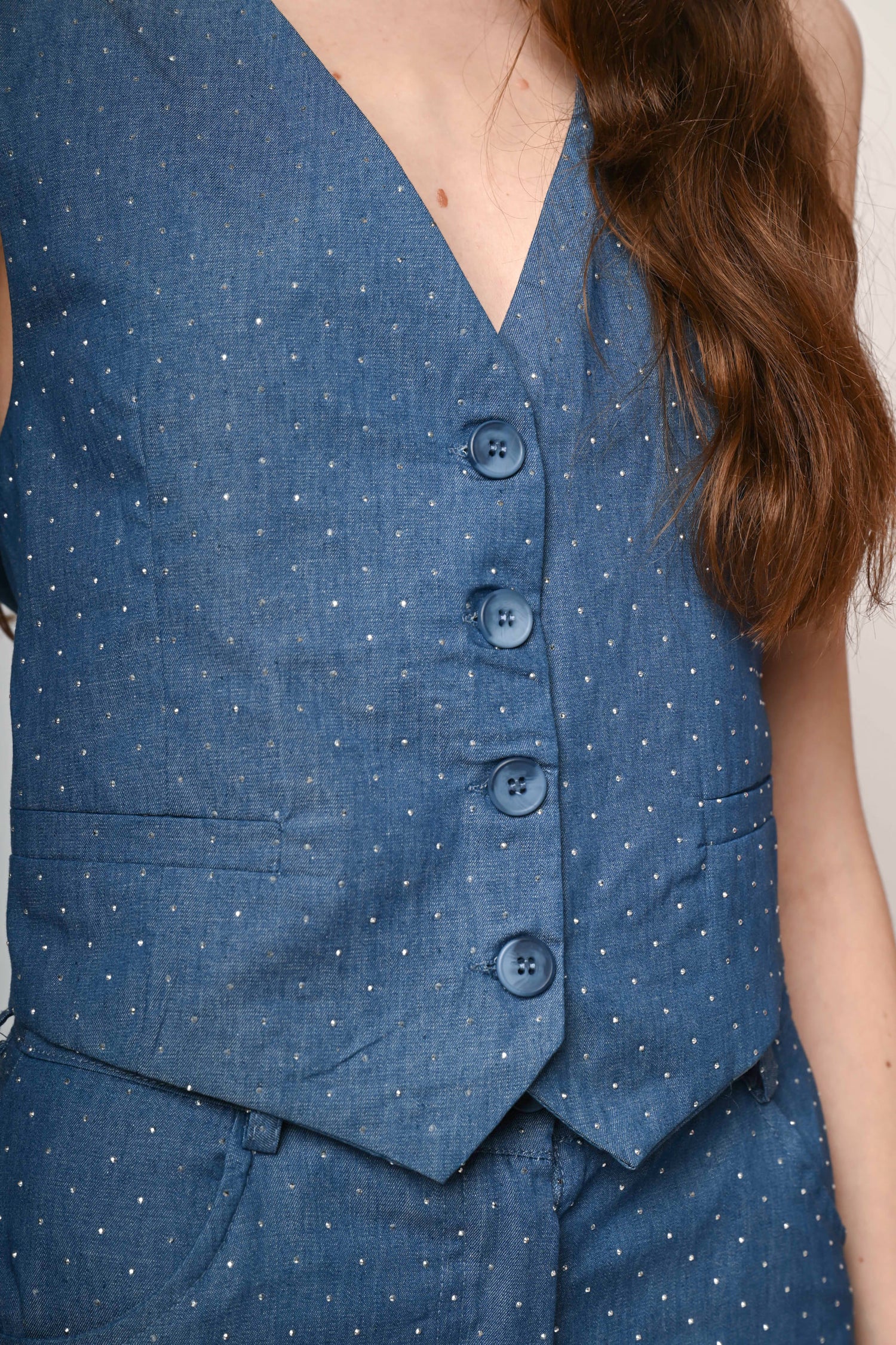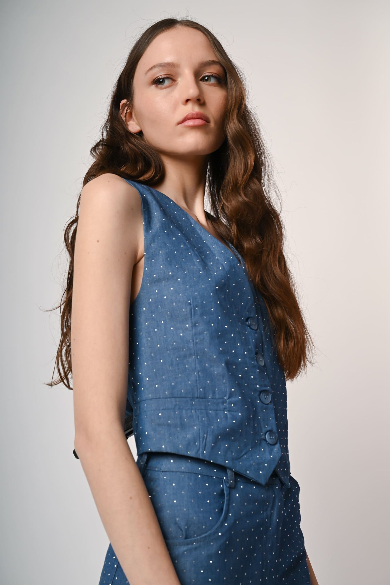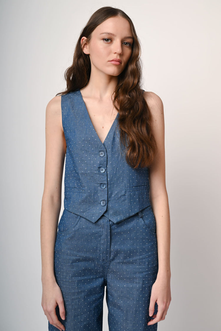 Gilet in cotone effetto denim blu con decorazione strass sul davanti, scollo a V, abbottonatura frontale e taschini a filetto.