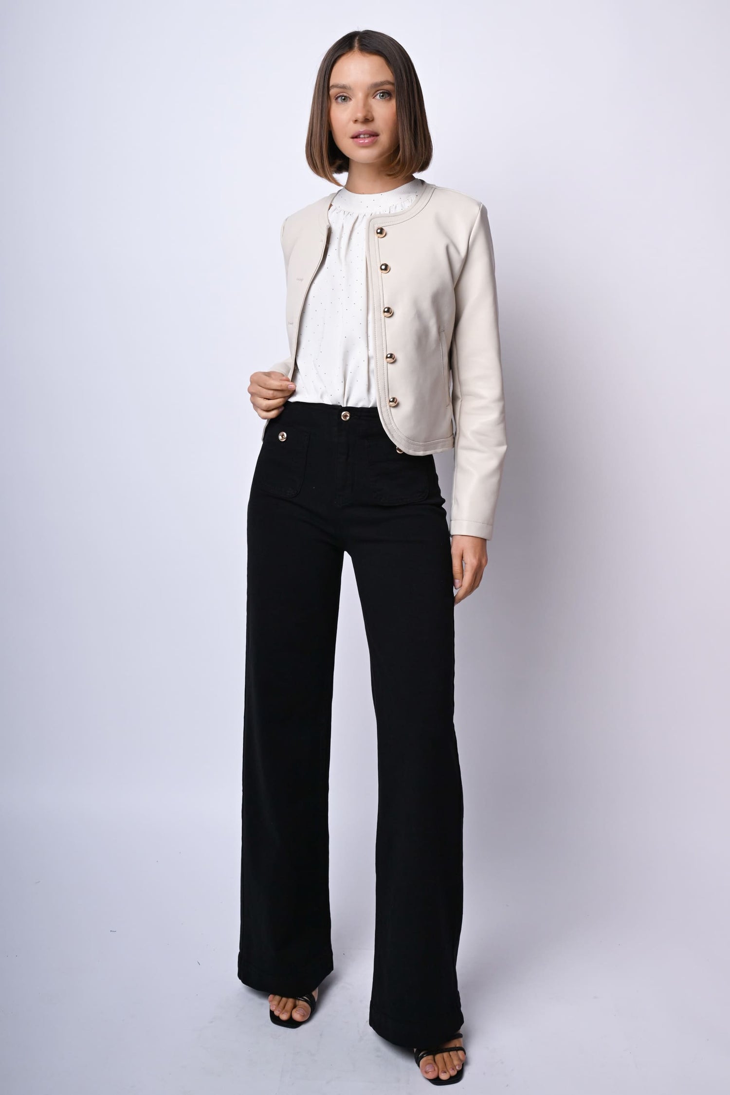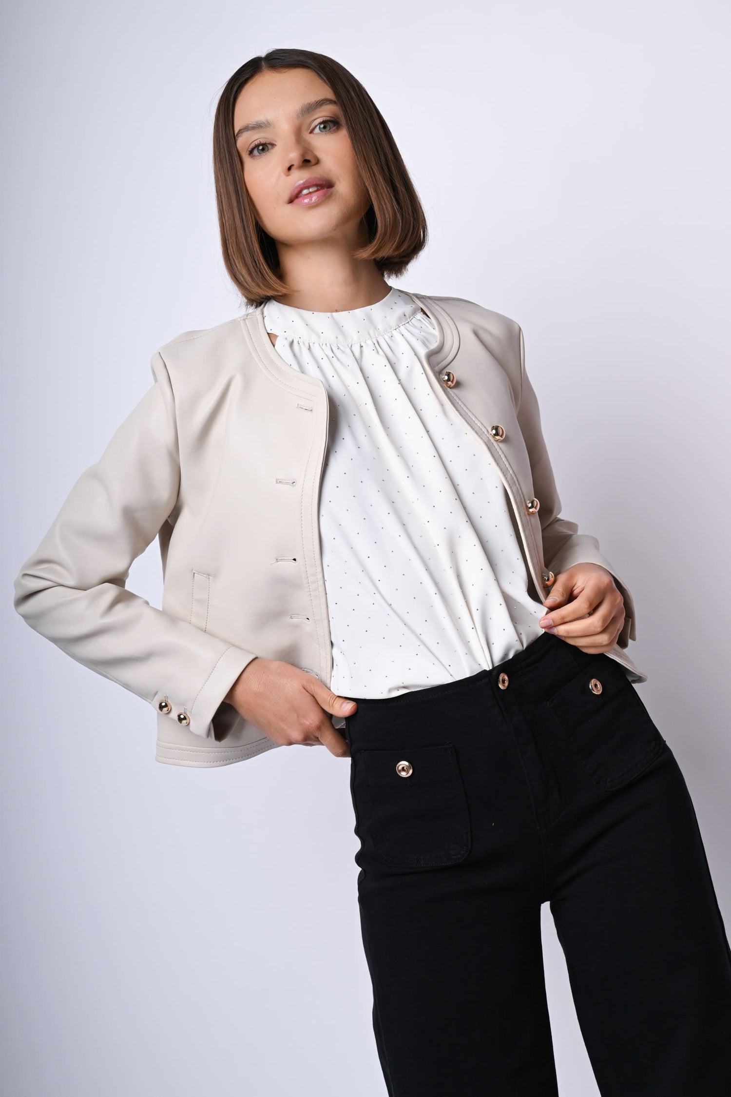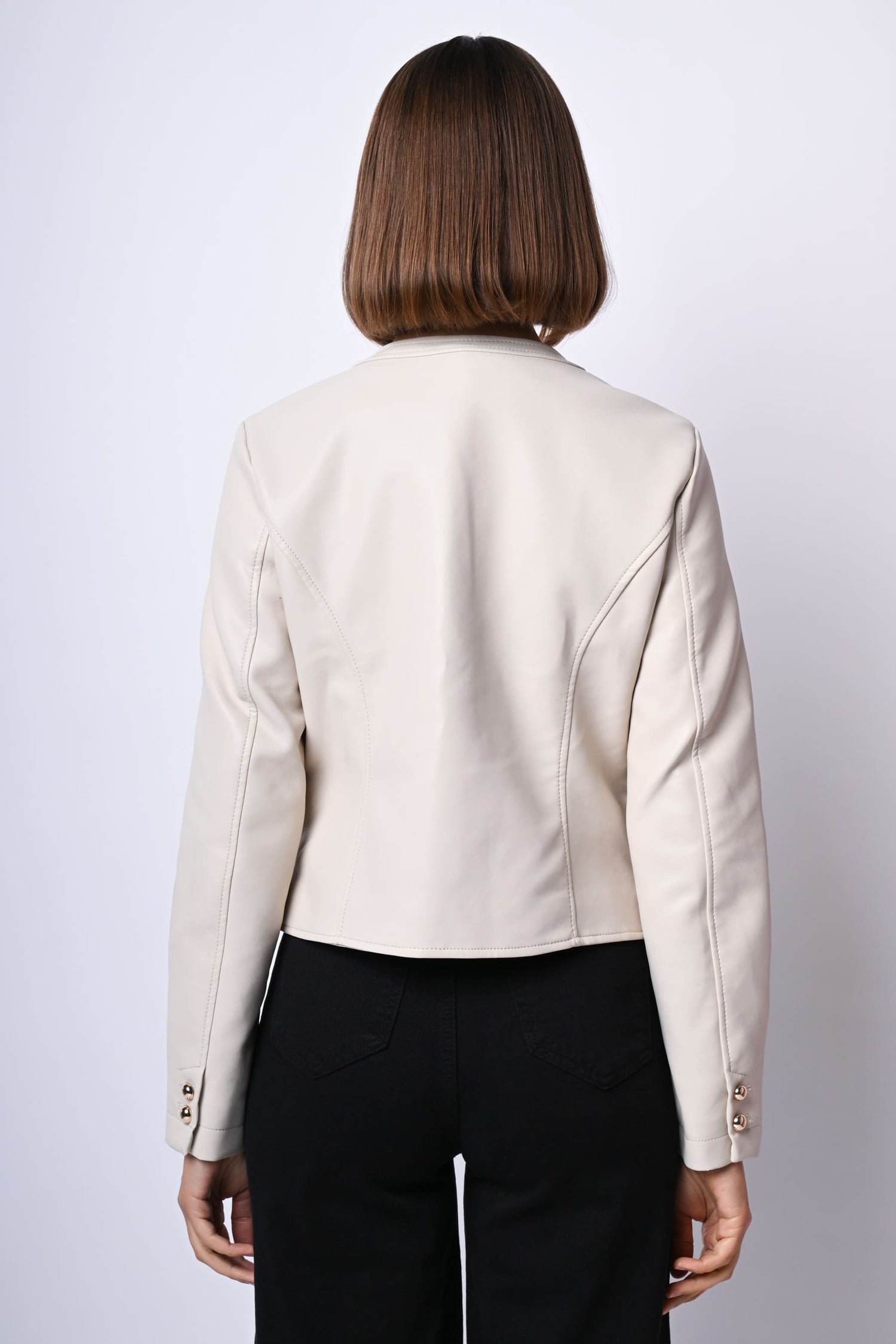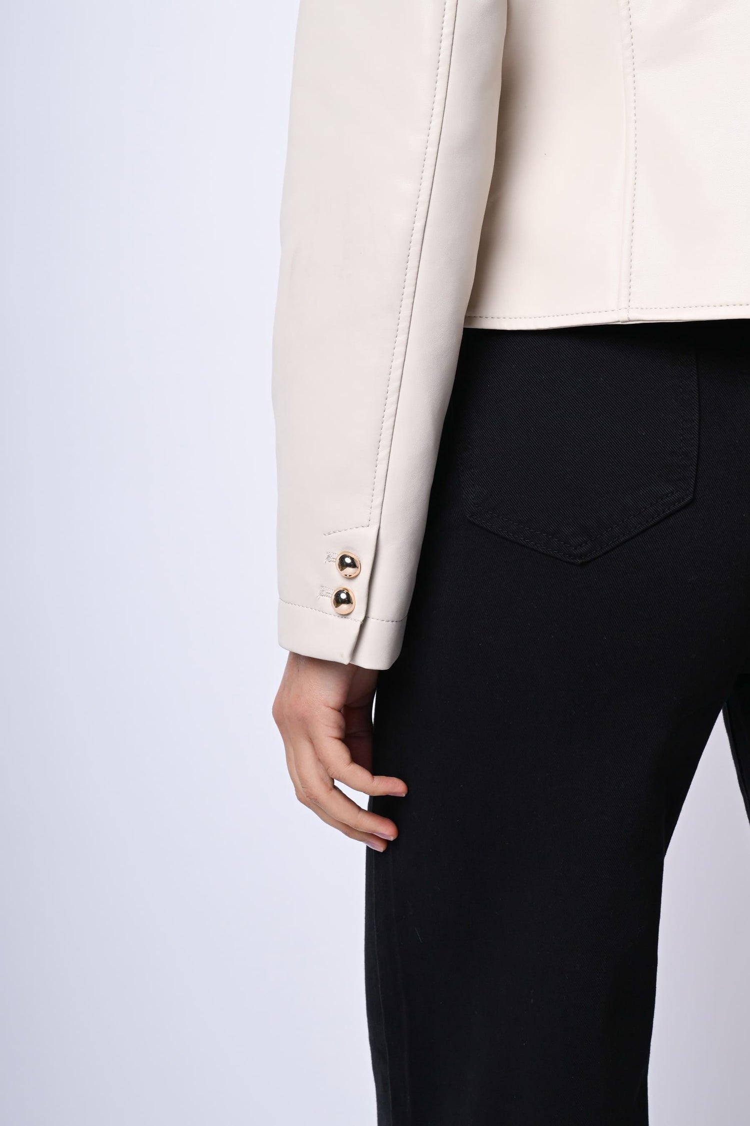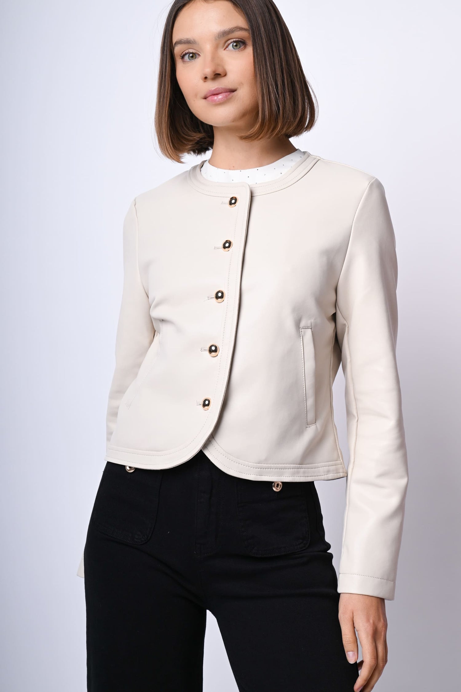 Giacca in similpelle avorio con scollo tondo, chiusura monopetto con bottoni in metallo, tasche laterali, orlo stondato e silhouette sagomata.