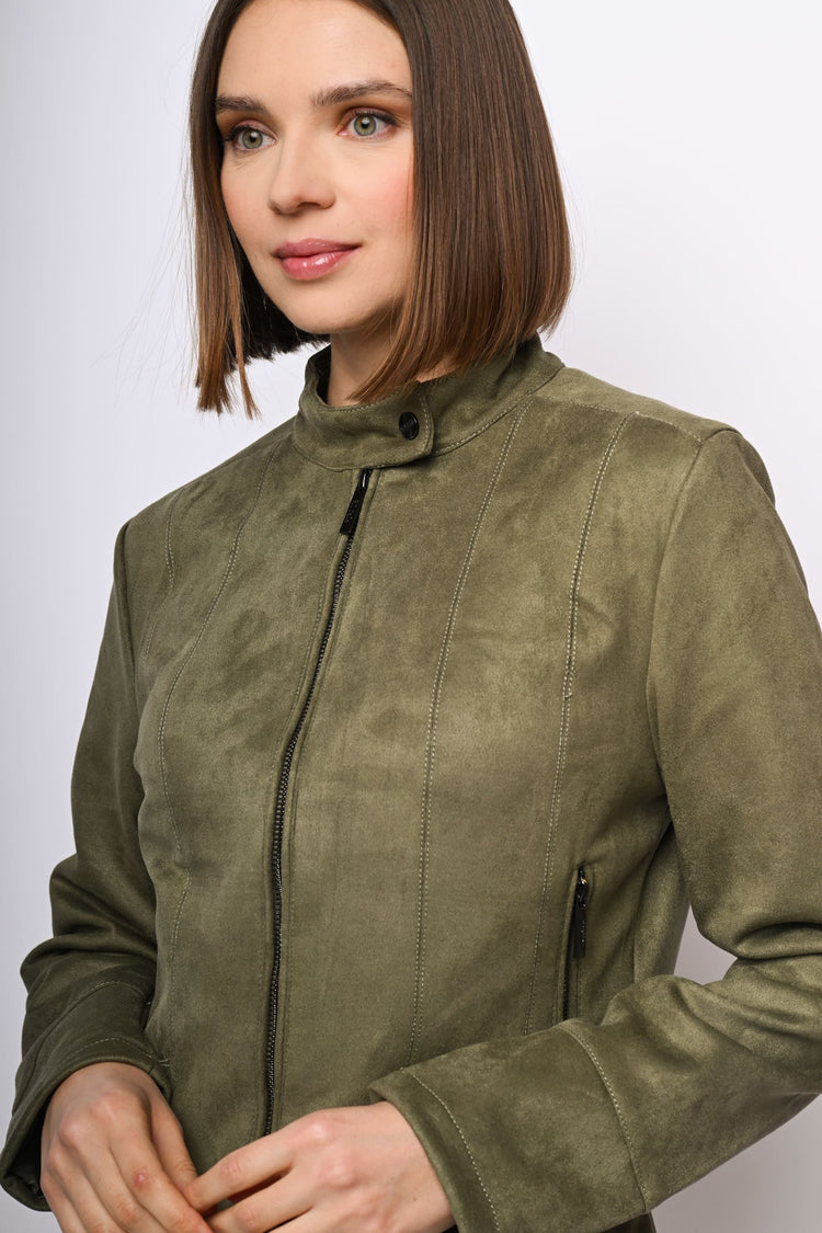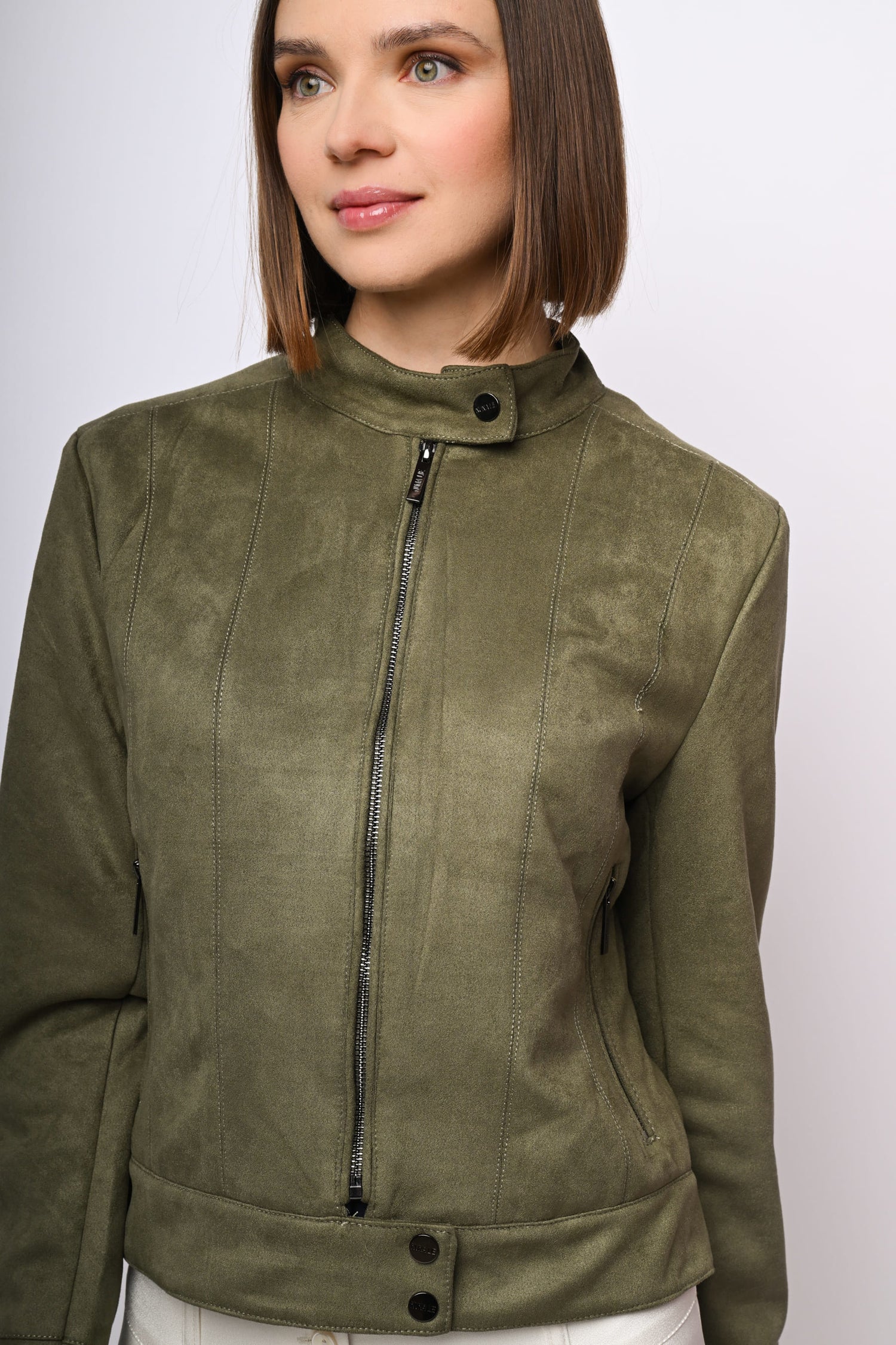 Giacca stile biker in similpelle scamosciata verde oliva con colletto tondo chiuso da bottone, zip frontale, orlo con bottoni di chiusura e tasche laterali chiuse da zip.