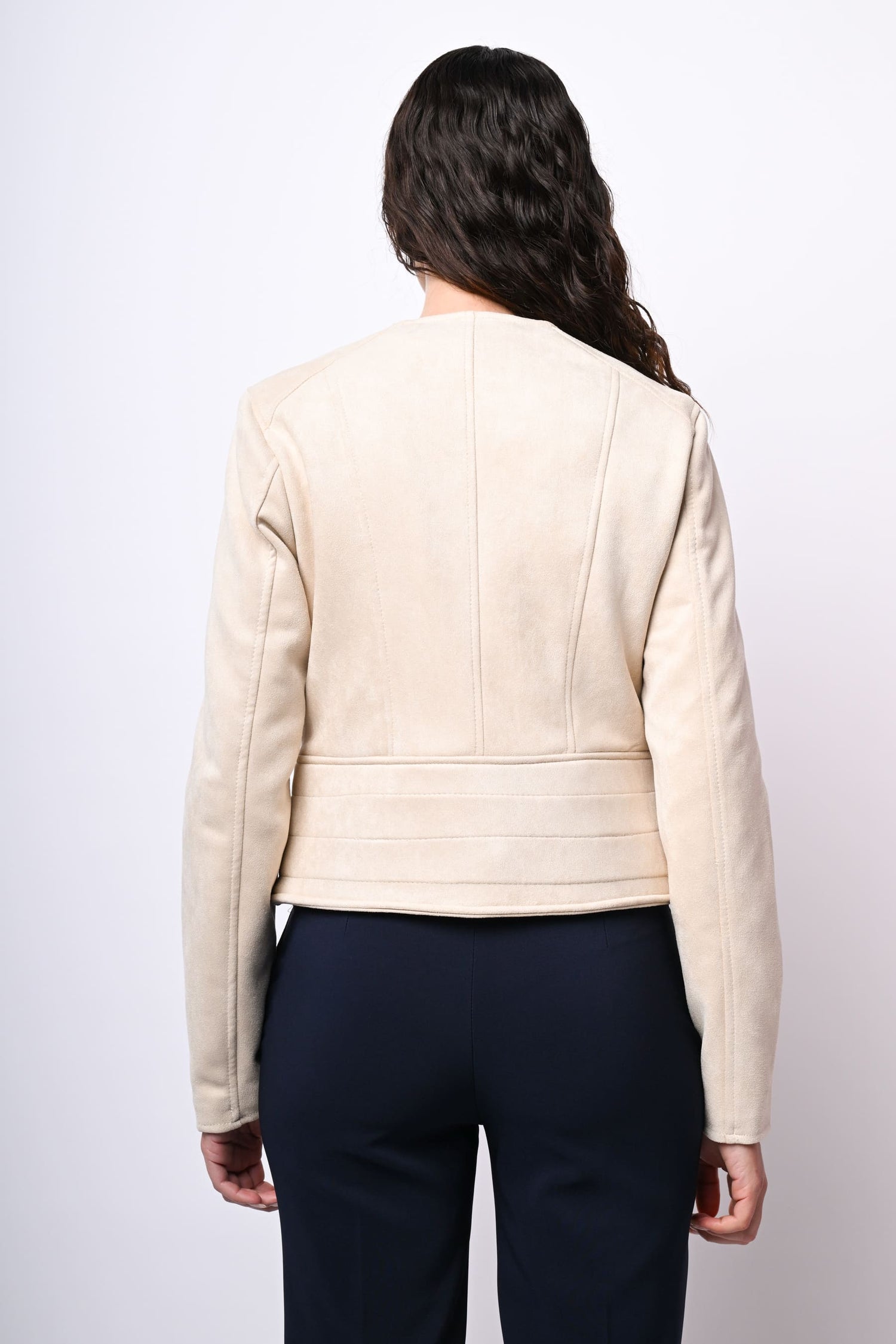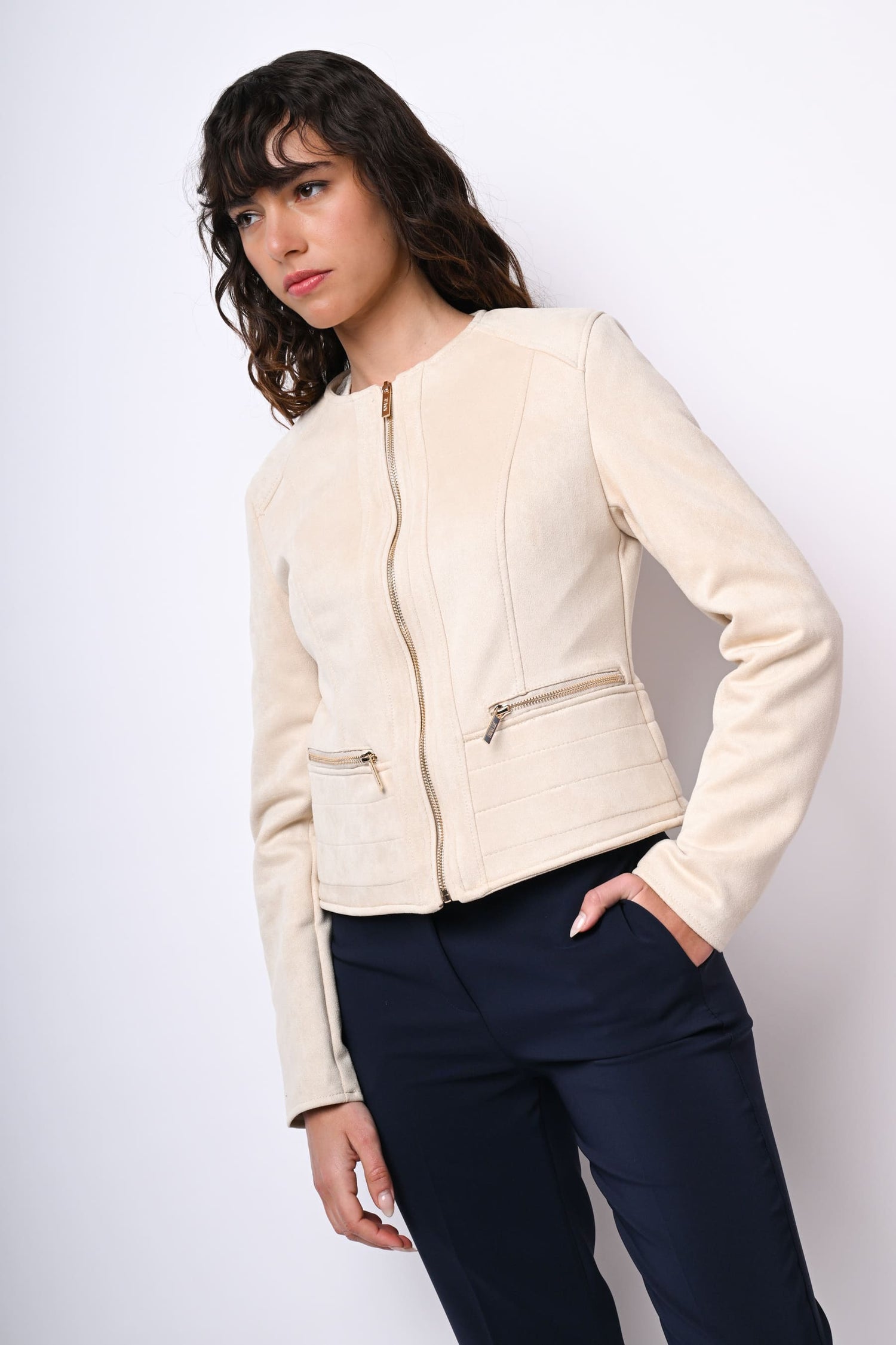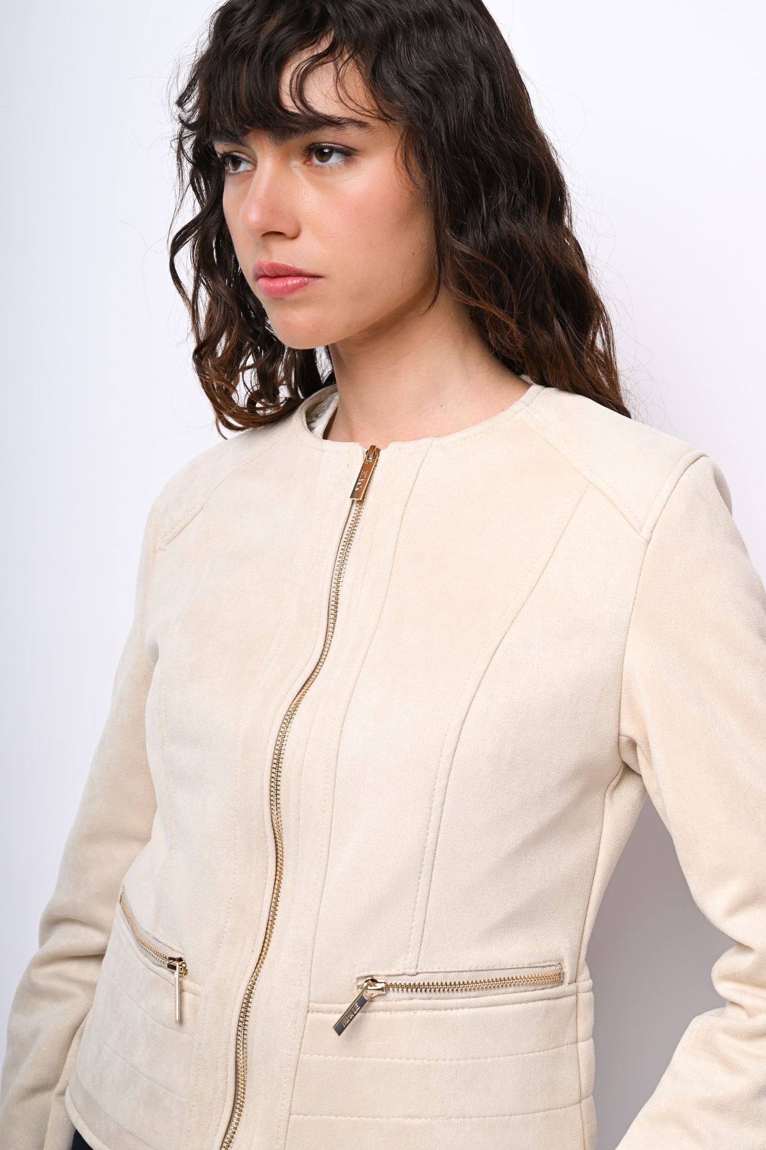 Giacca in similpelle scamosciata beige con scollo tondo, zip di chiusura, tasche frontali chiuse da zip e silhouette sagomata con tagli e impunture.