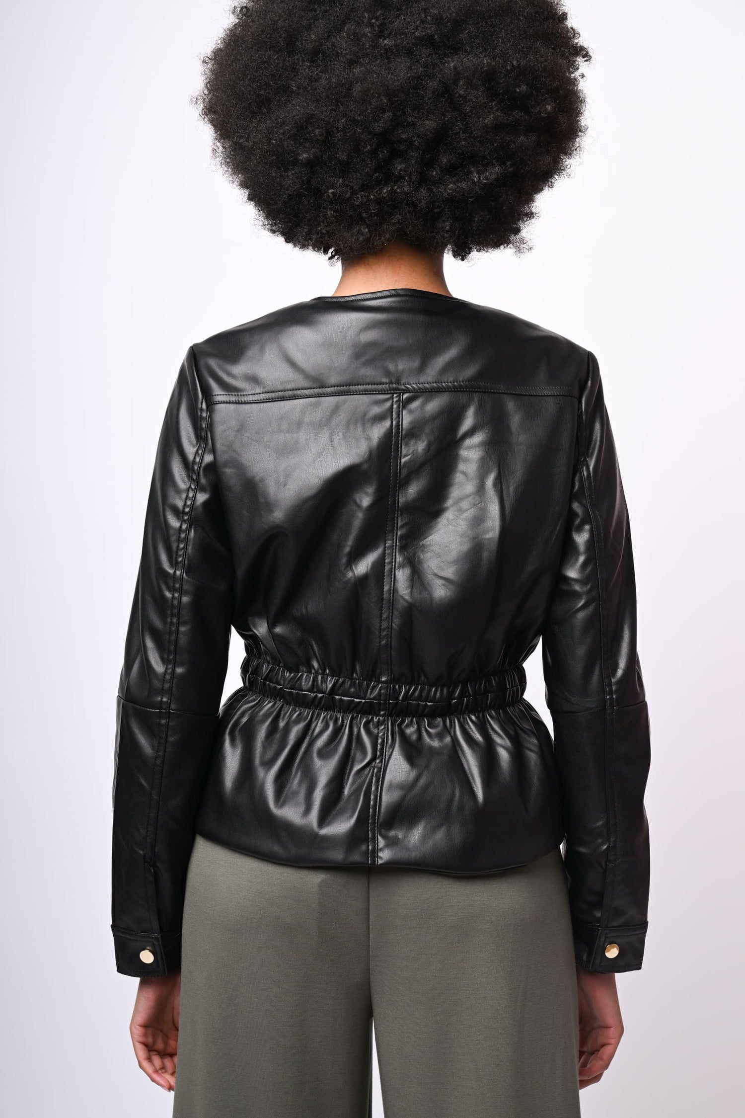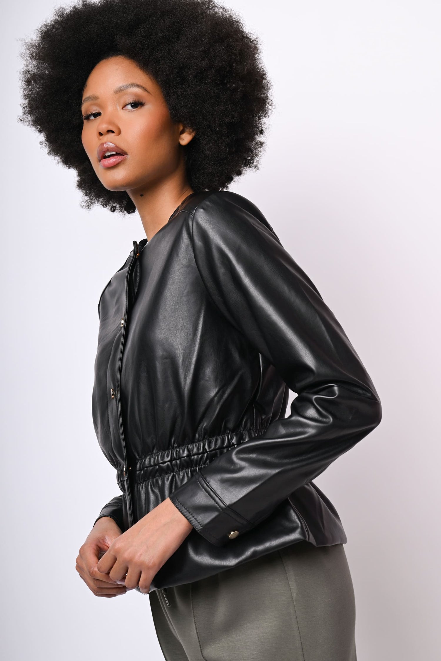 Giacca in similpelle nera con scollo tondo, chiusura frontale e ai polsini con bottoni a pressione, vita elasticizzata e balza al fondo.