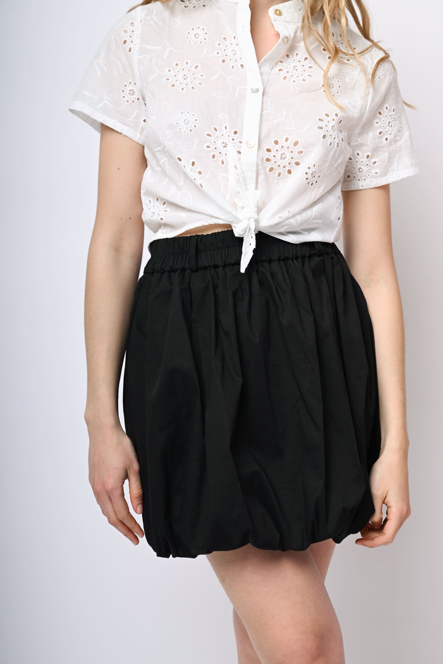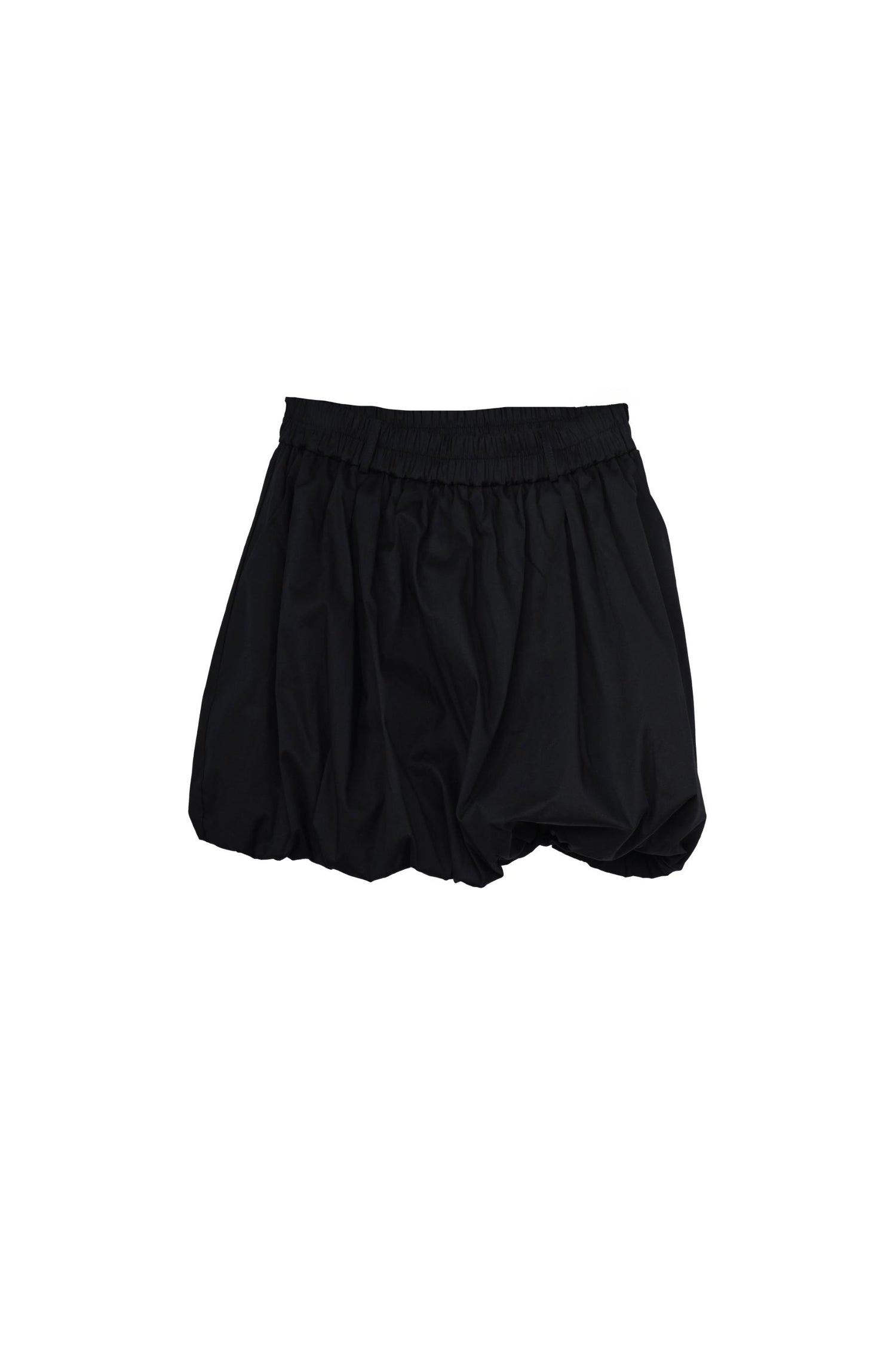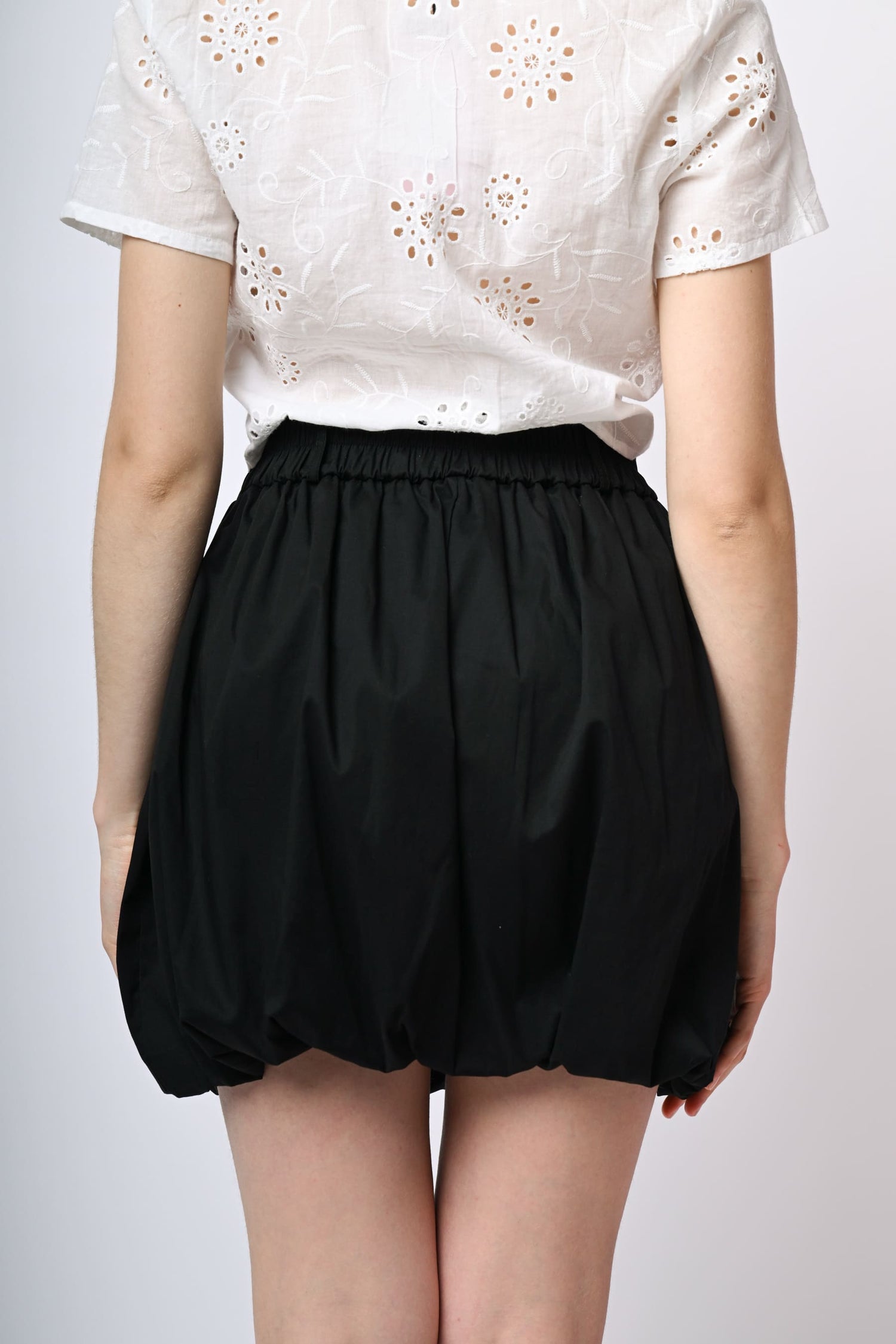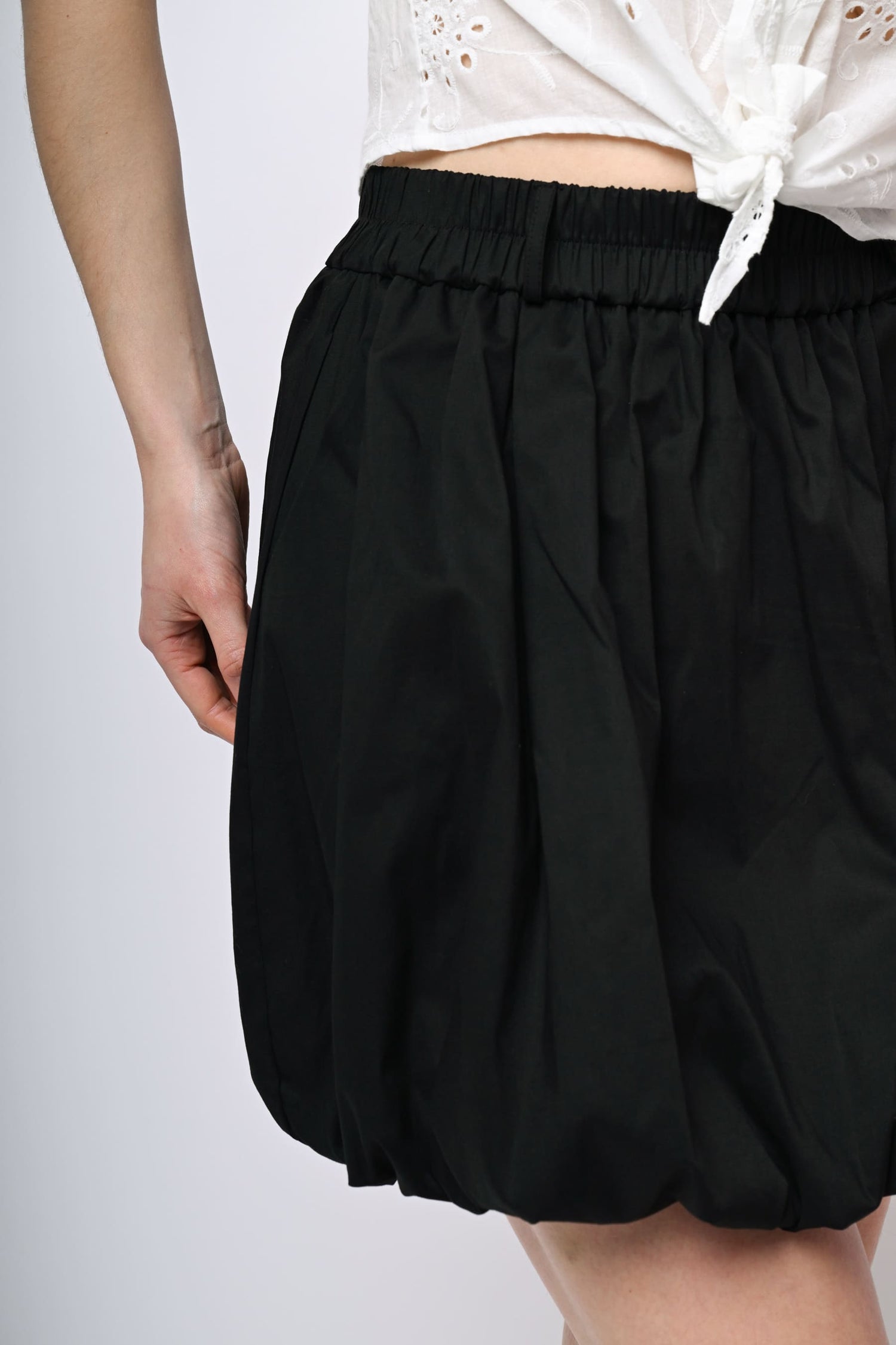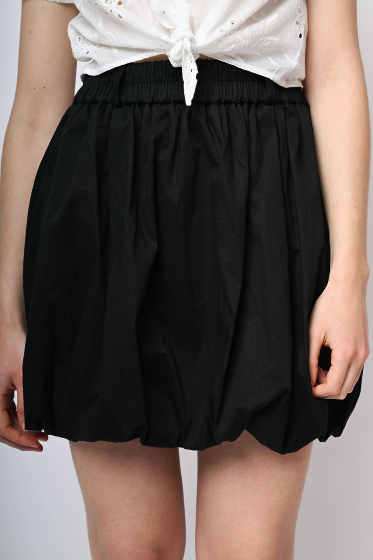 Minigonna a palloncino in cotone stretch nero con vita elasticizzata e passanti per cintura.