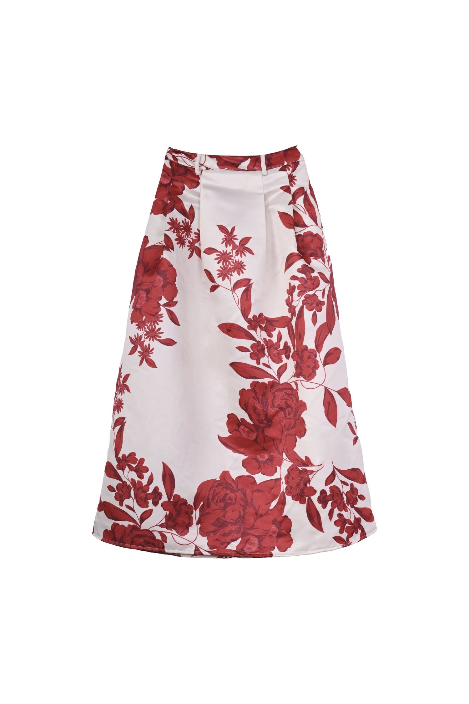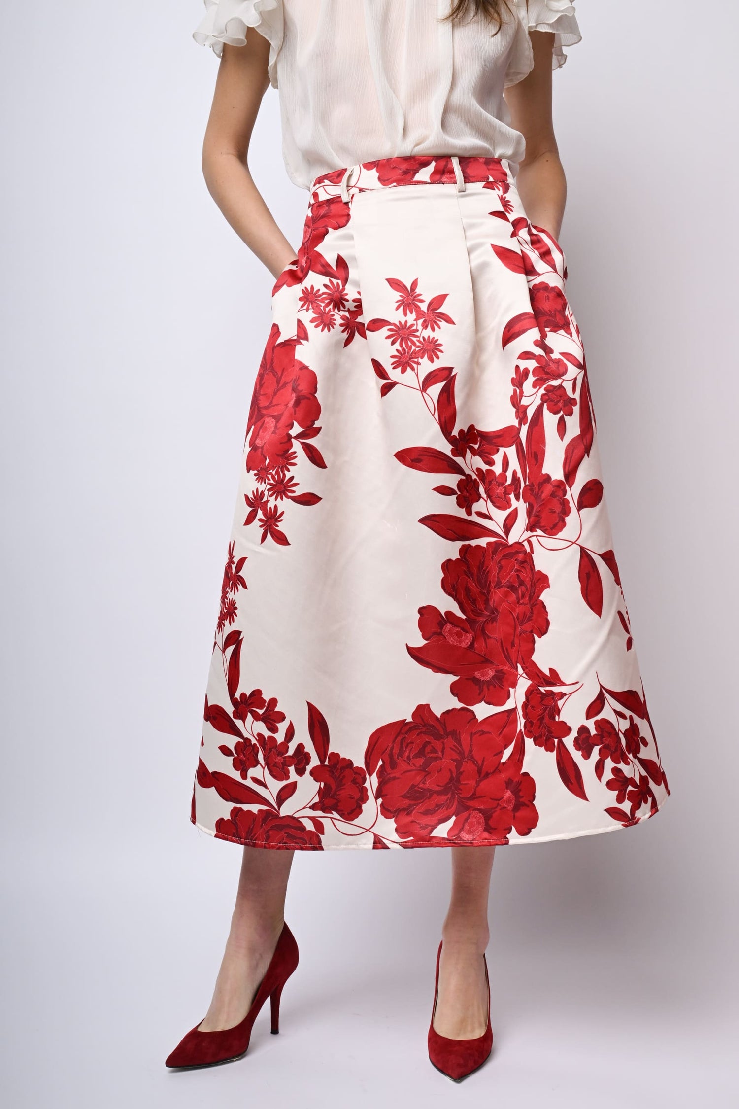 Gonna midi in raso a stampa floreale nei toni del rosso su fondo bianco con vita alta, passanti per cintura, tasche laterali, chiusura con zip al centro dietro e tagli svasato con pieghe.