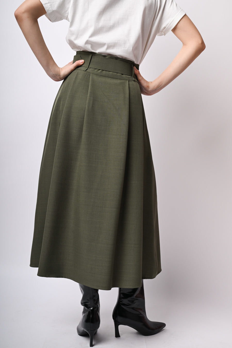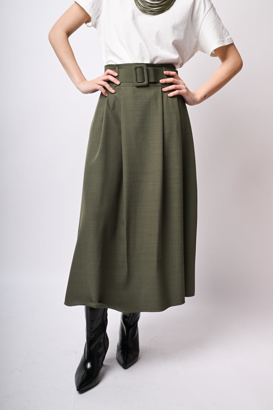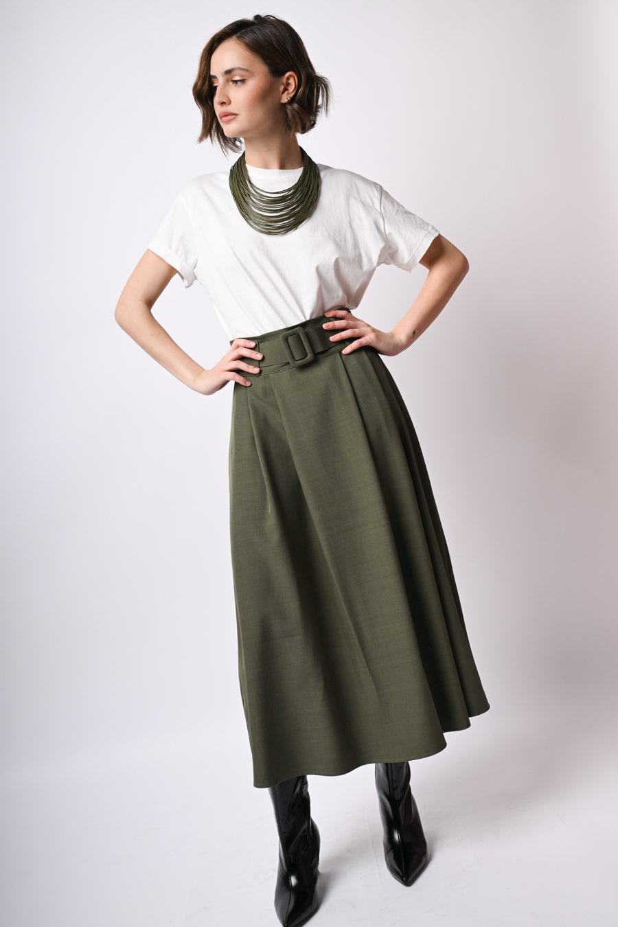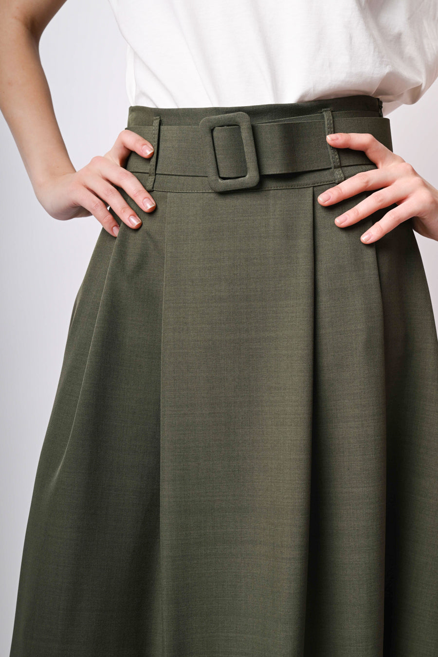 Gonna midi in tessuto stretch verde oliva con vita alta, cintura coordinata con fibbia rettangolare e taglio svasato con pieghe.