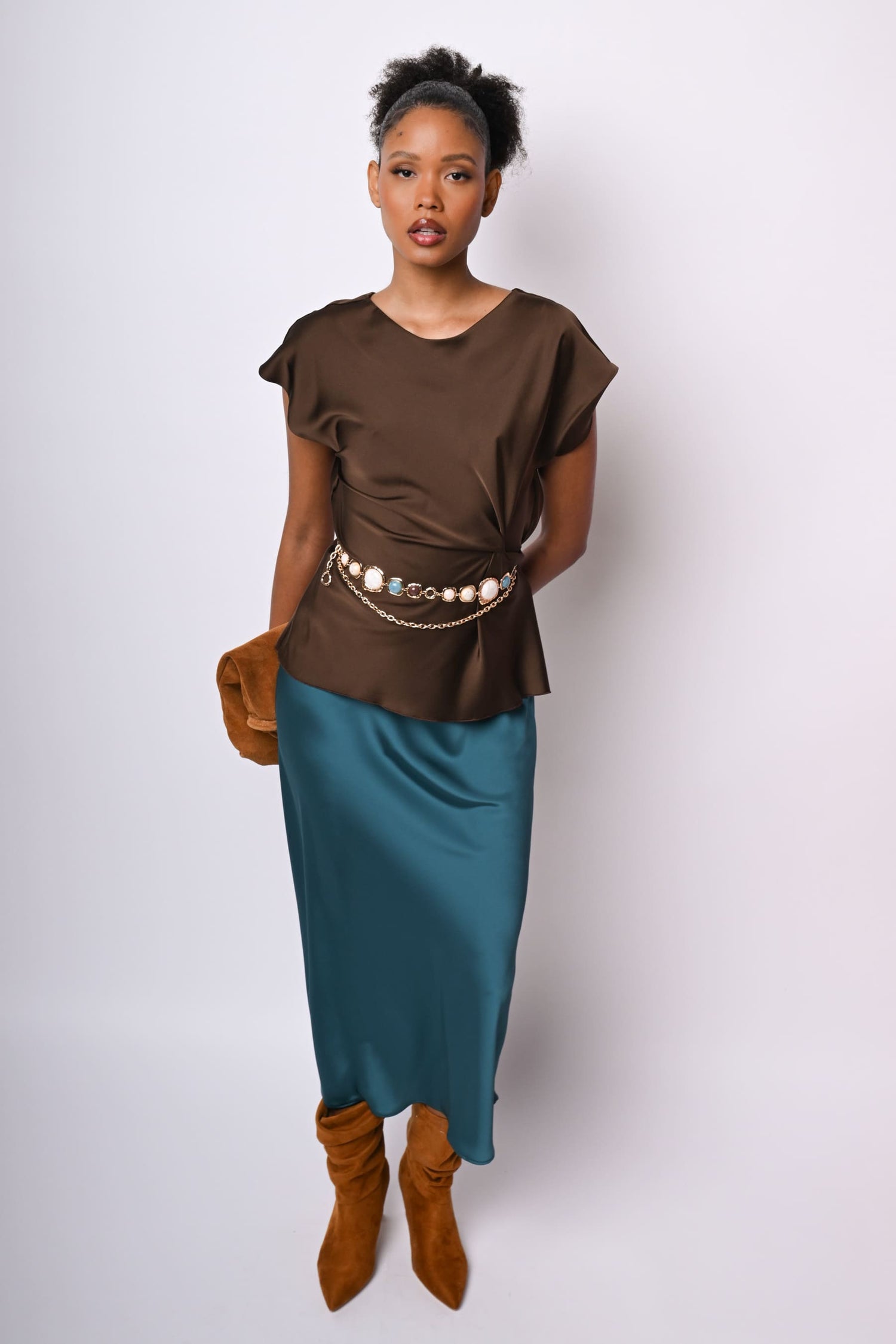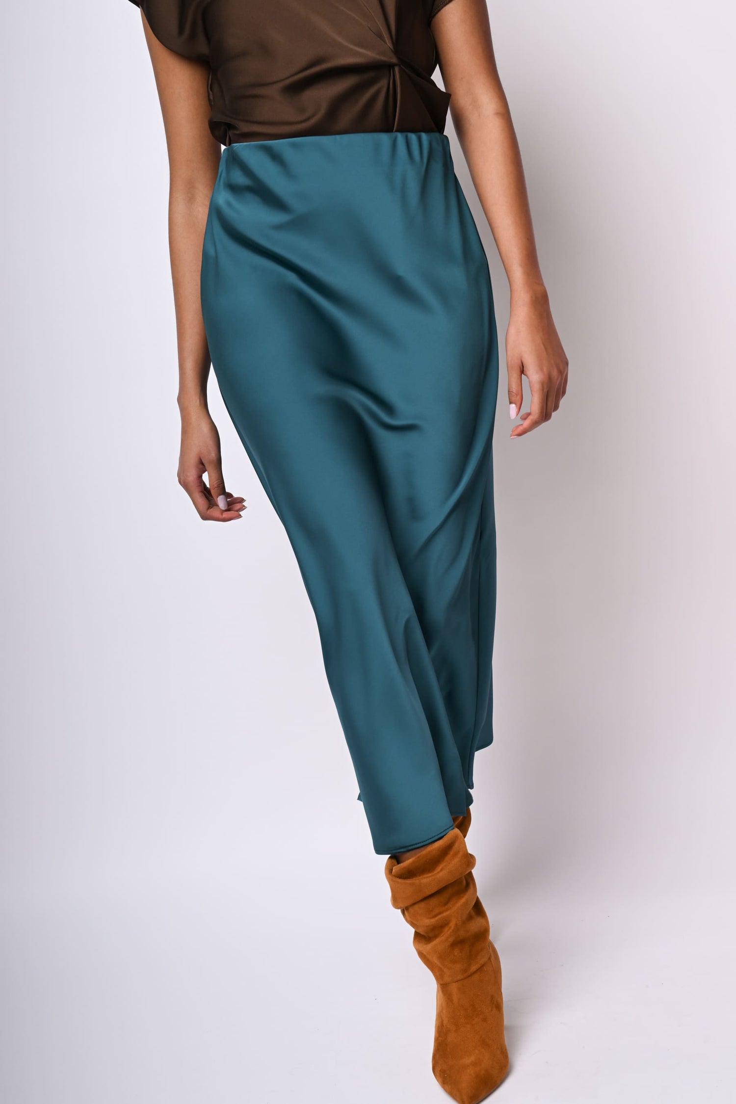 Gonna midi in raso blu petrolio con vita elasticizzata e taglio svasato.