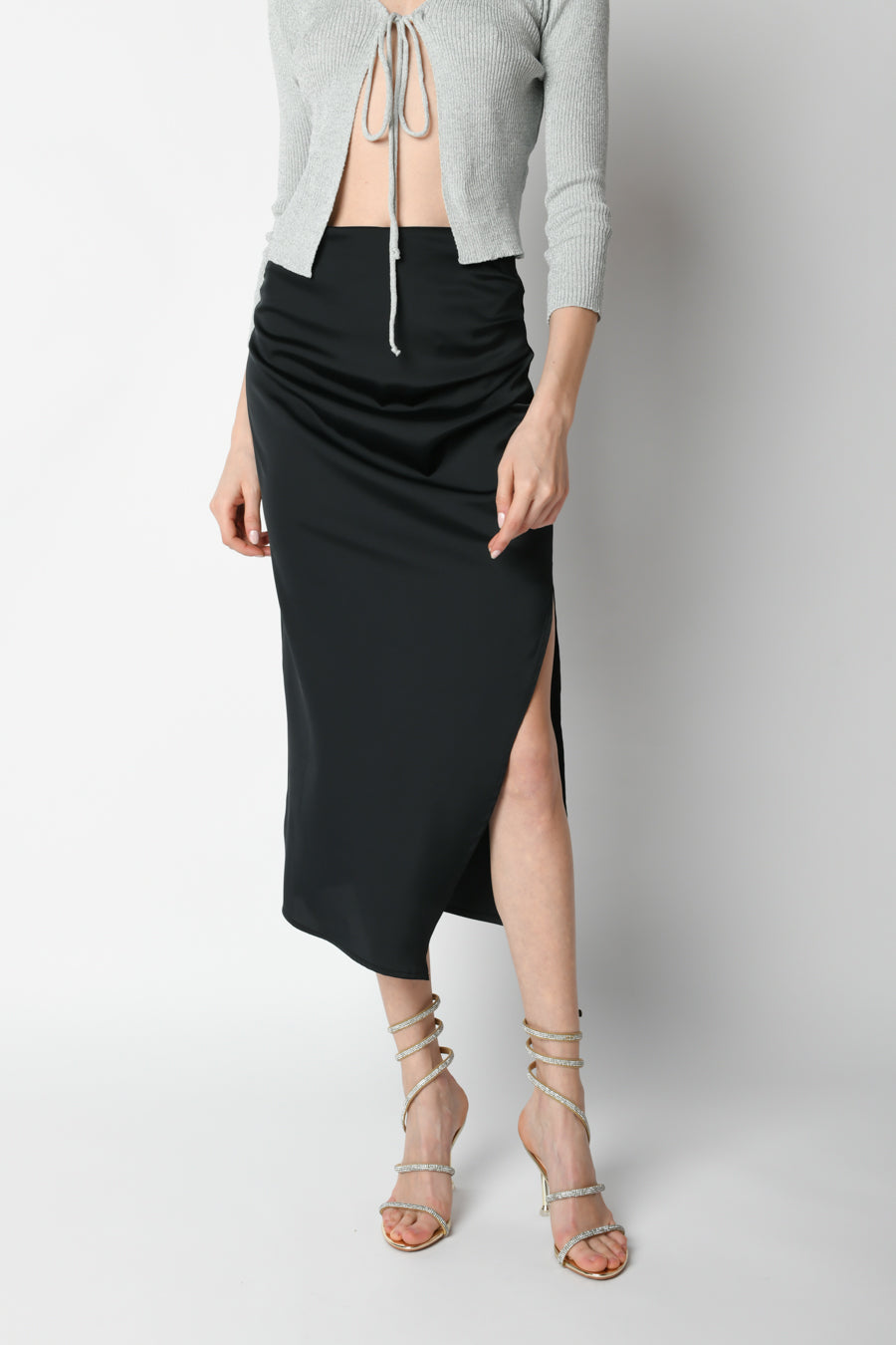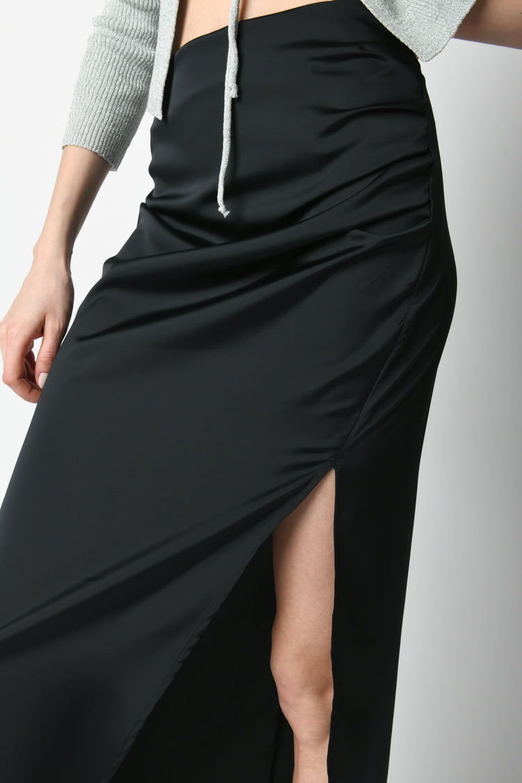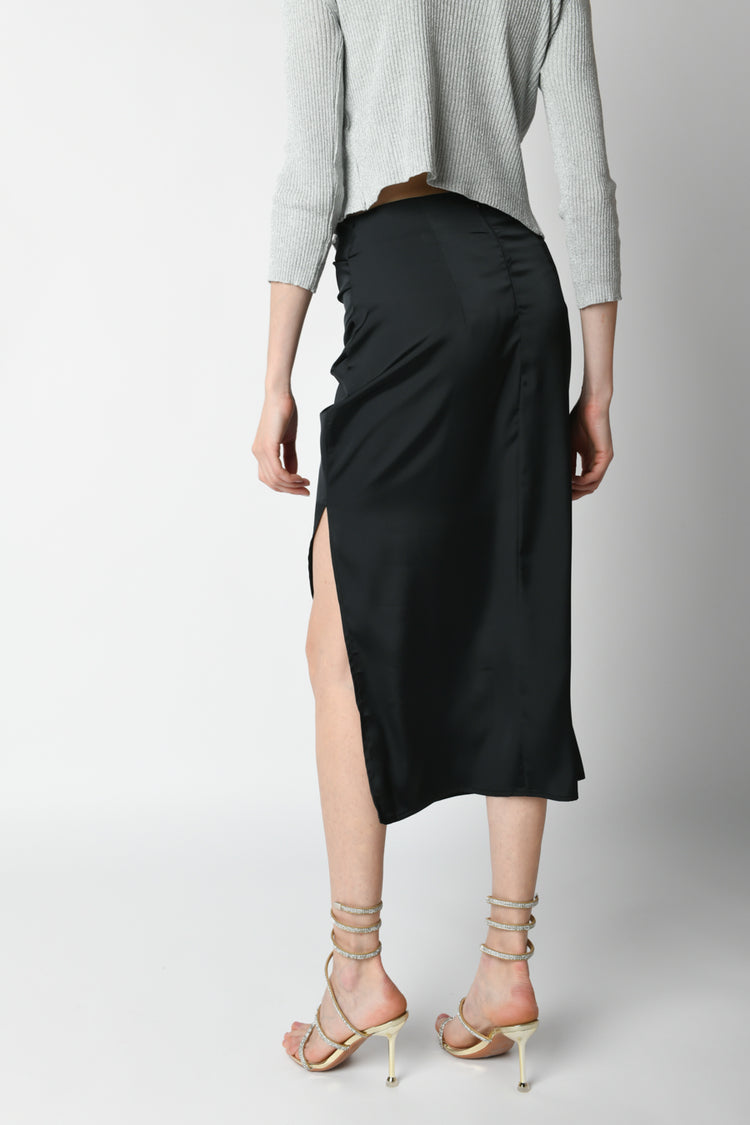 Gonna longuette in raso nero con chiusura laterale con zip, taglio dritto e spacco laterale.