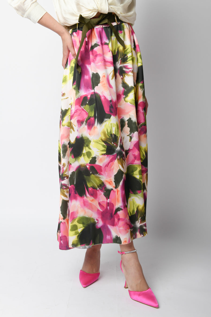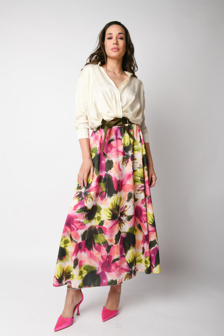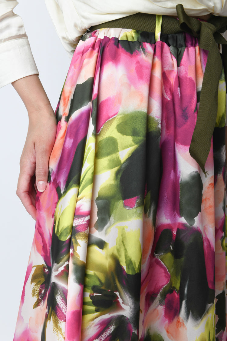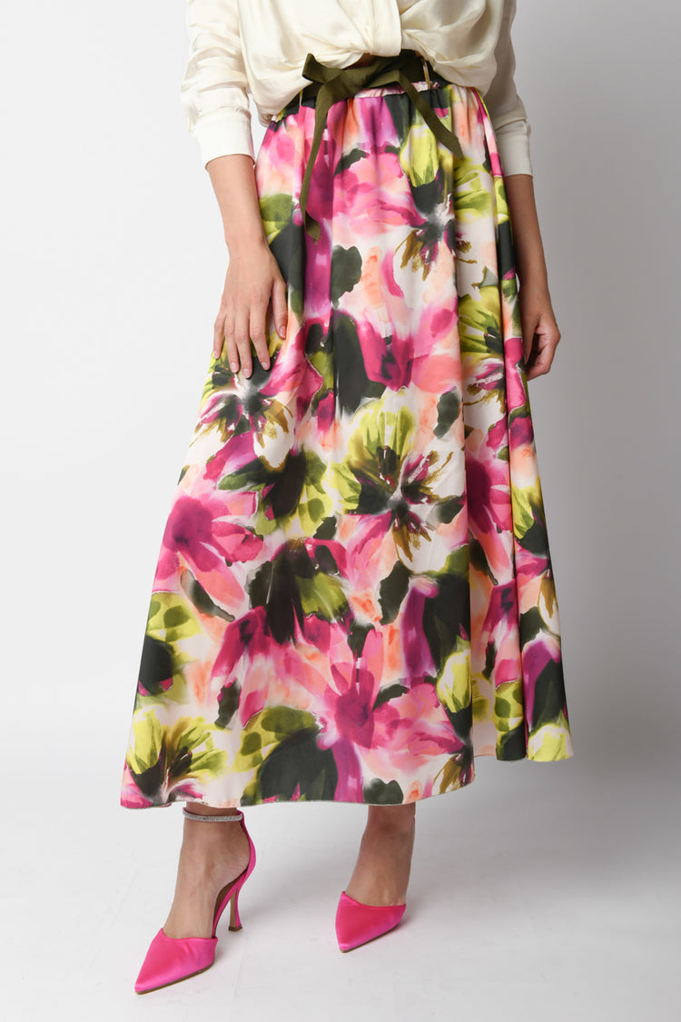 Gonna lunga e svasata a stampa floreale multicolor con vita elasticizzata e cintura in tessuto verde da annodare.