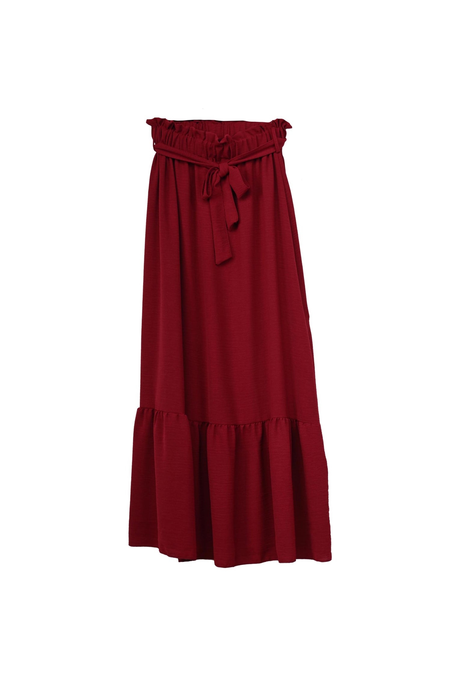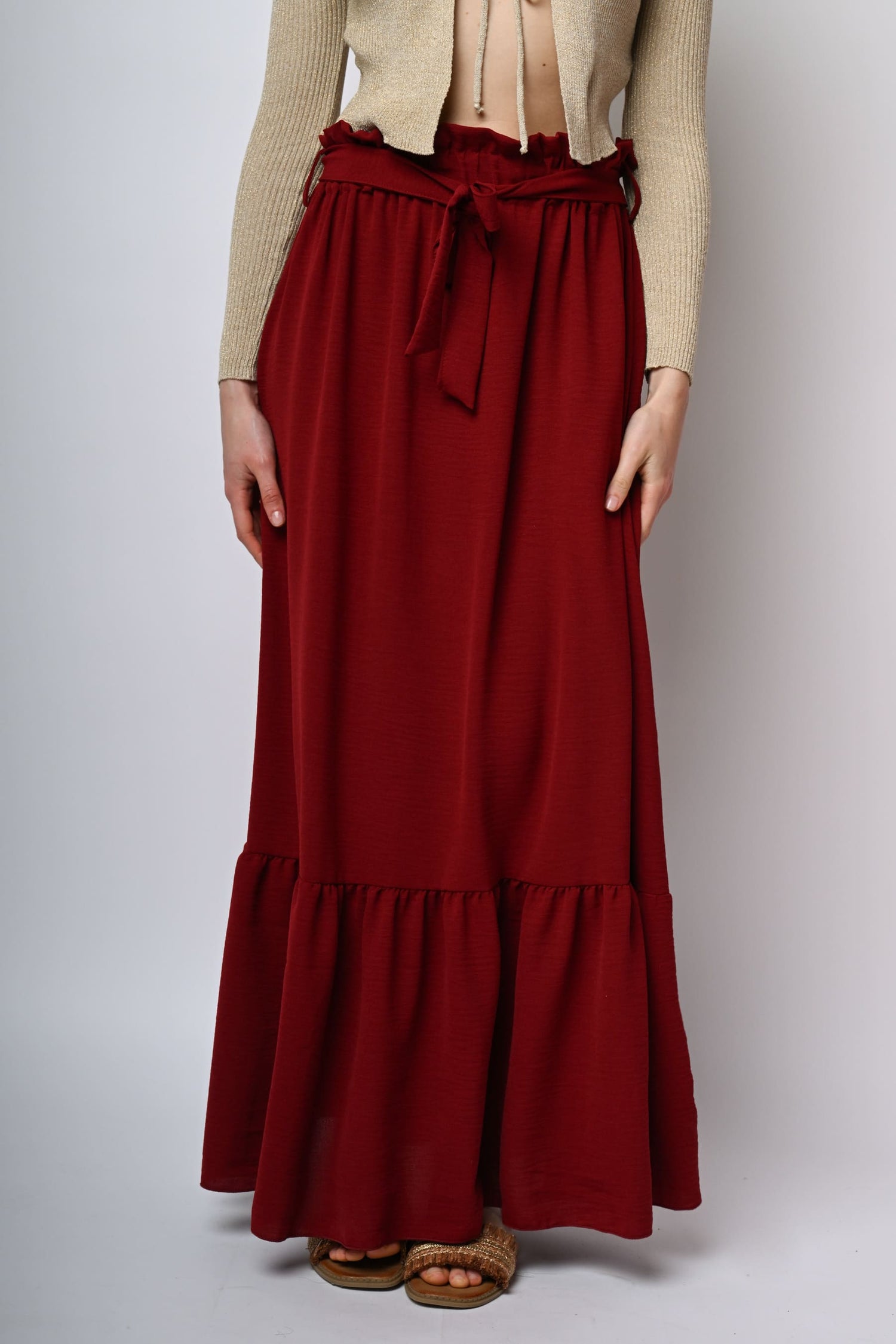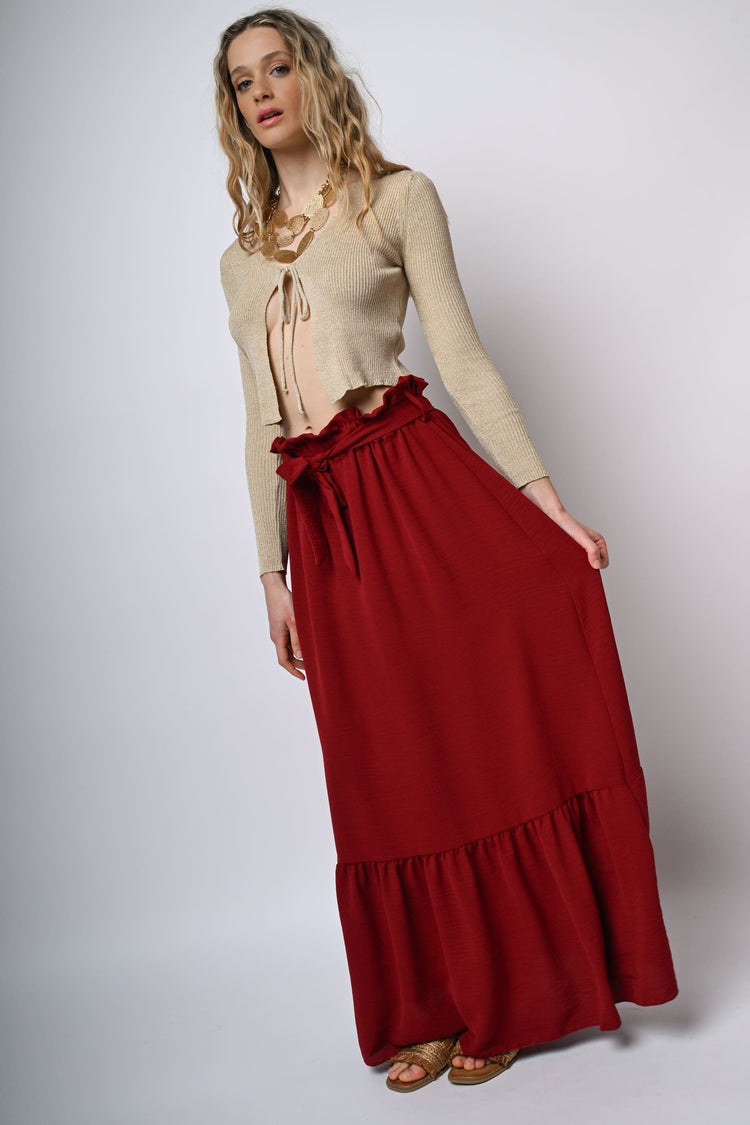 Gonna lunga in tessuto bordeaux con vita elasticizzata, passanti e cintura coordinata da annodare, taglio svasato e balza al fondo.