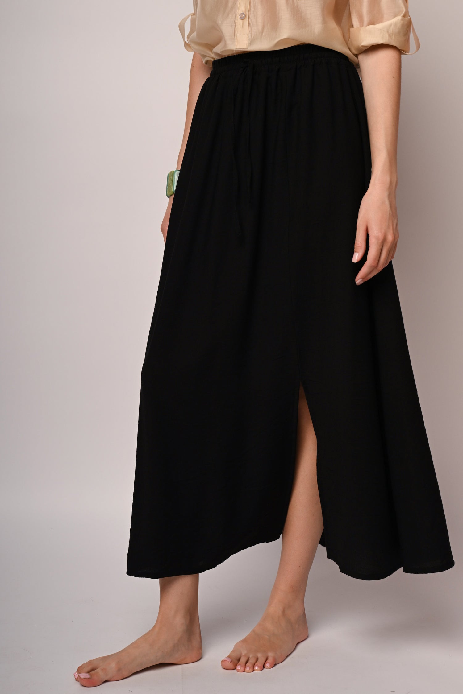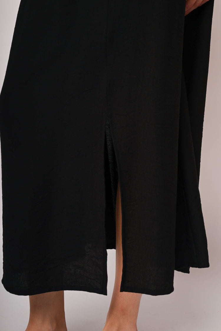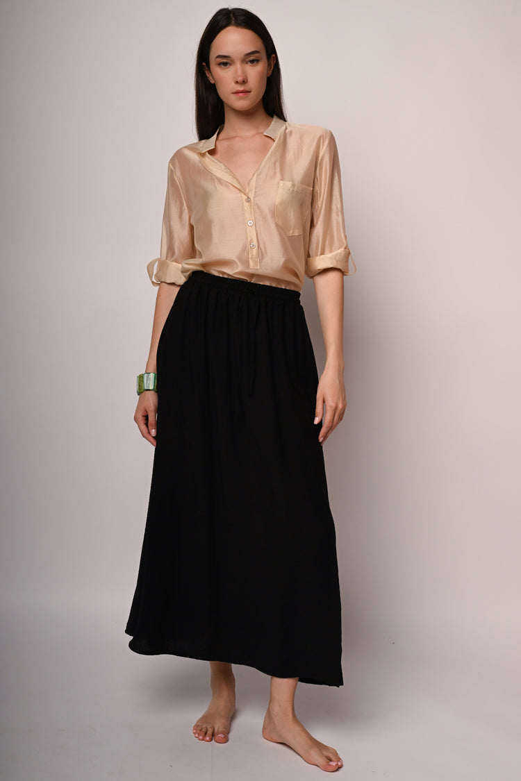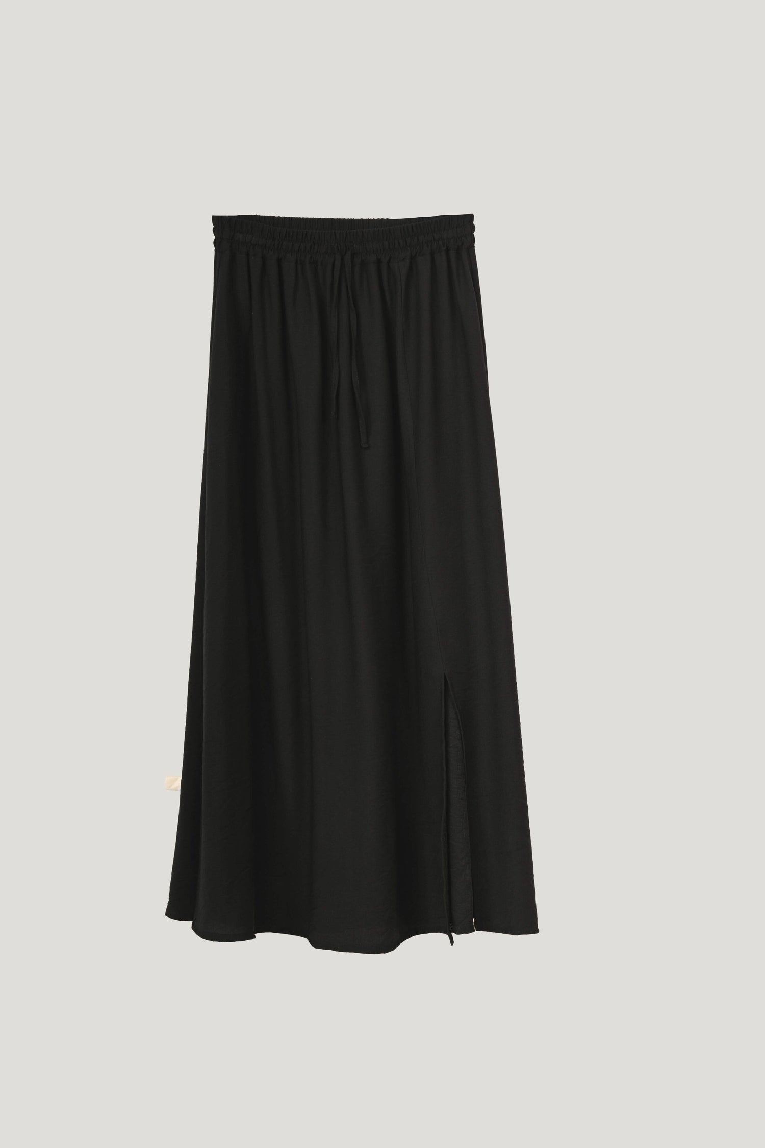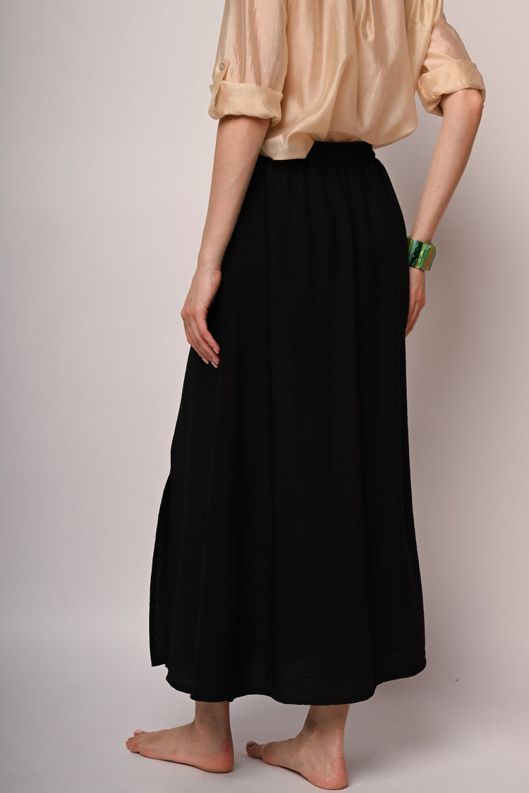 Gonna lunga misto viscosa nera con vita elasticizzata, taglio svasato e spacco frontale.