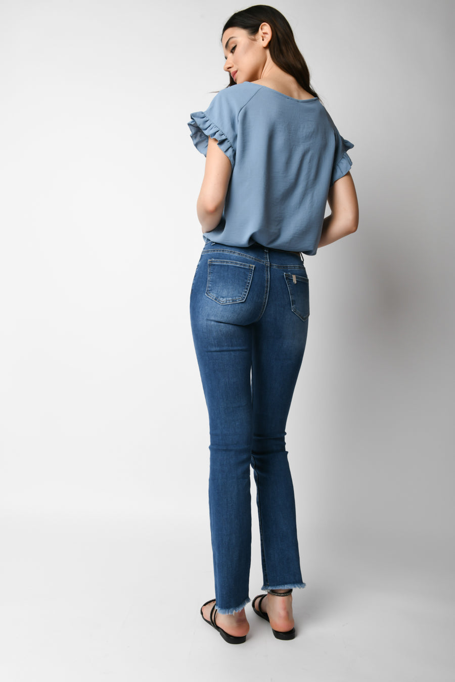 Jeans in denim stretch blu con passanti per cintura, chiusura con bottoni gioiello, taglio cinque tasche, tab-logo sulla tasca posteriore, gamba leggermente svasata e orlo sfrangiato.