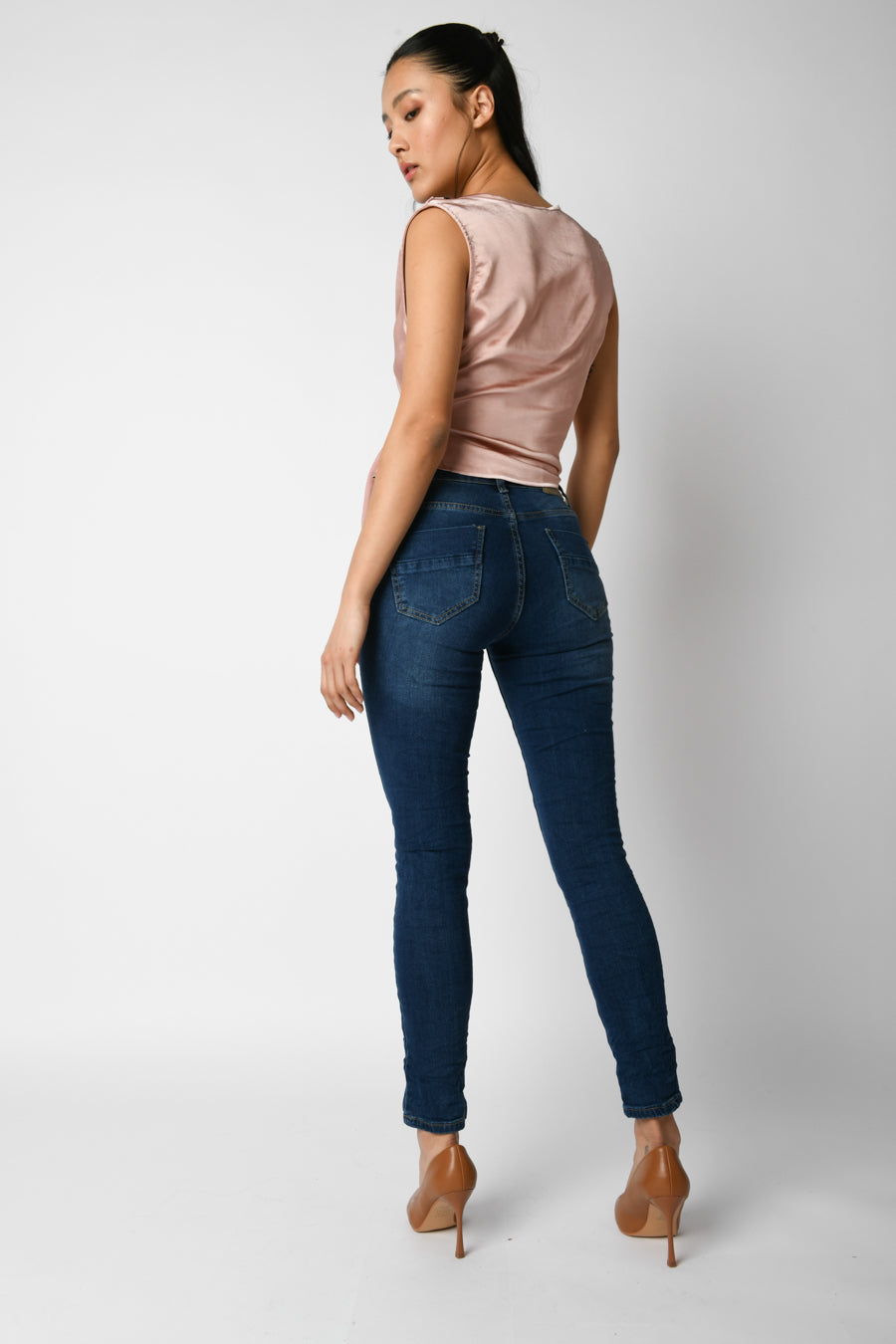 Jeans skinny in denim stretch blu con passanti per cintura, chiusura con bottoni gioiello, taglio cinque tasche ed etichetta-logo sul retro.