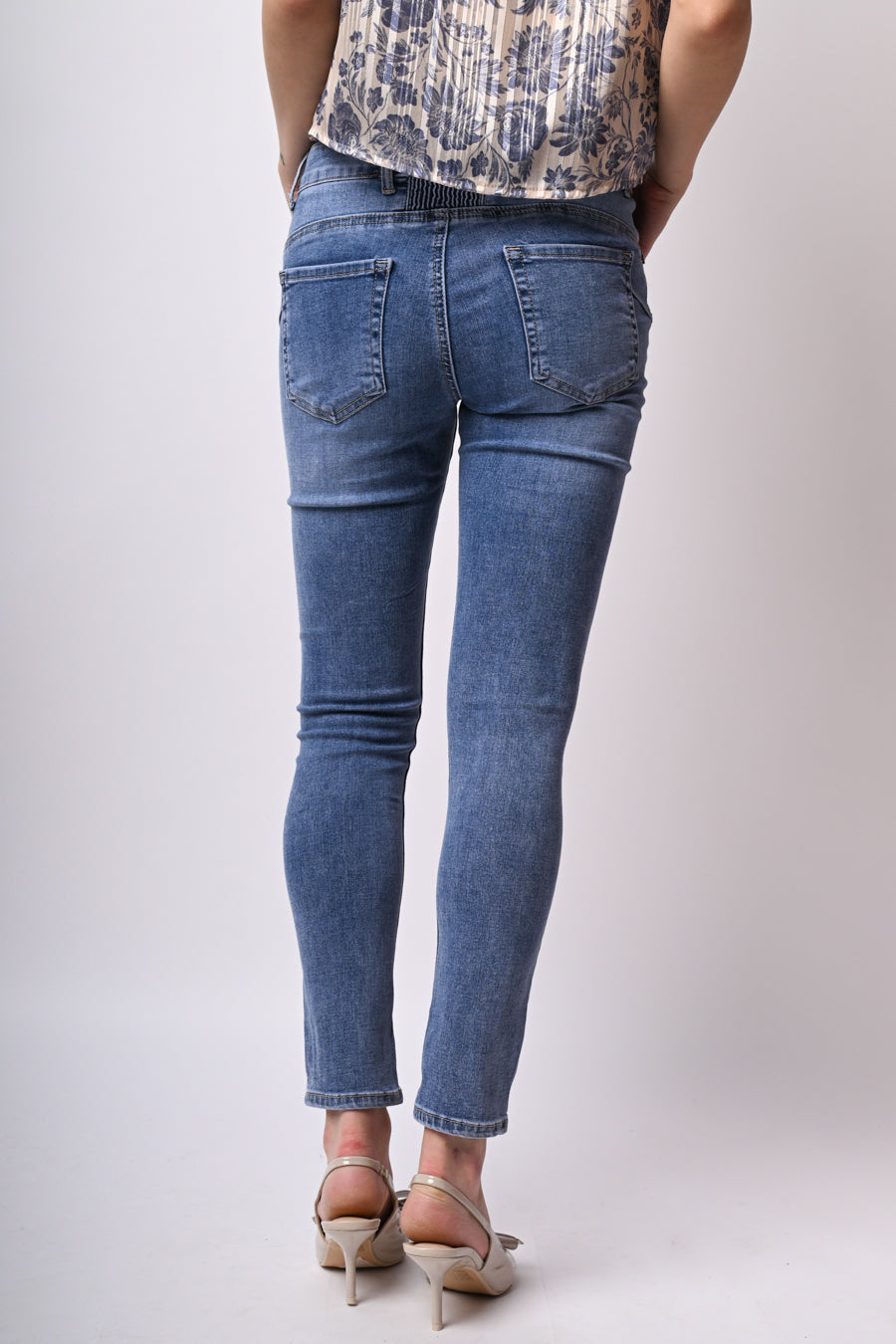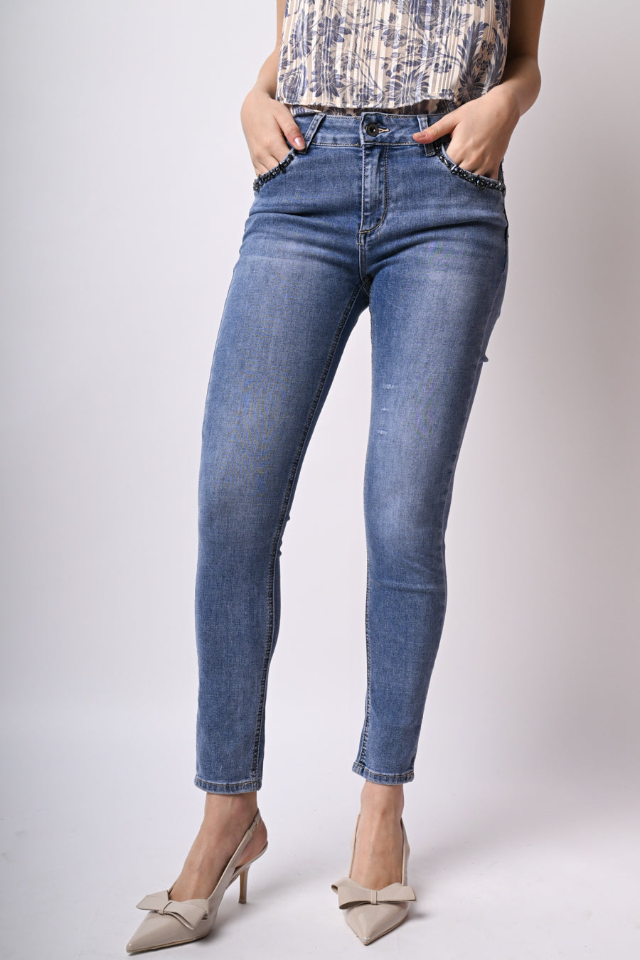 Jeans slim-fit in denim stretch misto cotone azzurro con passanti per cintura, chiusura con bottone e zip, inserto elasticizzato al centro dietro, taglio cinque tasche e strass decorativi lungo i profili delle tasche frontali.