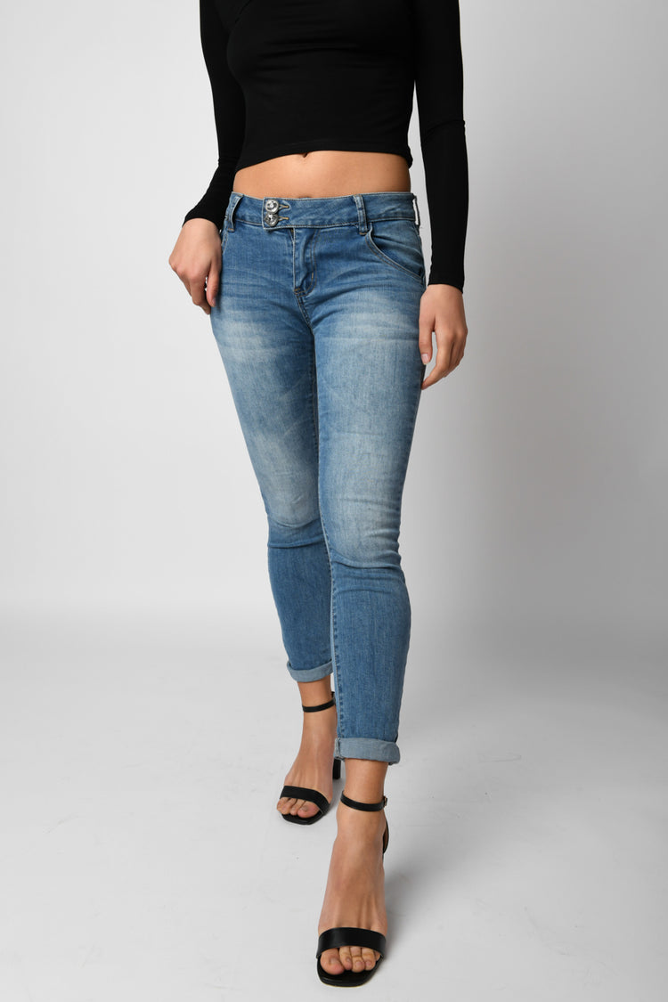Jeans skinny in denim stretch azzurro slavato a vita bassa con passanti per cintura, chiusura con bottoni e zip, taglio quattro tasche, etichetta-logo sul retro e risvolto al fondo.