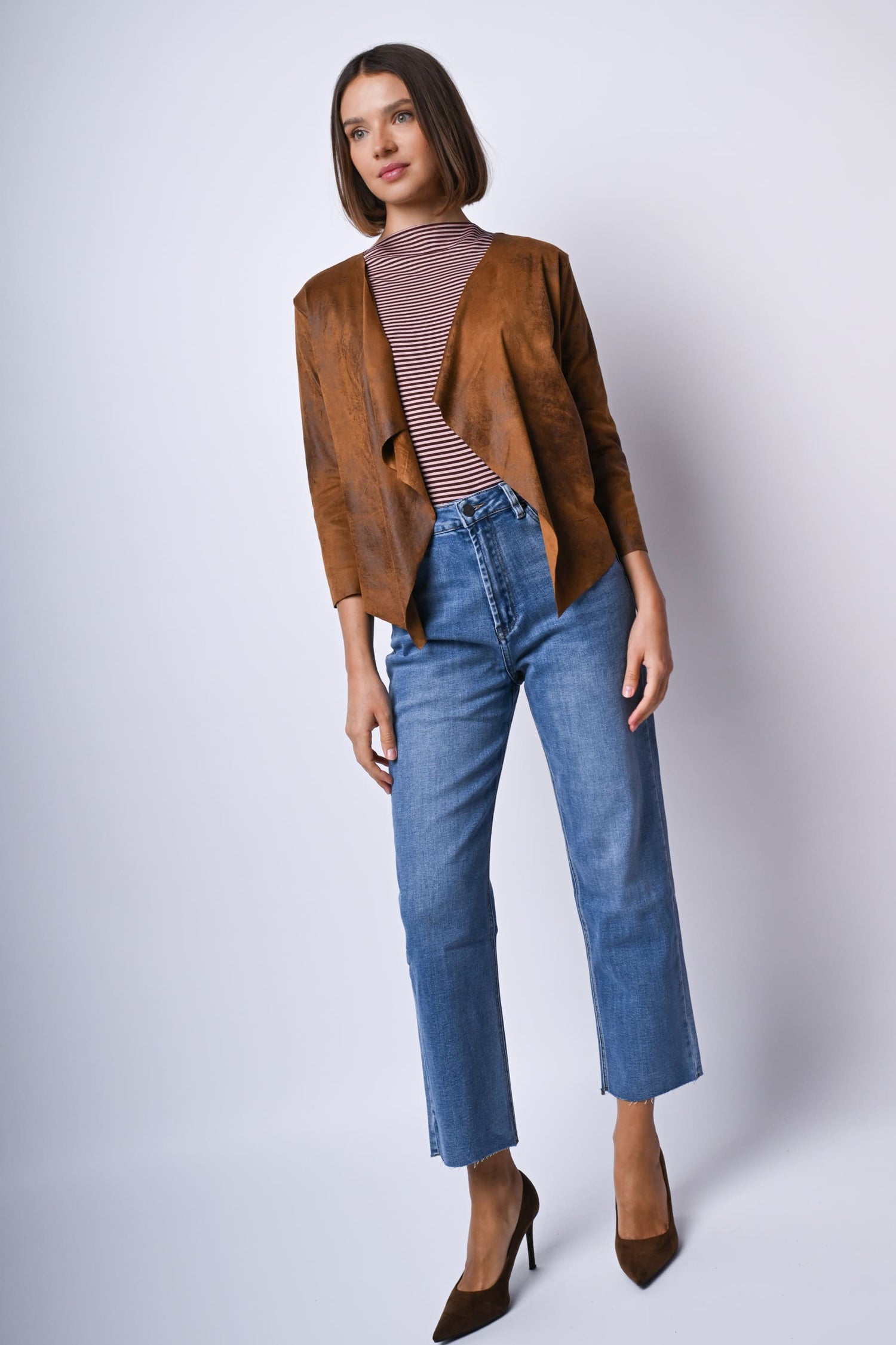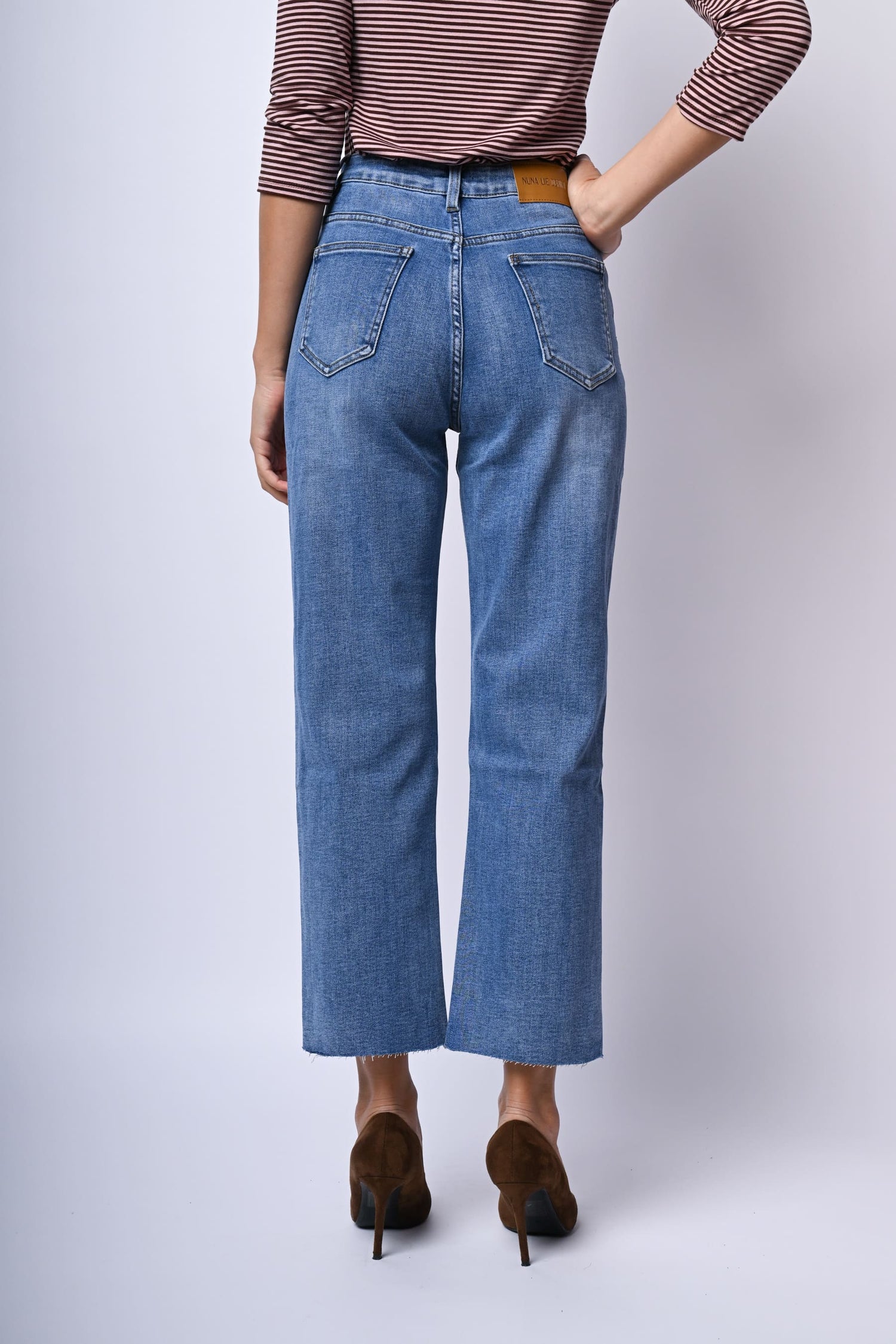 Jeans in denim stretch blu chiaro con passanti per cintura, chiusura con bottone e zip, taglio cinque tasche, gamba ampia e dritta, etichetta con logo sul retro e orli a taglio vivo.