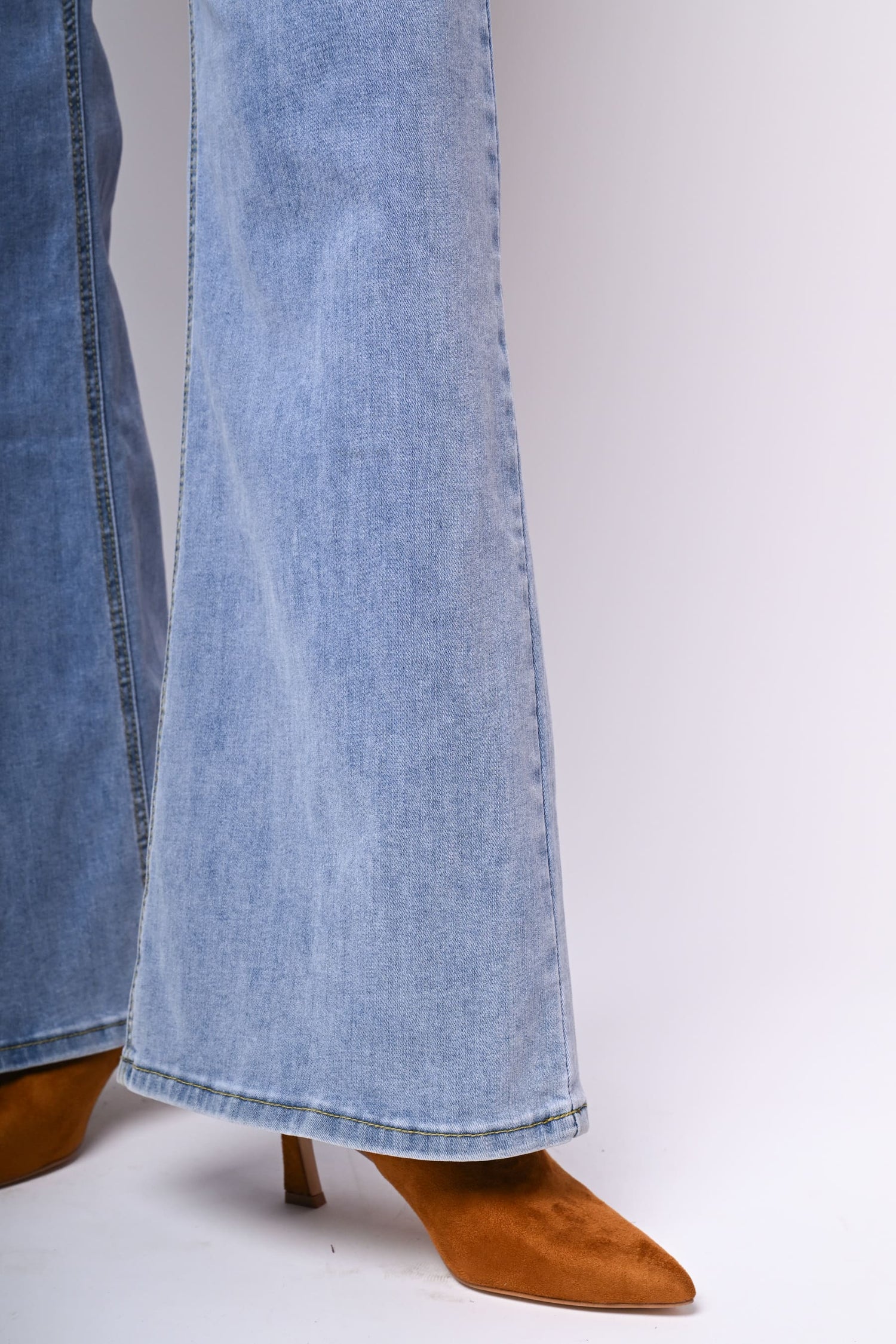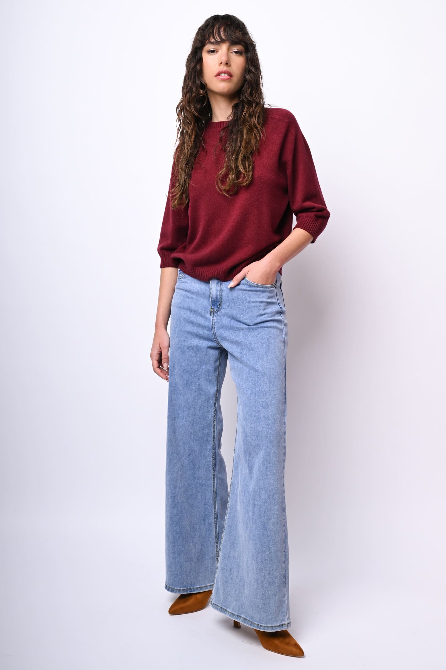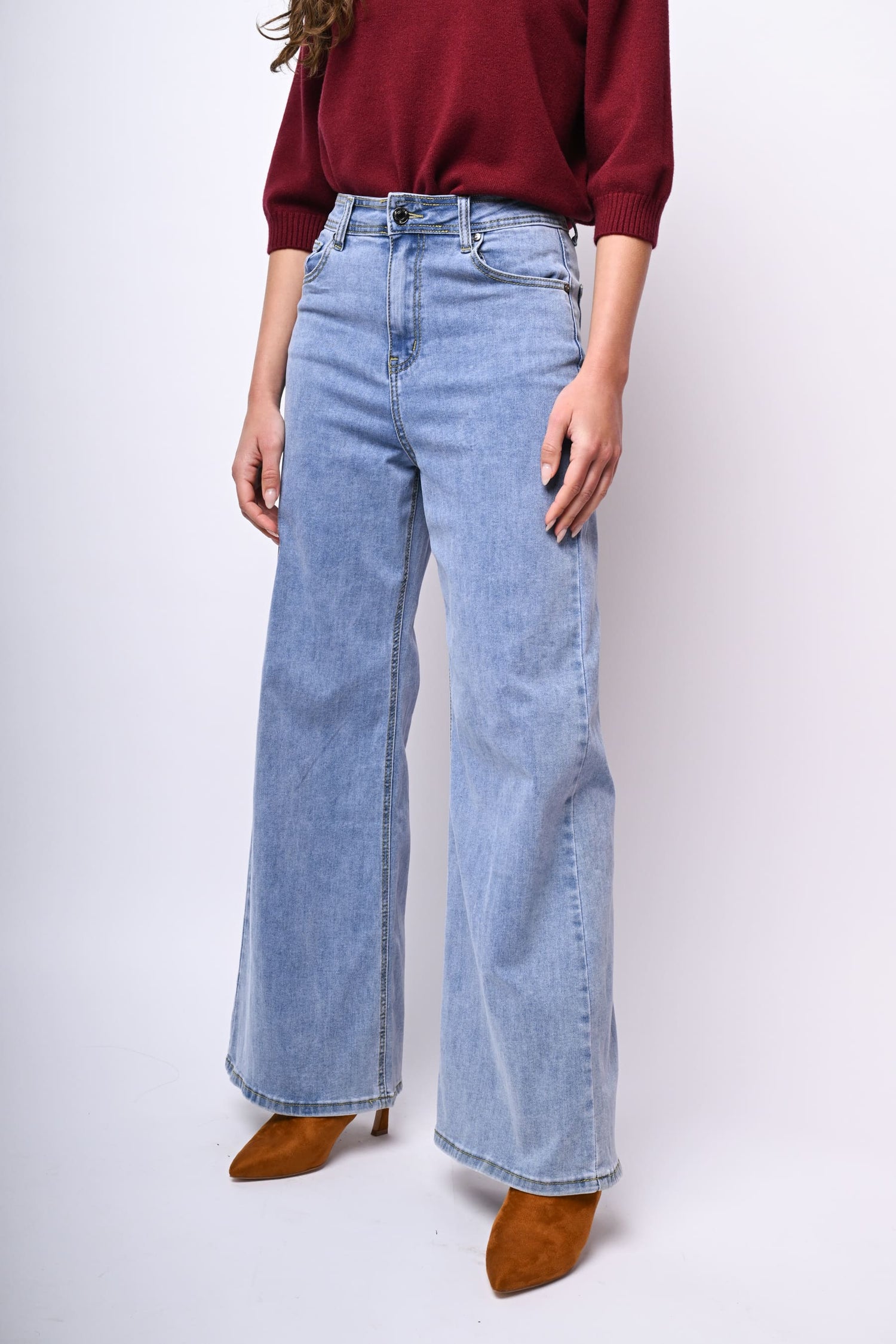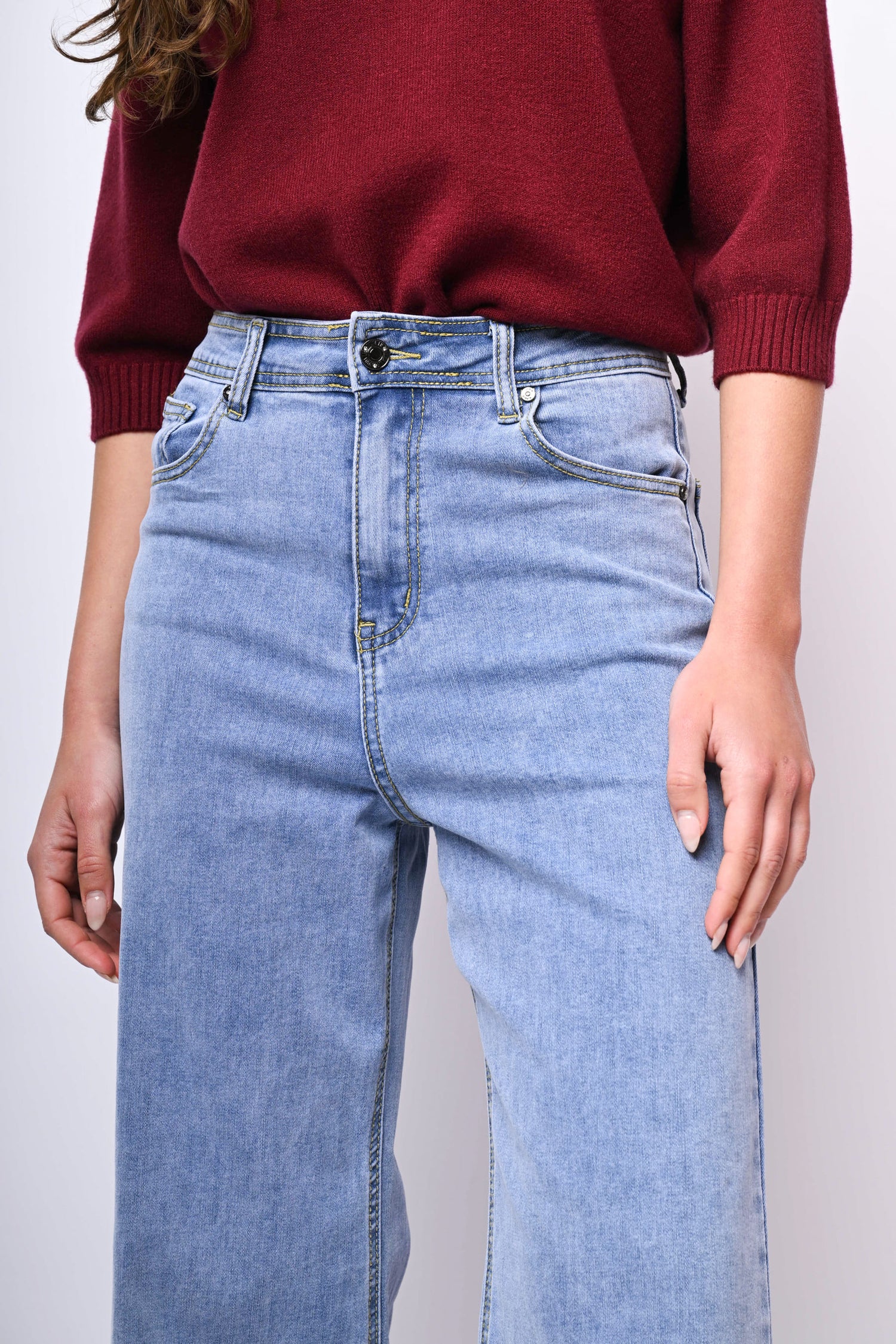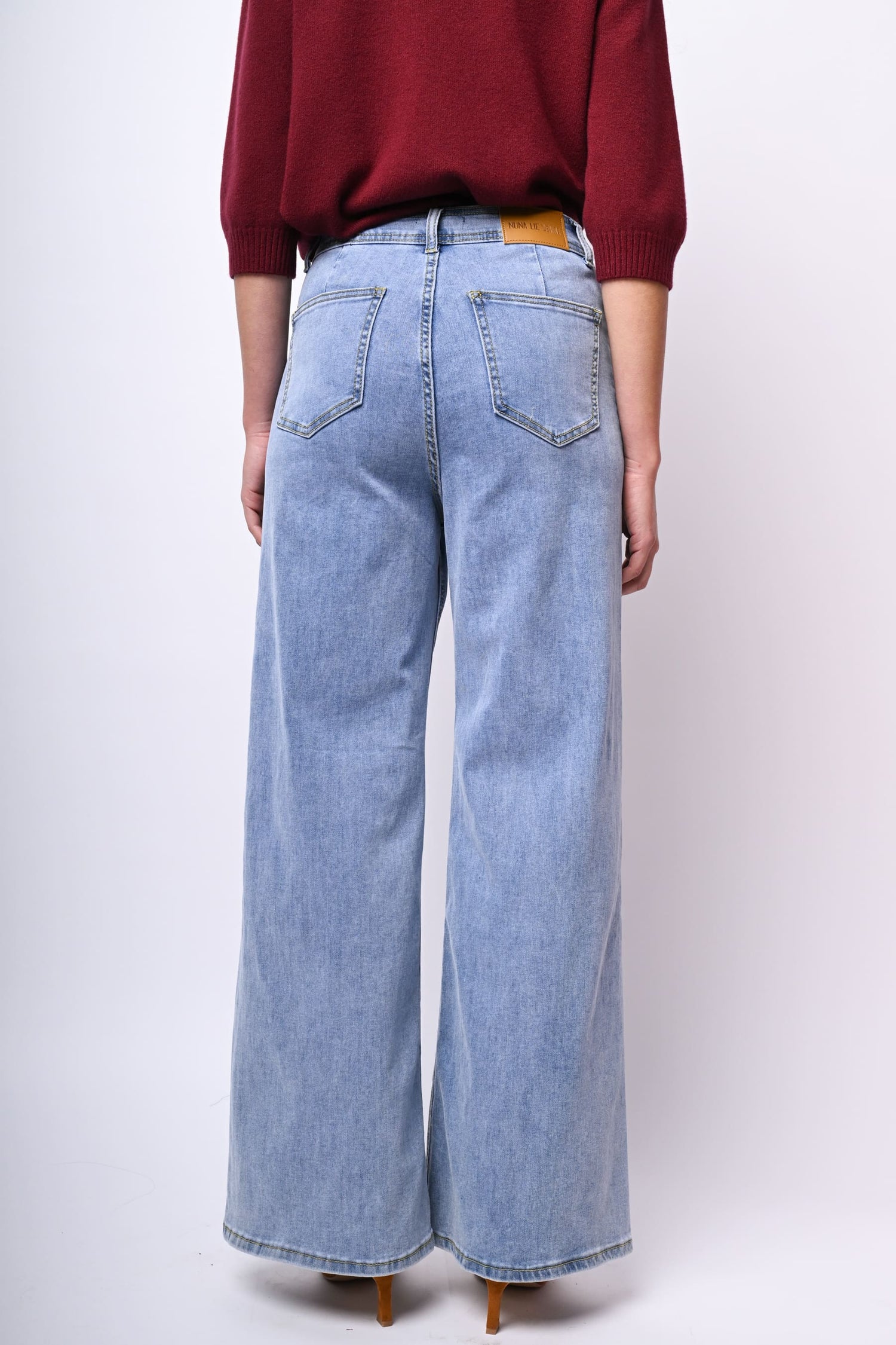 Jeans a gamba ampia in denim stretch azzurro con passanti per cintura, chiusura con bottone e zip, taglio cinque tasche ed etichetta con logo sul retro.