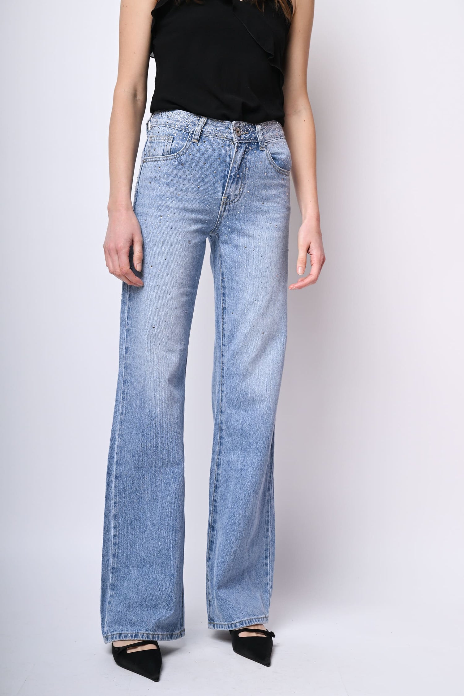 Jeans a gamba dritta in denim stretch azzurro con passanti per cintura, chiusura con bottone e zip, taglio cinque tasche e decorazione strass sulla parte alta.
