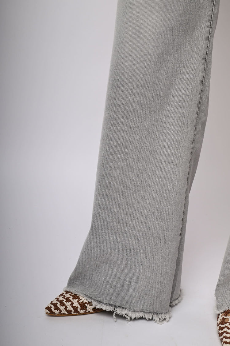 Jeans in denim stretch grigio chiaro con vita alta, passanti per cintura, chiusura con bottone e zip, taglio cinque tasche, gamba ampia e orlo sfrangiato.