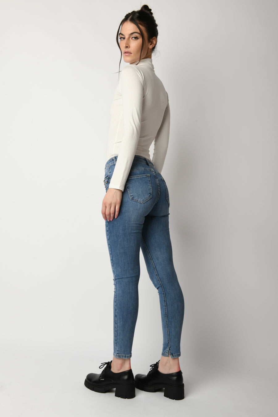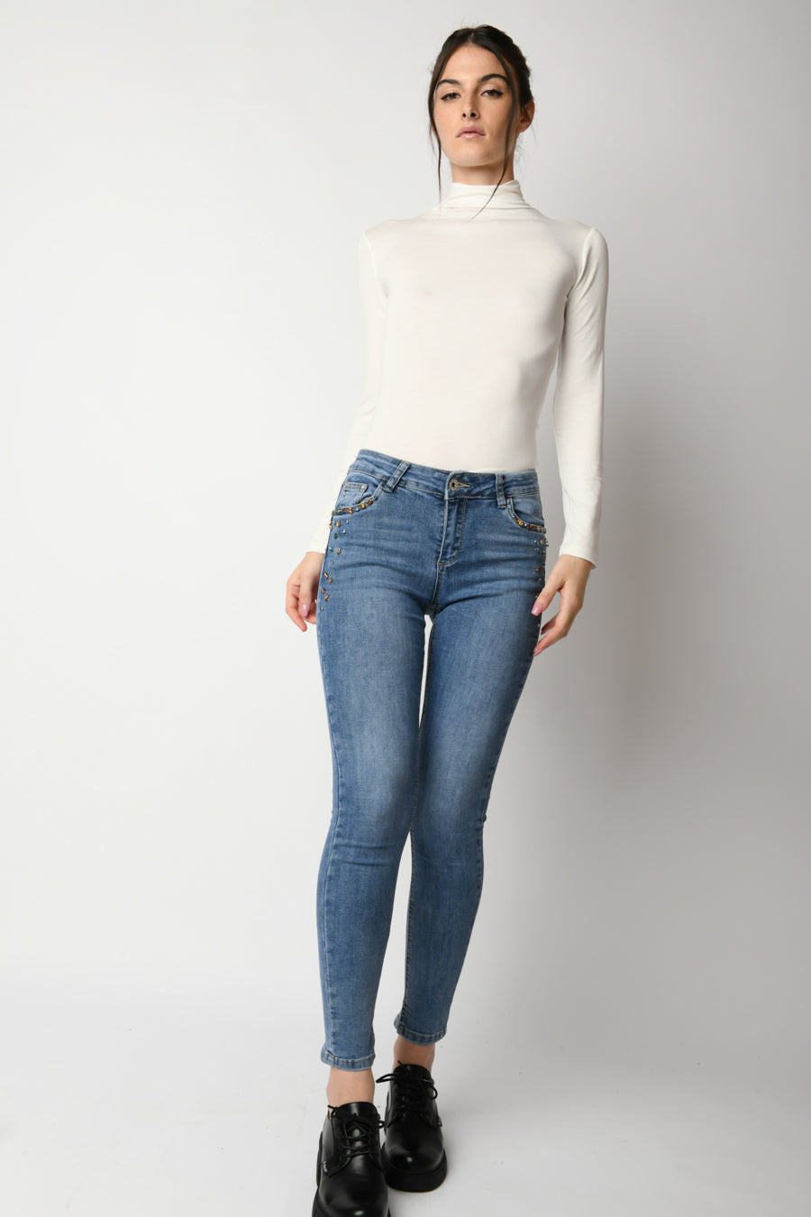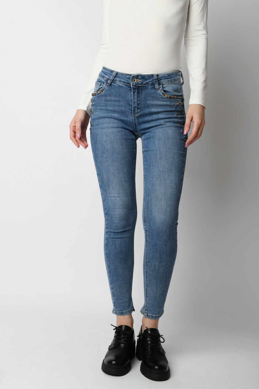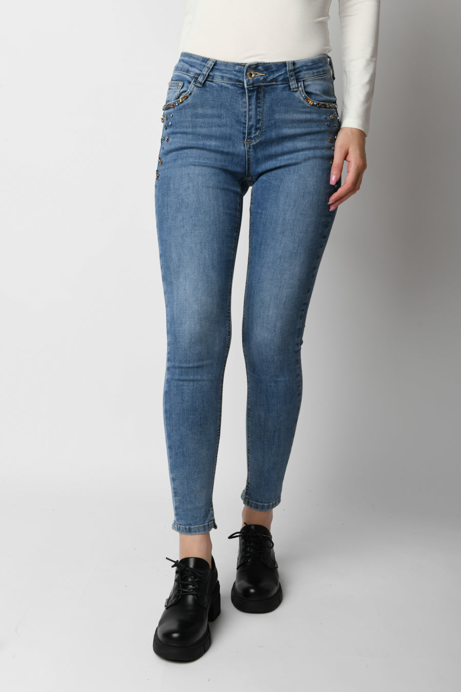 Jeans skinny in denim di cotone stretch blu con passanti in vita, chiusura con bottone e zip, taglio cinque tasche, strass multicolor decorativi sul davanti ed etichetta con logo sul retro.