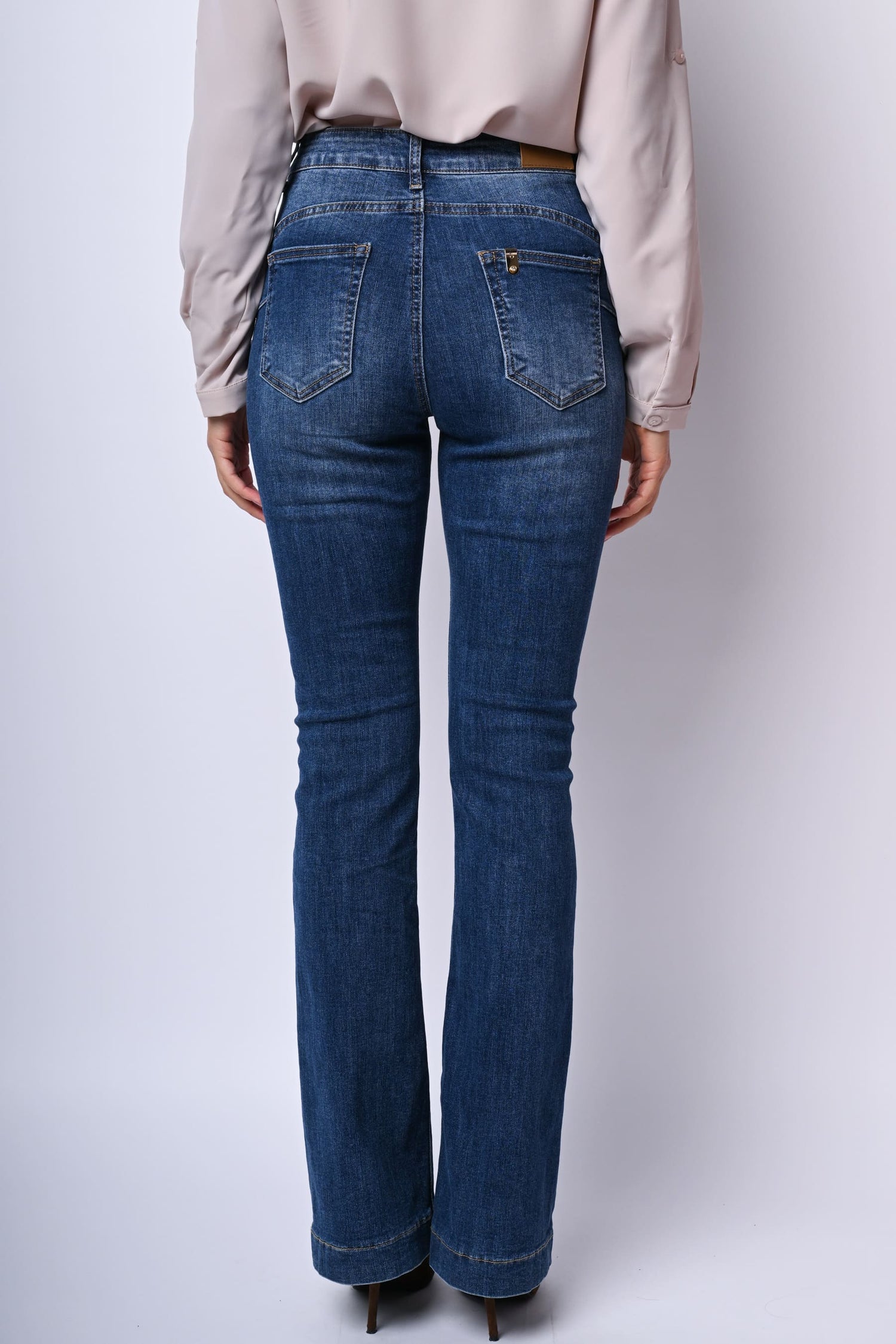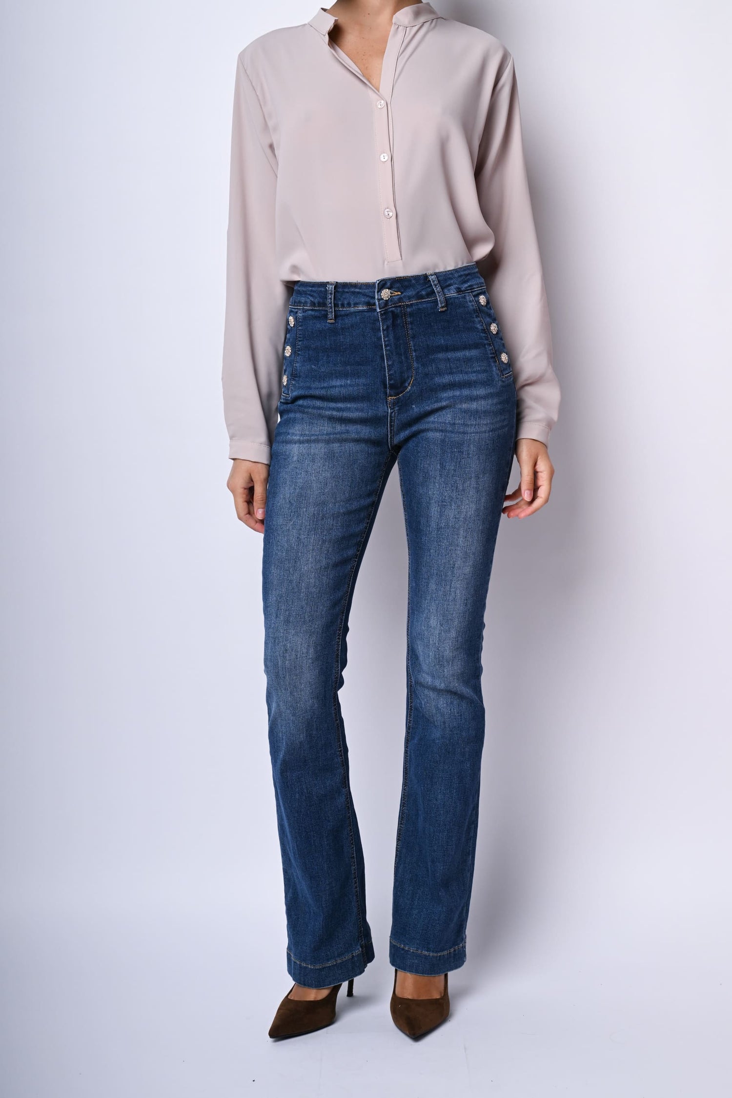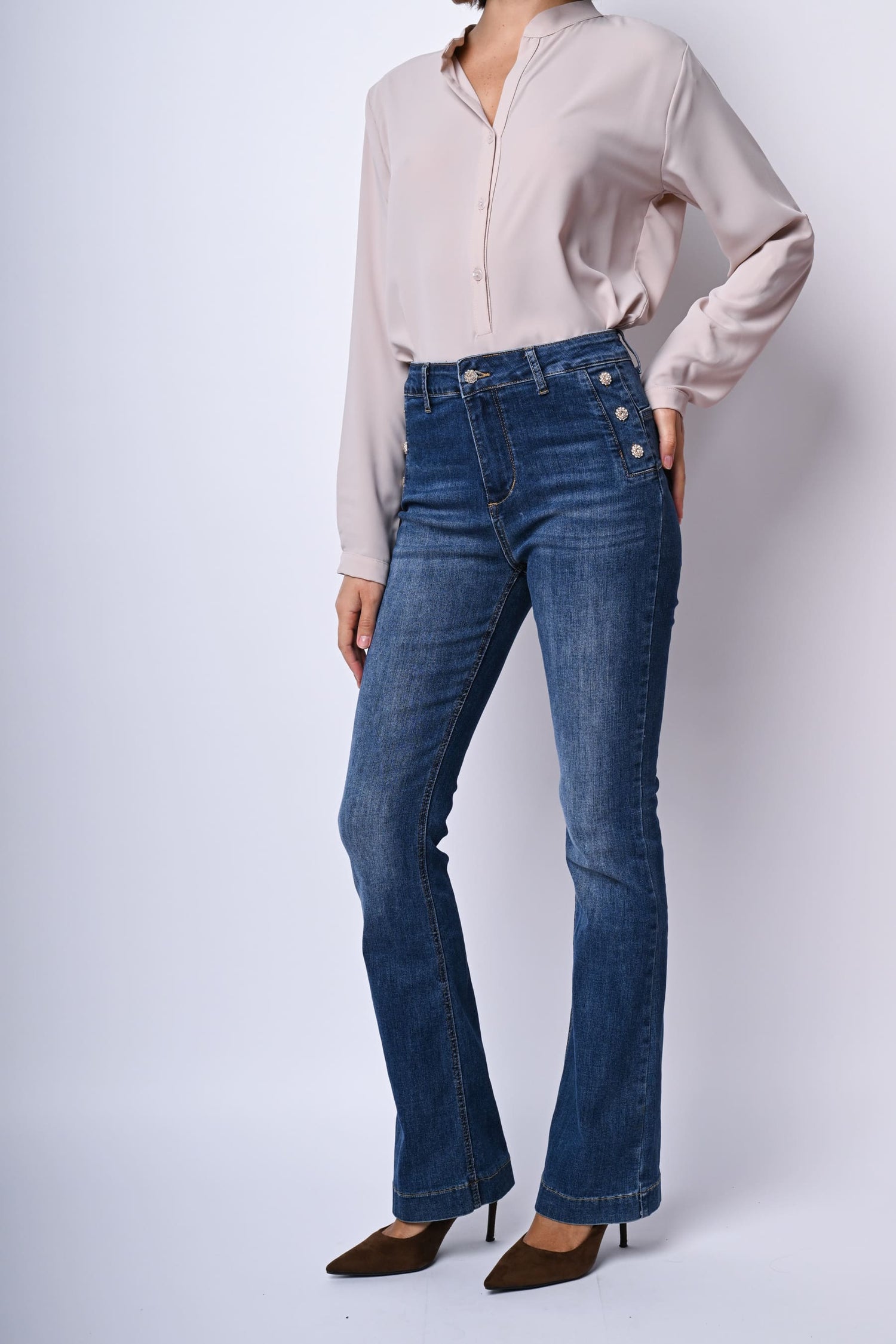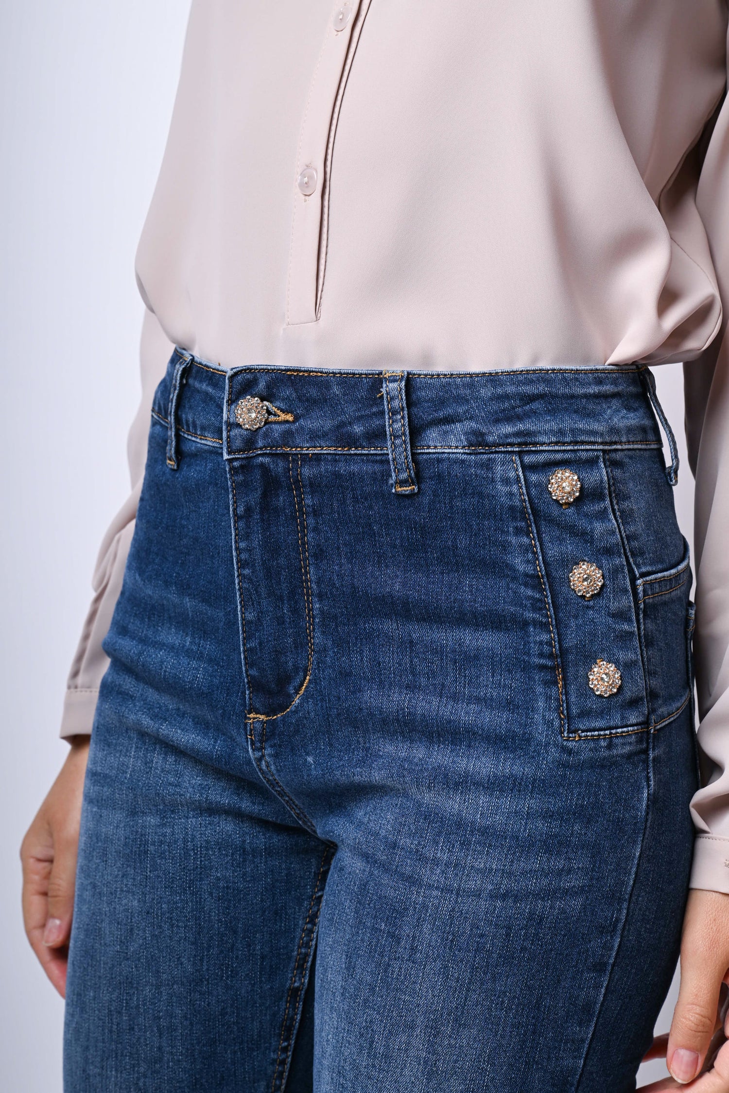 Jeans in denim stretch misto cotone blu con vita alta, passanti per cintura, chiusura con bottone e zip, tasche laterali con bottoni gioiello floreali, tasche applicate sul retro, etichetta con logo posteriore e gamba svasata.