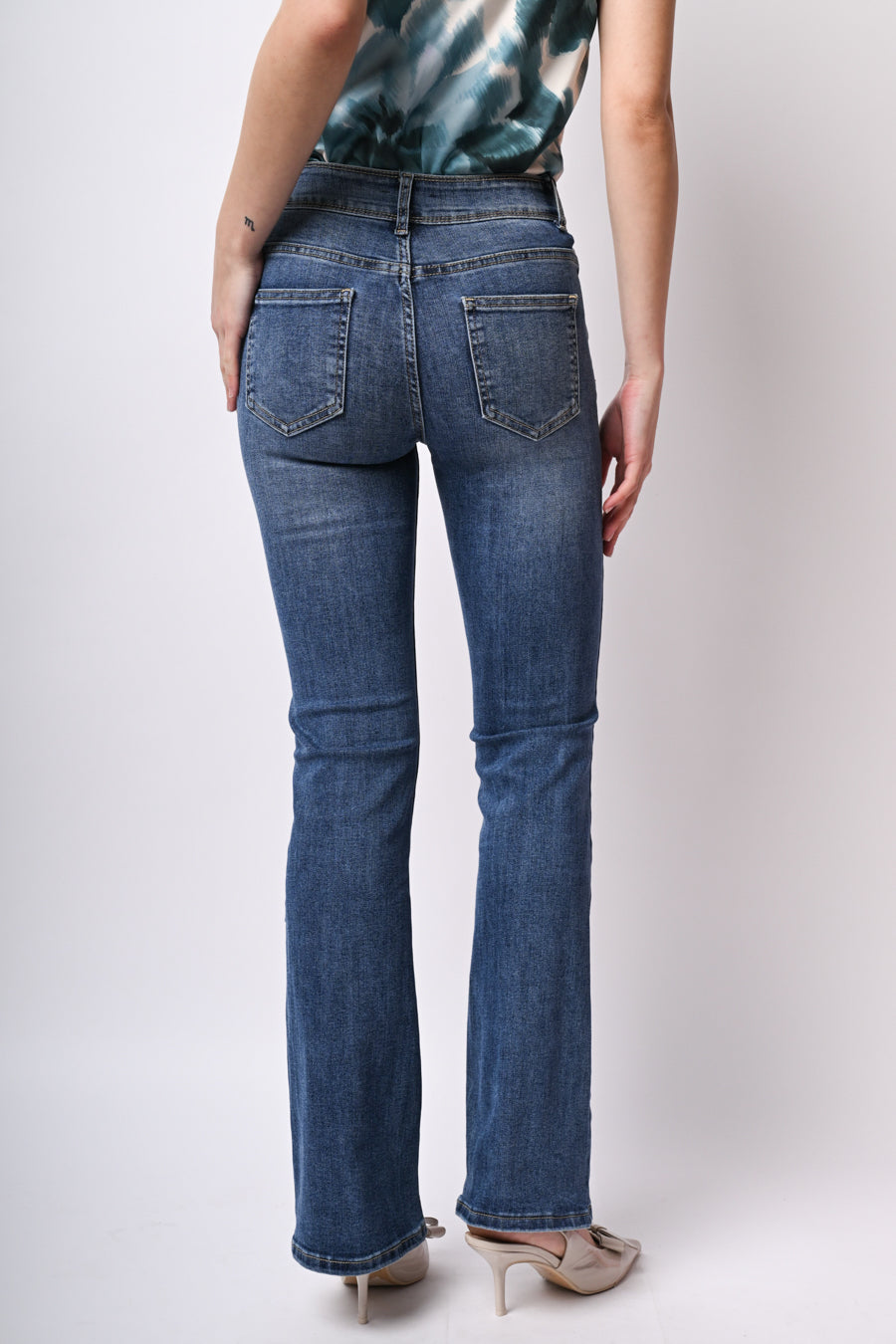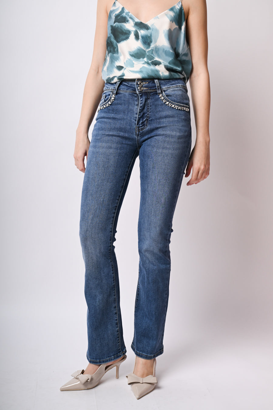 Jeans in denim stretch misto cotone blu con passanti per cintura, chiusura con bottoni e zip, taglio cinque tasche, strass decorativi lungo le tasche frontali e gamba svasata.