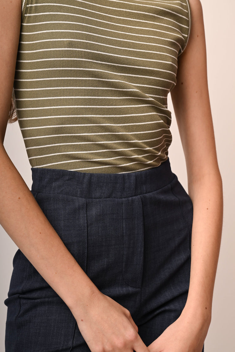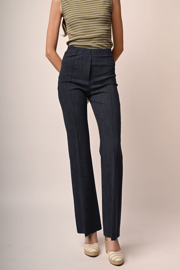 Pantaloni misto viscosa stretch blu scuro mélange con vita elasticizzata, gamba svasata e nervatura centrale.