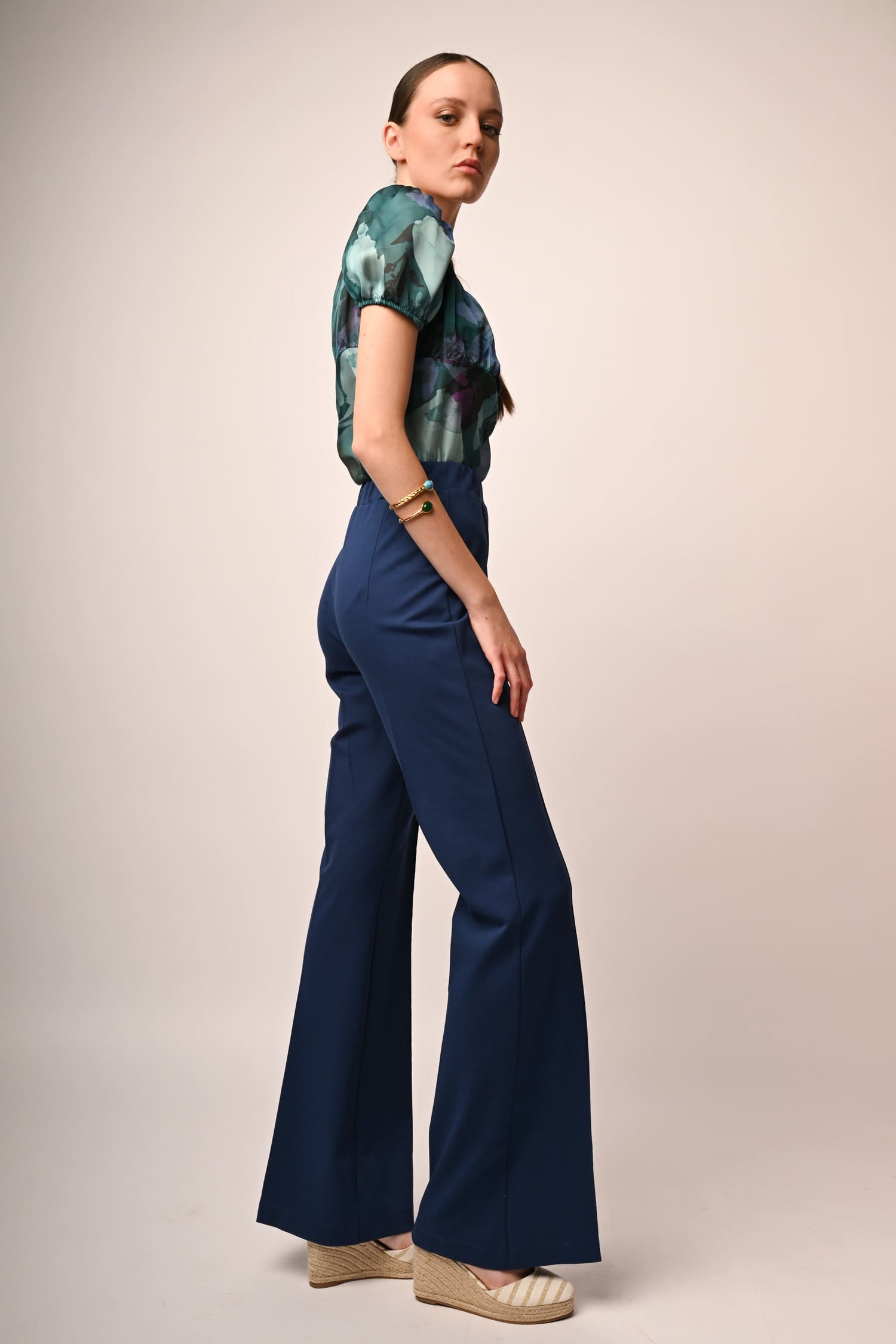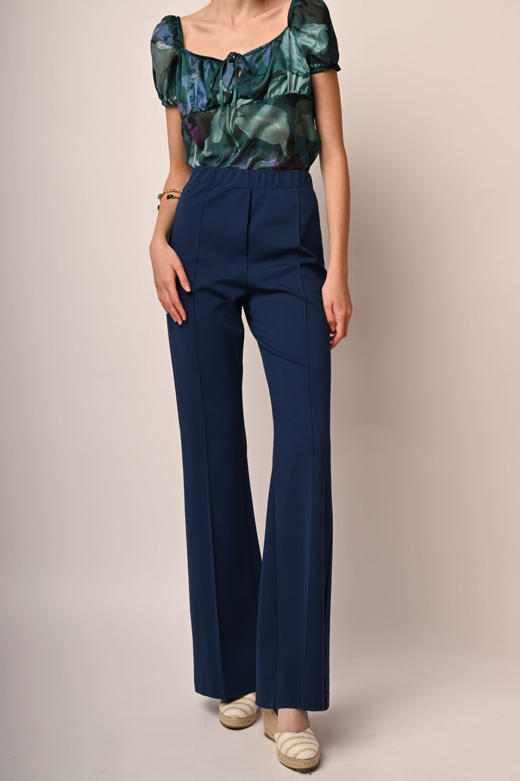 Pantaloni misto viscosa stretch blu con vita elasticizzata, gamba svasata e nervatura centrale.