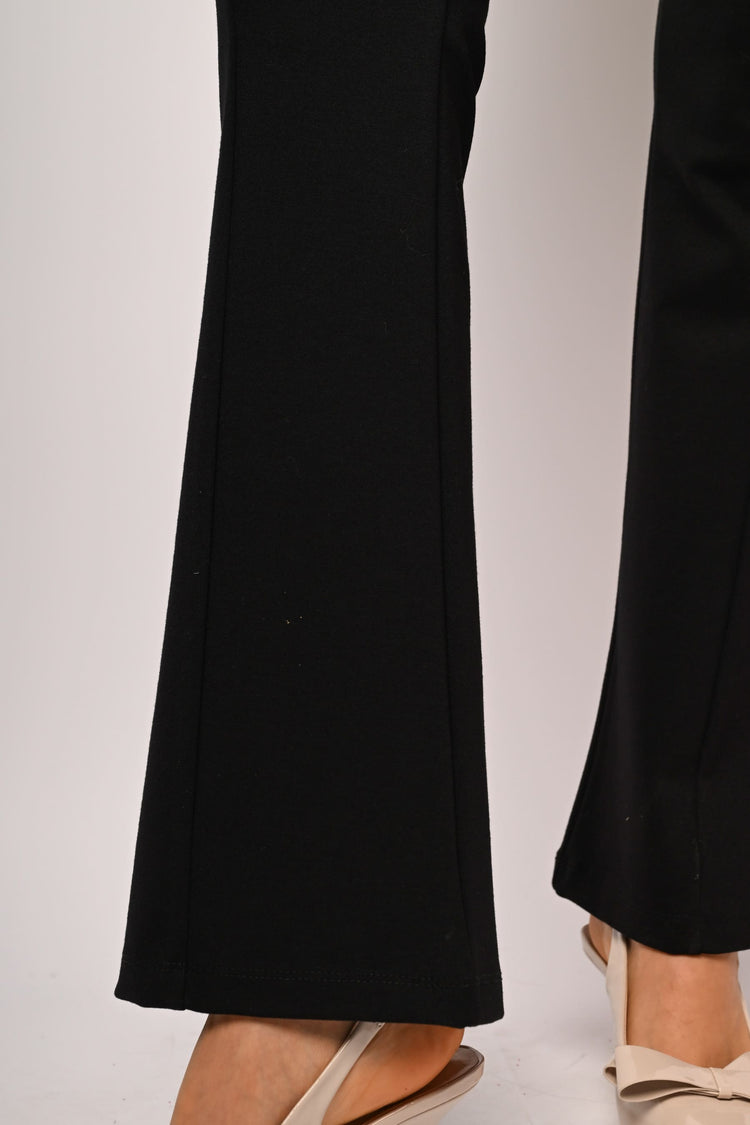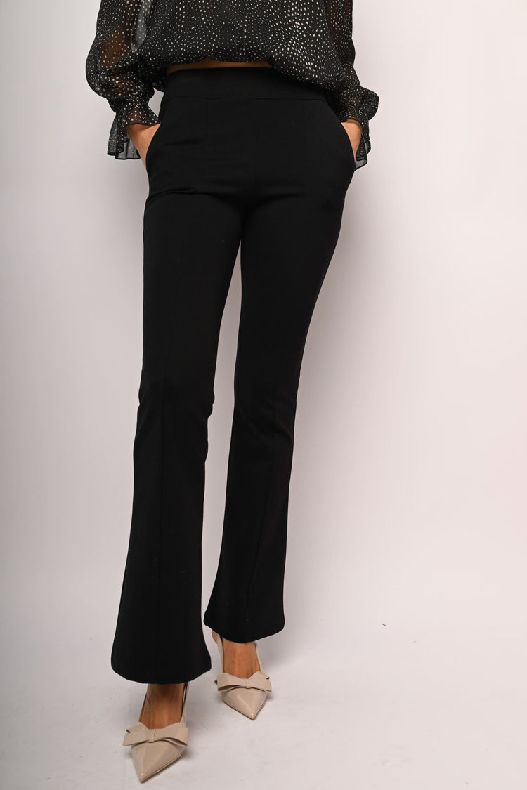 Pantaloni misto viscosa stretch nero con vita elasticizzata, tasche laterali e gamba svasata.