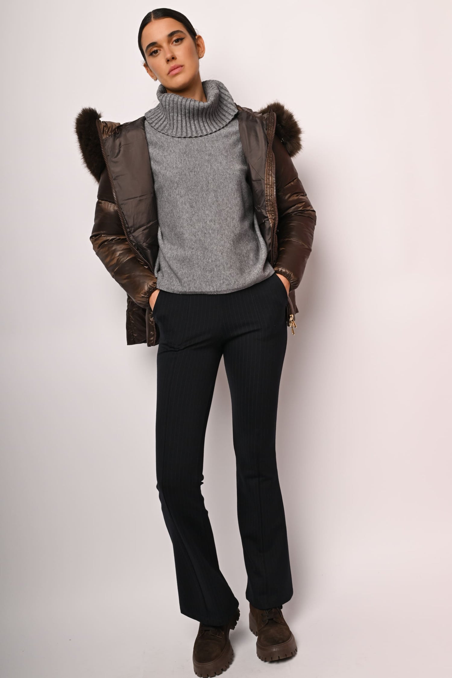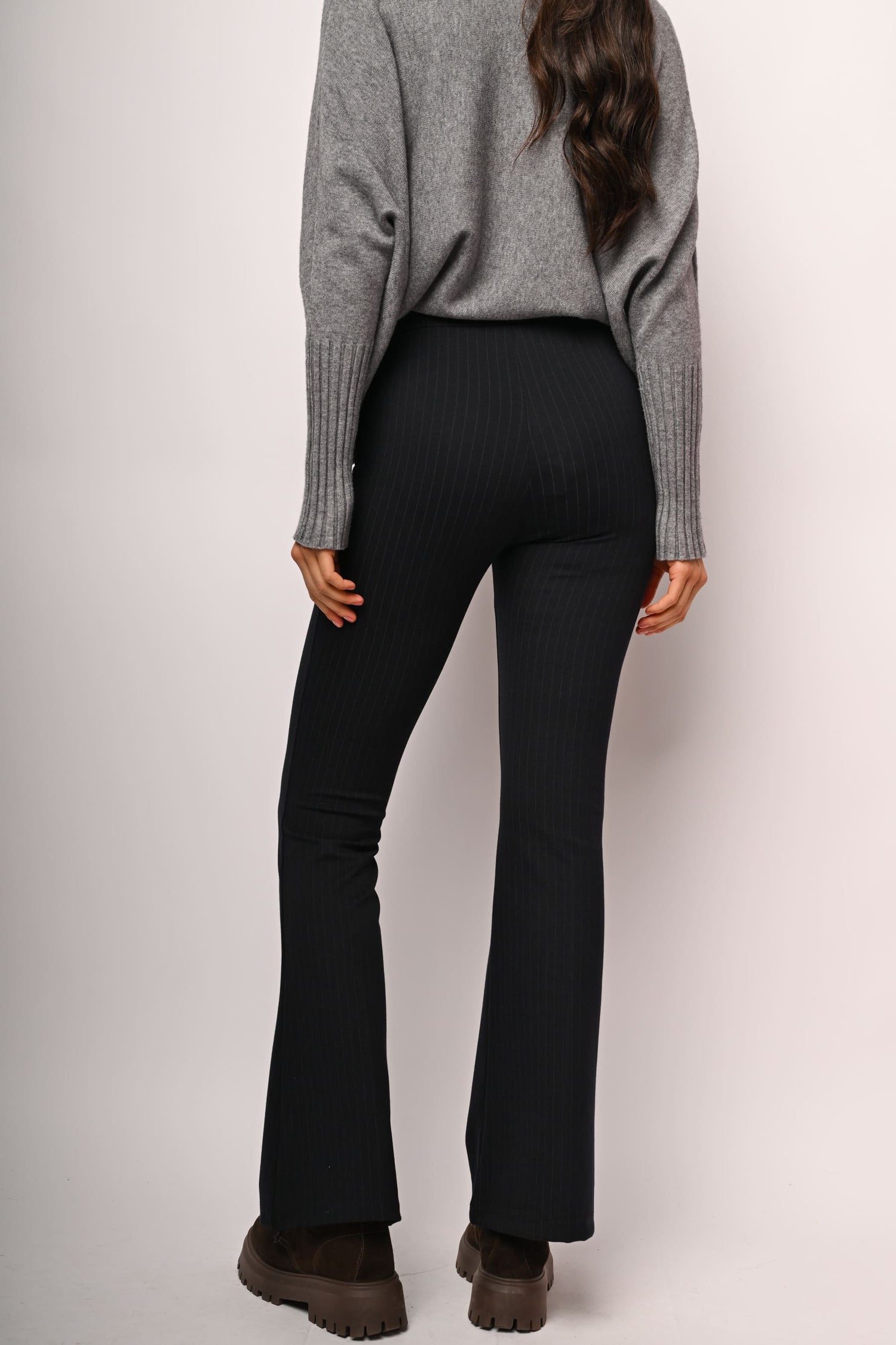 Pantaloni misto viscosa stretch con stampa gessata su fondo nero, vita elasticizzata, tasche laterali e gamba svasata.