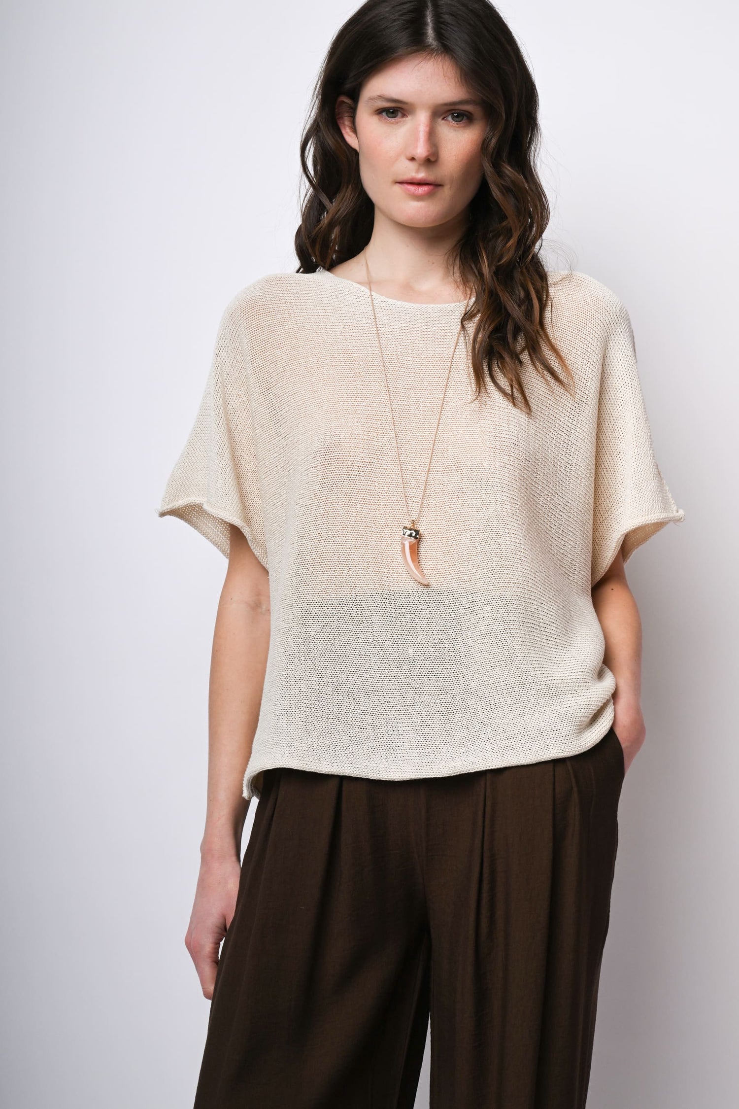 Pull in maglia misto cotone beige con scollo arrotondato a barchetta, maniche corte con taglio a kimono e orli arrotolati.