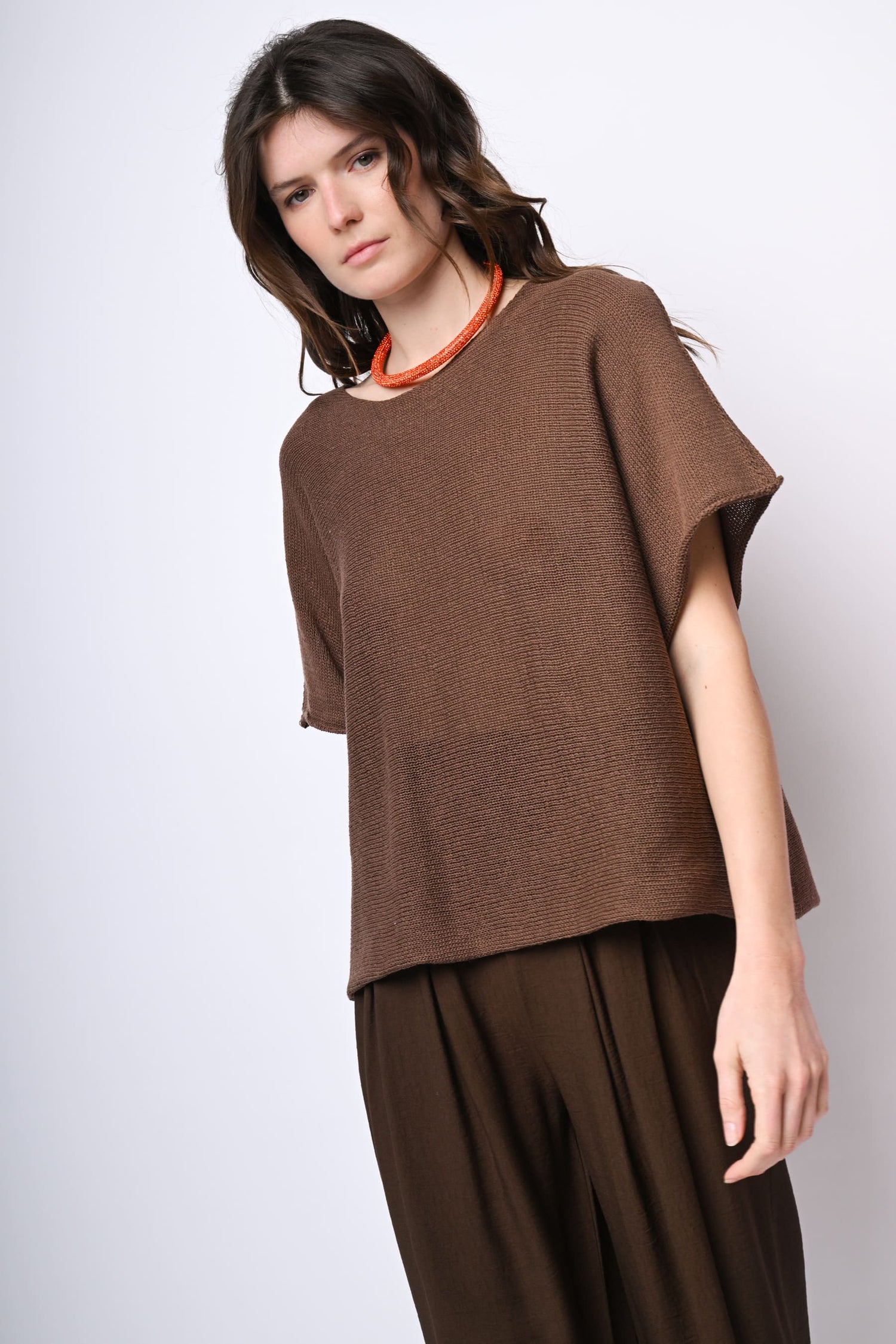 Pull in maglia misto cotone testa di moro con scollo arrotondato a barchetta, maniche corte con taglio a kimono e orli arrotolati.