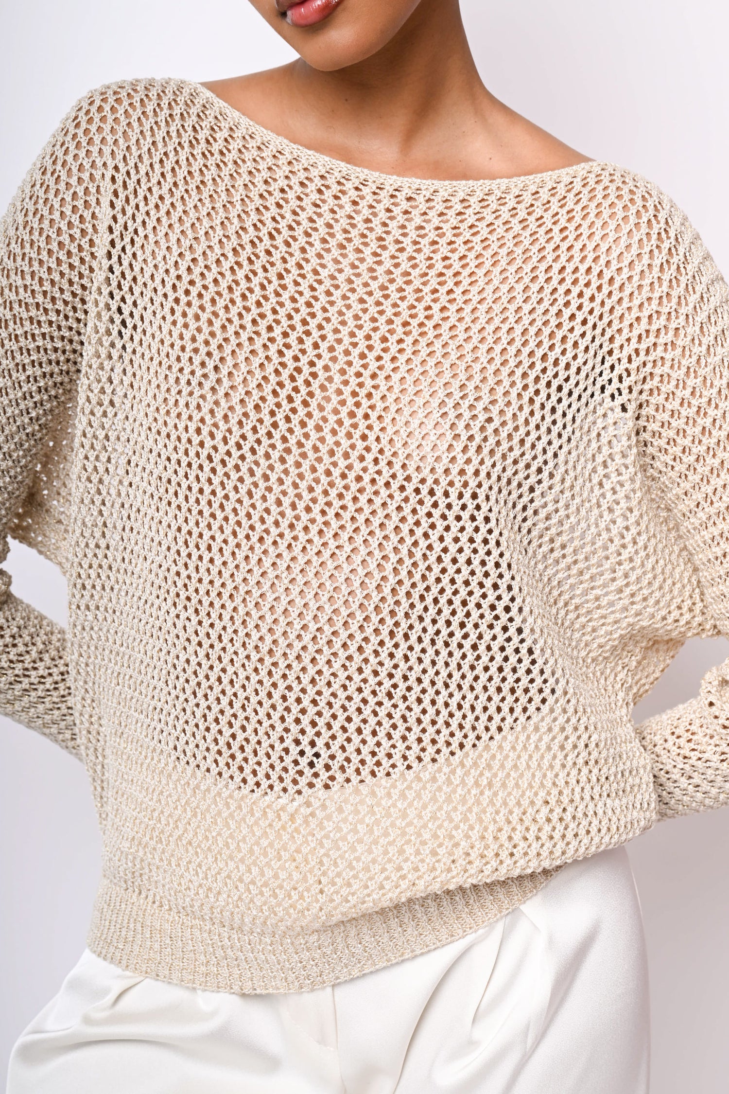 Pull in maglia crochet lurex a rete beige dorato con scollo a barchetta, maniche a pipistrello a lunghezza 7/8 e finiture a costine.