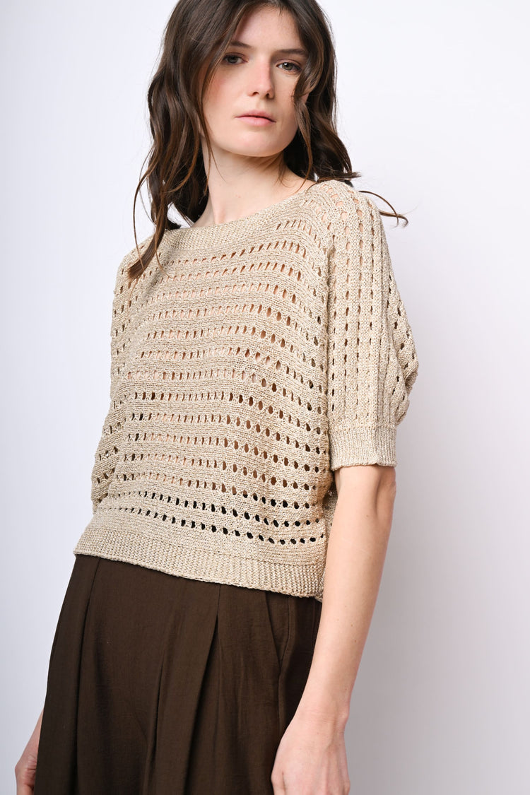 Pull in maglia crochet lurex misto viscosa beige con taglio boxy, scollo a barchetta, scollo a goccia sul retro con fiocco da annodare in raso, maniche corte e finiture a costine.